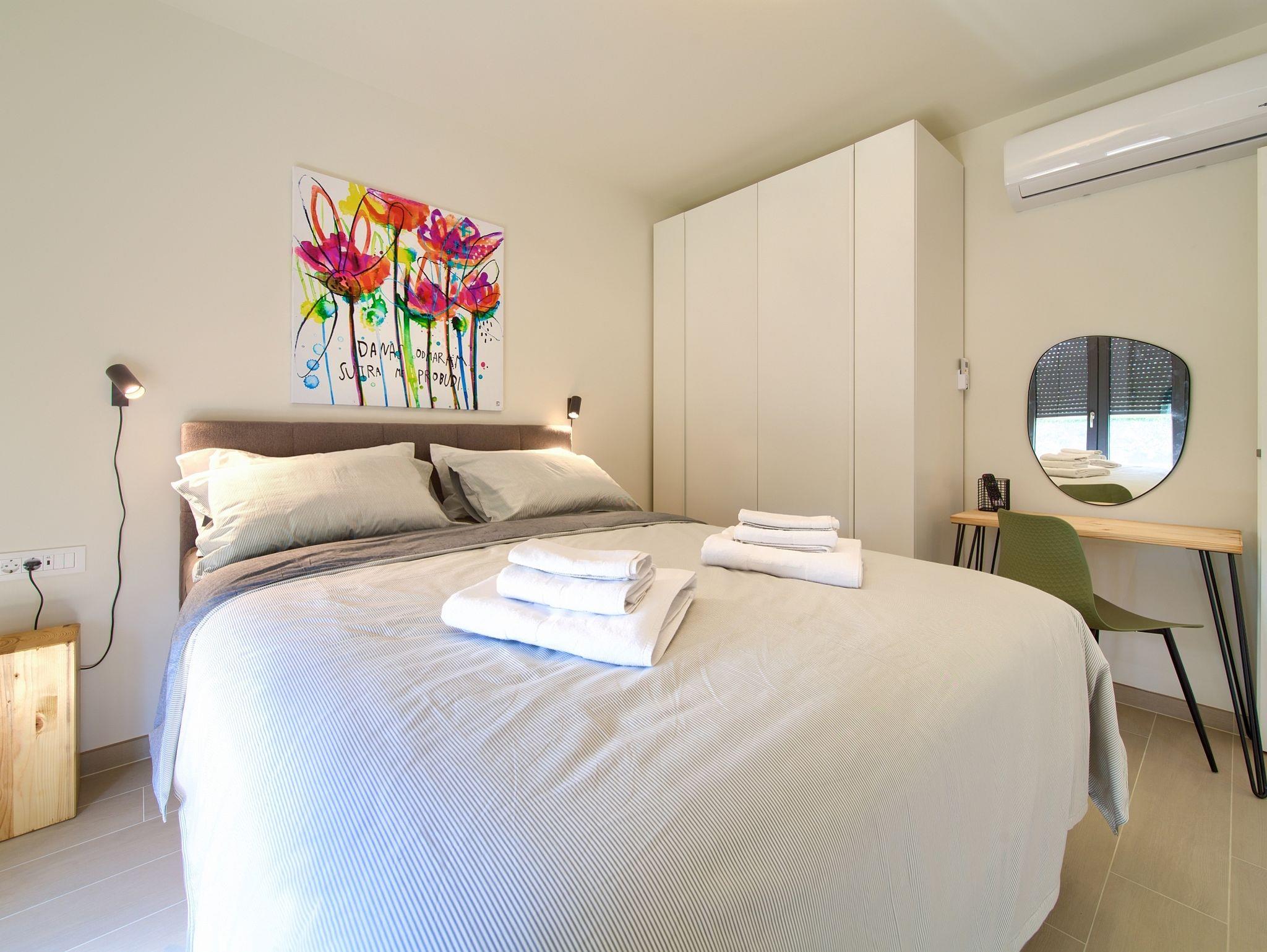 Ferienwohnung bietet Platz für 4 Gäste. Die Betten sind in Schlafzimmern, die es 2 gibt, innerhalb einer Gesamtfläche von 80m2, angeordnet. Die Gäste haben eine eigene Terrasse zur Verfügung, auf der sie in warmen Sommernächten genießen können. Es ist erlaubt, Speisen auf dem Gemeinschafts-Grill vorzubereiten. In der Unterkunftseinheit besteht die Möglichkeit des Mitbringens von Haustieren gegen Aufpreis. IM PREIS INBEGRIFFEN: Endreinigung, Klimatisierung, Parkplatz, Internet, Bügeleisen, Bügelbrett, Föhn, tragbarer Grill. VERBINDLICHE ZUSÄTZLICHE KOSTEN: Kurtaxe (Erwachsene 0,93 € - 2,50 € Nacht/Person, Kinderermäßigung 12 - 17 Jahre). UNVERBINDLICHE ZUSÄTZLICHE KOSTEN: Haustiere (10,00 € pro Nacht). Die Verfügbarkeit zusätzlicher Dienstleistungen in Ihrem reservierten Termin und die Preise derselben (falls nicht aufgeführt) müssen im Voraus überprüft werden. Zusätzliche Dienstleistungen die in der Zahlungsaufforderung nicht aufgeführt sind werden direkt beim Vermieter bezahlt, angenommen der Gast nutzt auch diese.