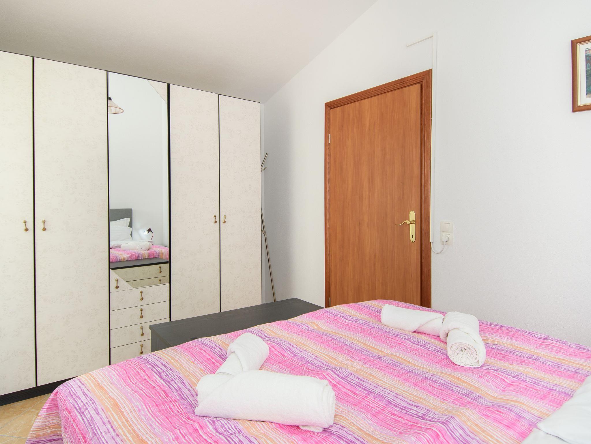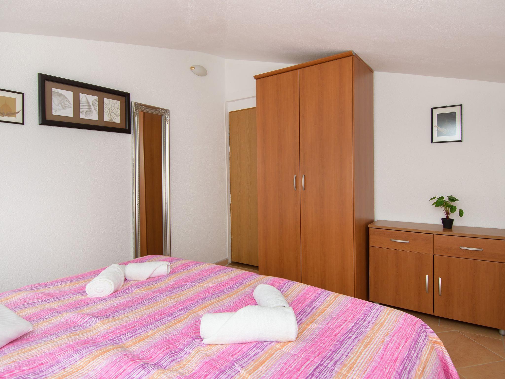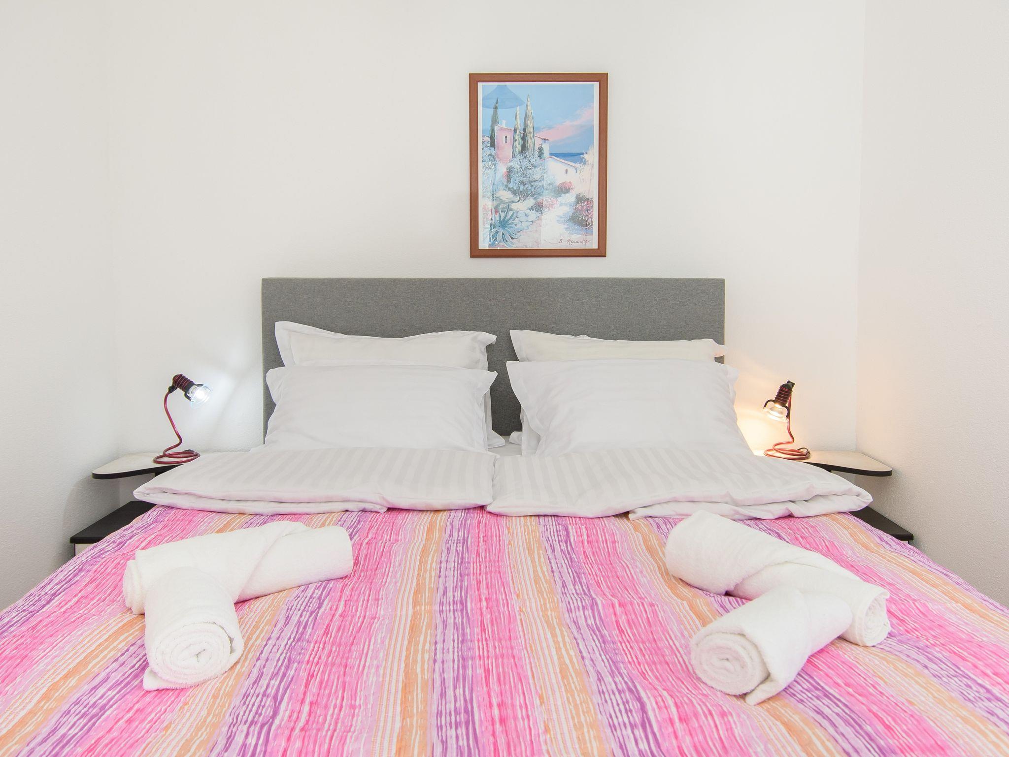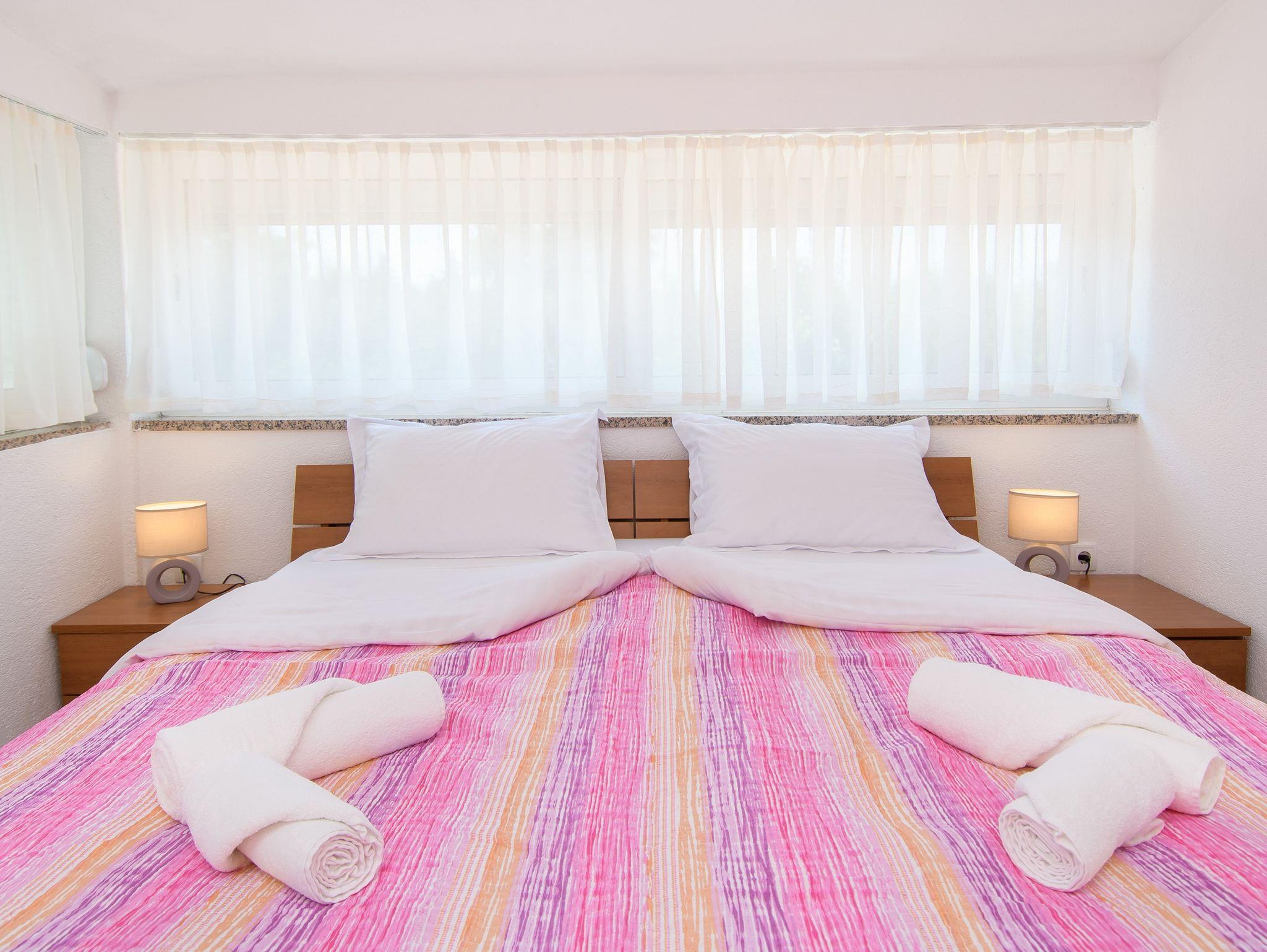 Ferienwohnung bietet Platz für 5 Gäste. Die Betten sind in Schlafzimmern, die es 2 gibt, und in Wohnzimmer, innerhalb einer Gesamtfläche von 46m2, angeordnet. Die Gäste haben eine eigene Terrasse zur Verfügung, auf der sie in warmen Sommernächten genießen können. Das Apartment bietet Meerblick. Es ist erlaubt, Speisen auf dem Gemeinschafts-Grill vorzubereiten. Während ihres Aufenthalts können Gäste das gemeinsam zur Nutzung stehende Schwimmbad benutzen. IM PREIS INBEGRIFFEN: Kurtaxe, Endreinigung, Klimatisierung, Zentralheizung, Pool, Parkplatz, Internet, Kinderbett, Zusatzbett, Föhn, tragbarer Grill, Sonnenschirm, Liegestühle. UNVERBINDLICHE ZUSÄTZLICHE KOSTEN: Wäschewaschen (2,00 € Waschen). Die Verfügbarkeit zusätzlicher Dienstleistungen in Ihrem reservierten Termin und die Preise derselben (falls nicht aufgeführt) müssen im Voraus überprüft werden. Zusätzliche Dienstleistungen die in der Zahlungsaufforderung nicht aufgeführt sind werden direkt beim Vermieter bezahlt, angenommen der Gast nutzt auch diese.