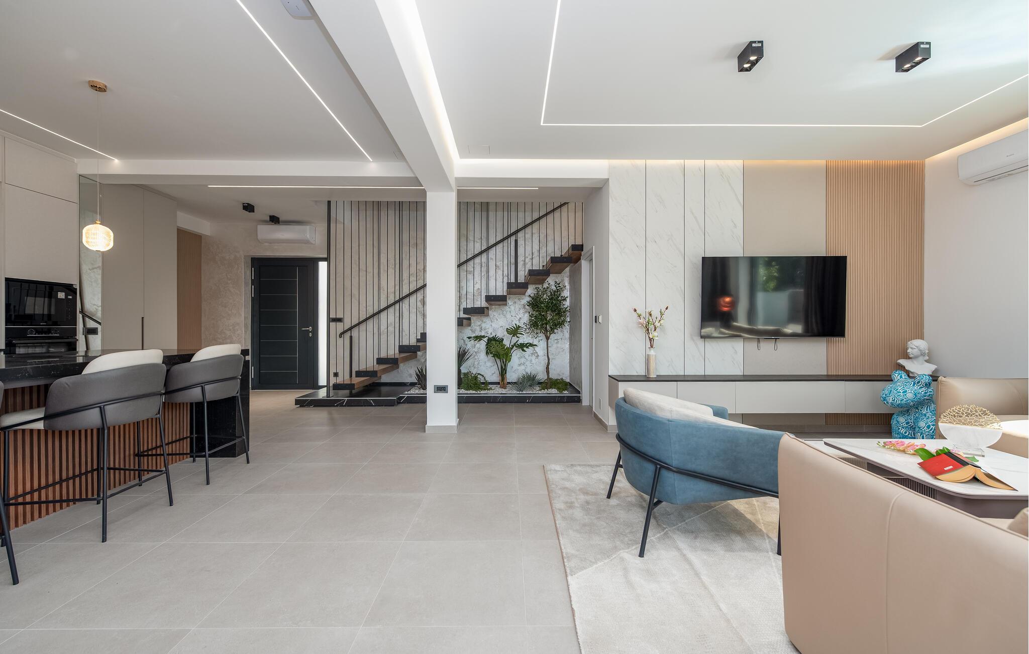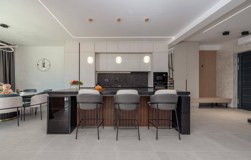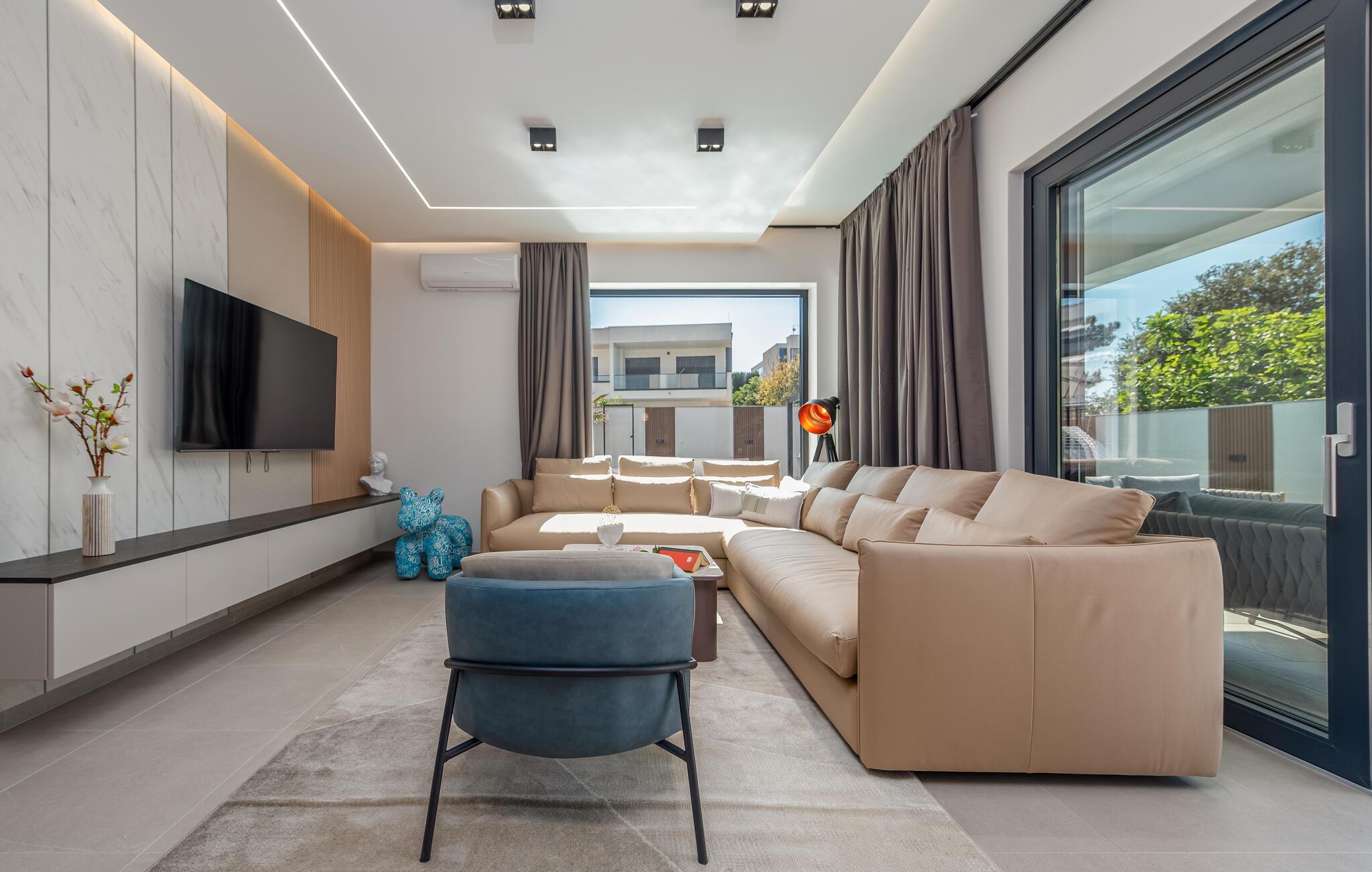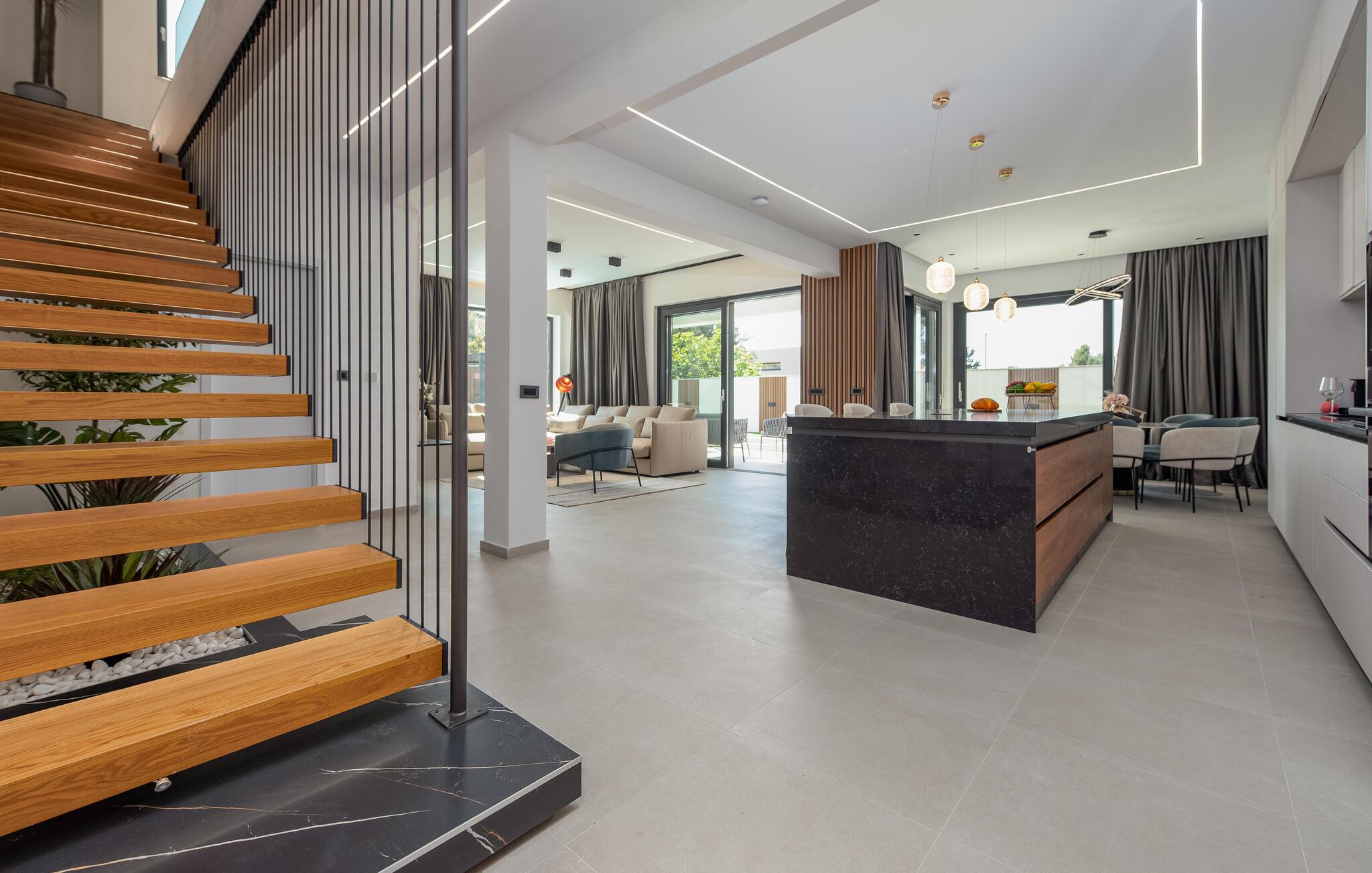 Velkommen i det rummelige og komfortable hus, hvor I kan føle jer hjemme fra første dag. Glæd jer til smagfuldt møblerede rum med moderne charme, nyd den flotte udsigt gennem gulv-til-loft-vinduerne allerede fra morgenstunden, og slap af på den store sofa.