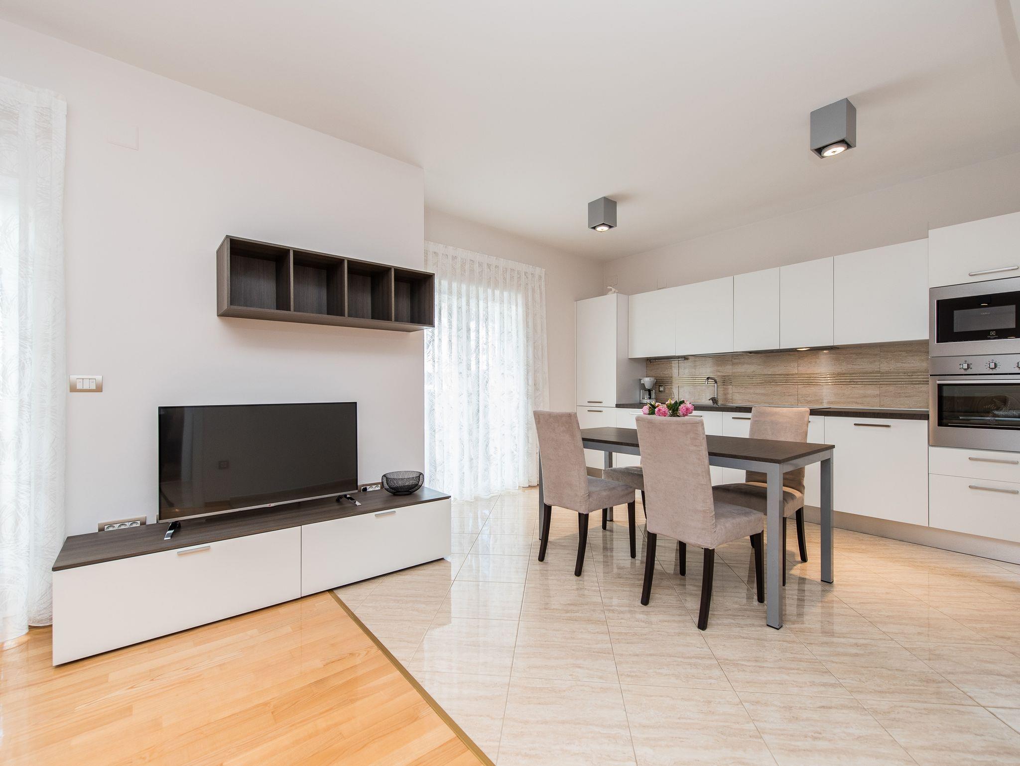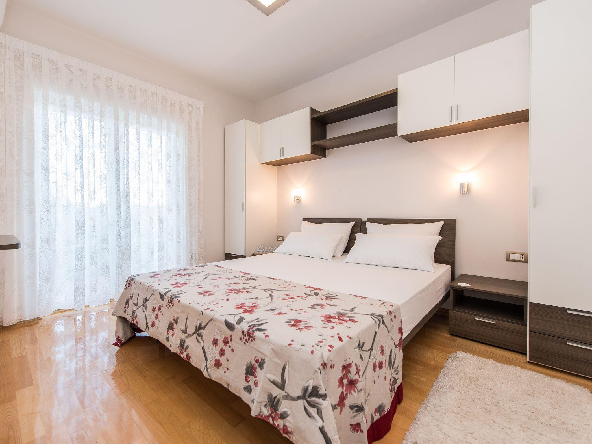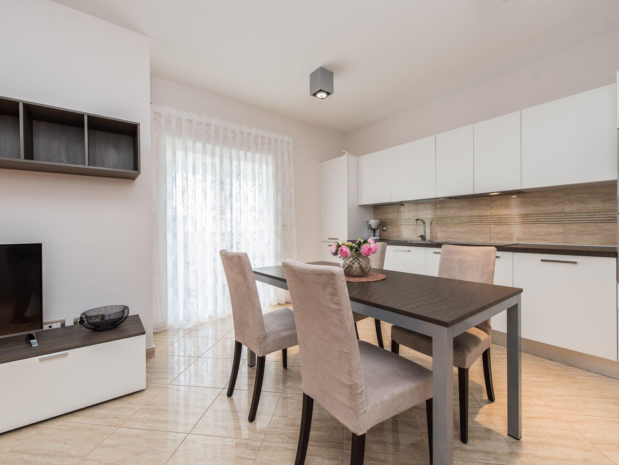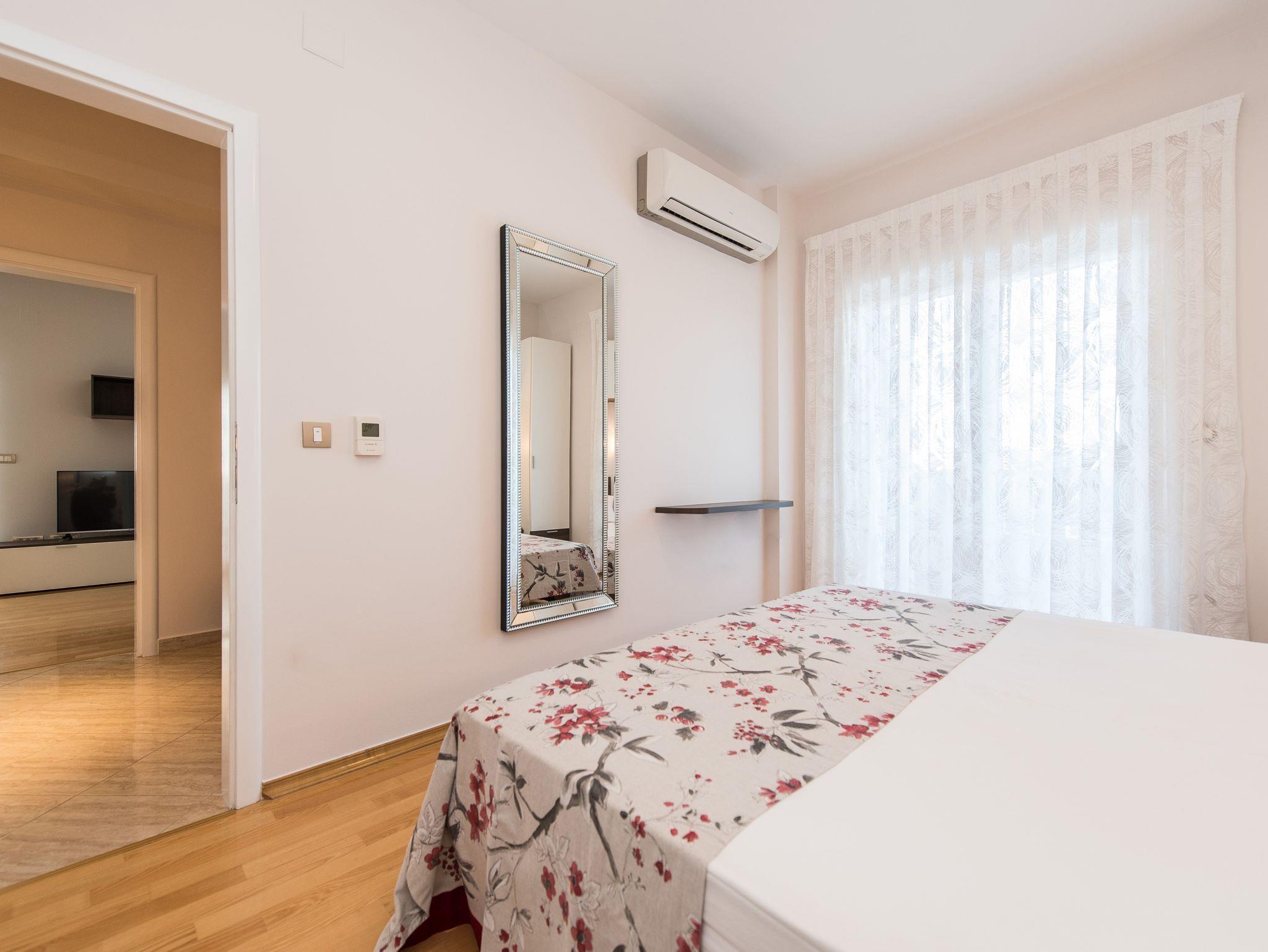 Ferienwohnung bietet Platz für 4 Gäste. Die Betten sind in Schlafzimmern, die es 1 gibt, und in Wohnzimmer, innerhalb einer Gesamtfläche von 63m2, angeordnet. Die Gäste haben eine eigene Terrasse zur Verfügung, auf der sie in warmen Sommernächten genießen können. Das Apartment bietet Meerblick. Es ist erlaubt, Speisen auf dem Gemeinschafts-Grill vorzubereiten. Während ihres Aufenthalts können Gäste das gemeinsam zur Nutzung stehende Schwimmbad benutzen. IM PREIS INBEGRIFFEN: Kurtaxe, Endreinigung, Klimatisierung, Pool, Parkplatz, Garage, Internet, Föhn. UNVERBINDLICHE ZUSÄTZLICHE KOSTEN: Wäschewaschen (10,00 € Waschen). Die Verfügbarkeit zusätzlicher Dienstleistungen in Ihrem reservierten Termin und die Preise derselben (falls nicht aufgeführt) müssen im Voraus überprüft werden. Zusätzliche Dienstleistungen die in der Zahlungsaufforderung nicht aufgeführt sind werden direkt beim Vermieter bezahlt, angenommen der Gast nutzt auch diese. Ermäßigung auf den Grundpreis: Gratistag 14=13 (bei einem Aufenthalt von 14 Tagen oder mehr erhalten Sie einen Gratistag für den Aufenthalt bis 31.12.26).