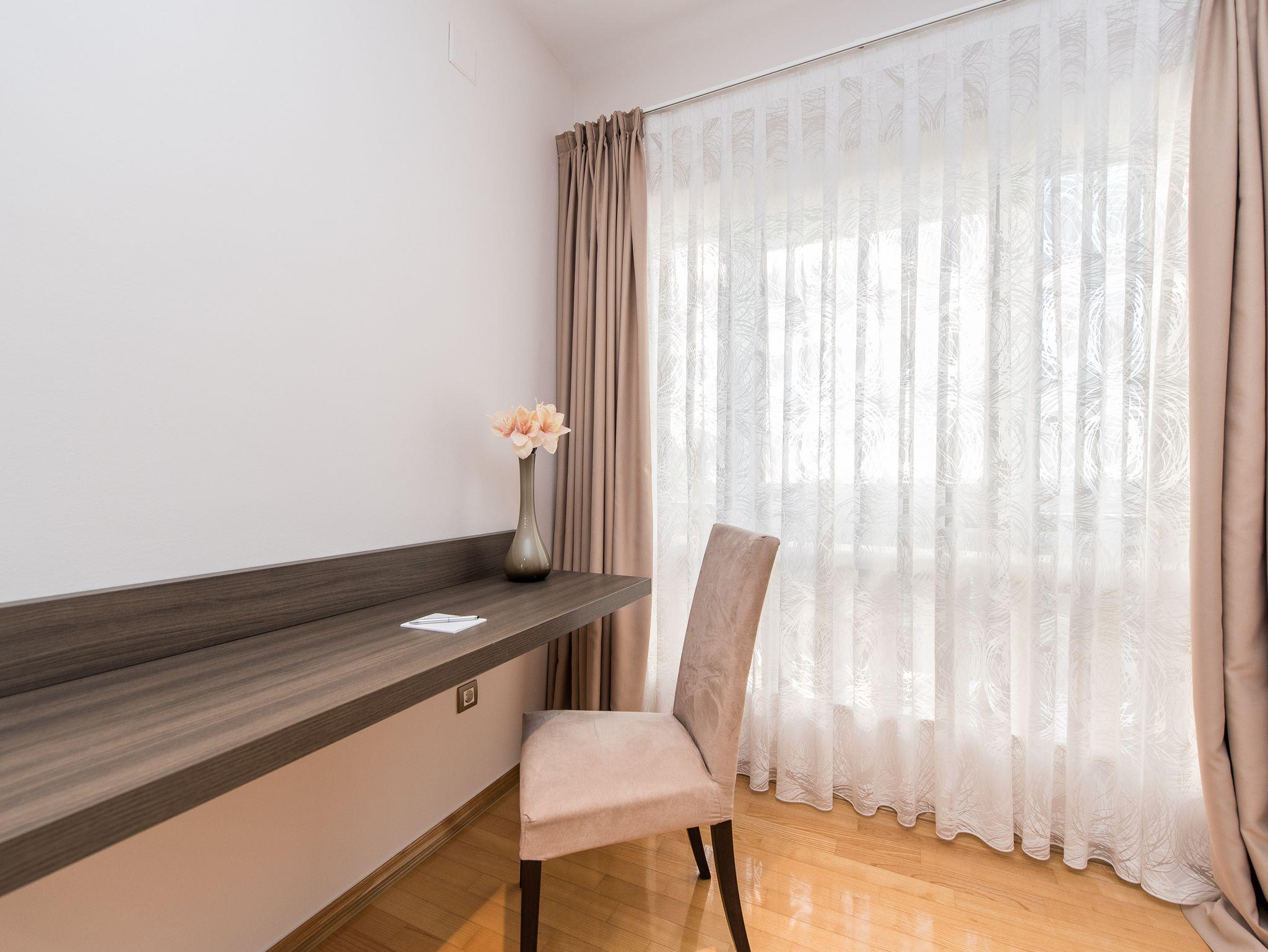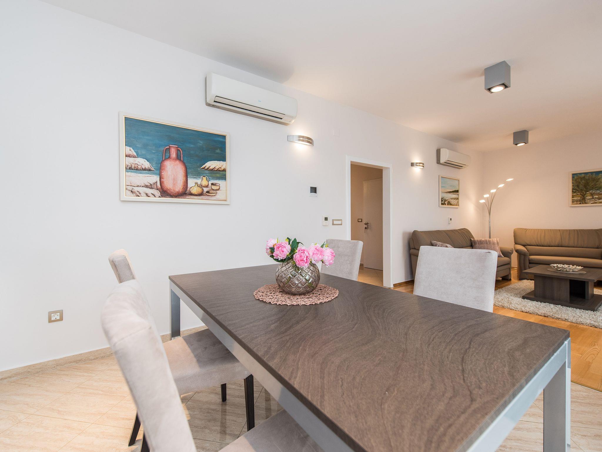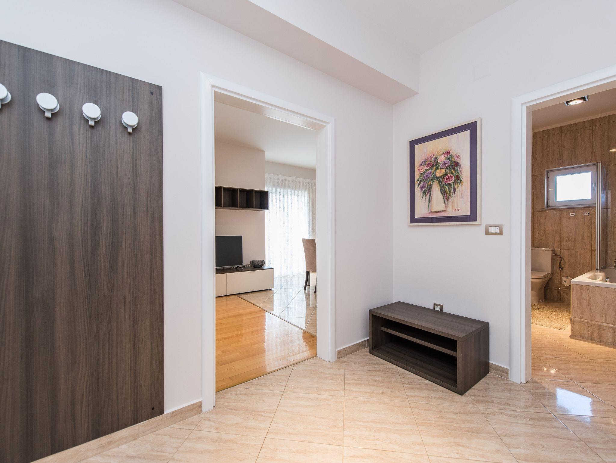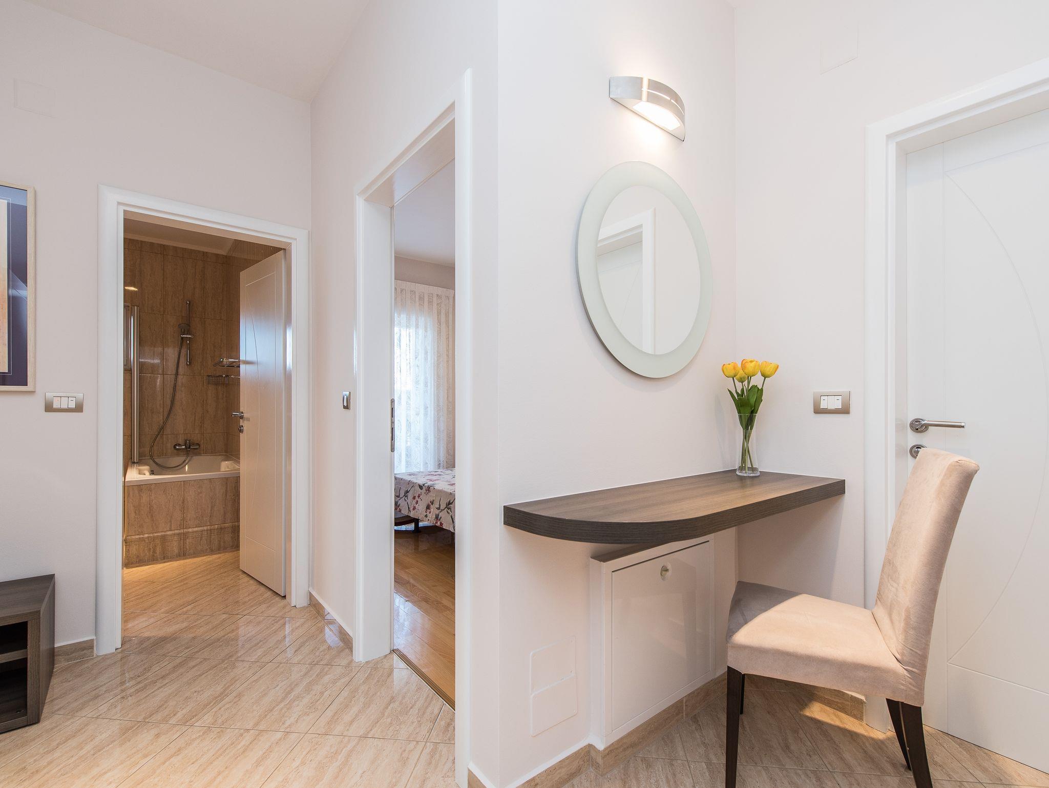 Ferienwohnung bietet Platz für 4 Gäste. Die Betten sind in Schlafzimmern, die es 1 gibt, und in Wohnzimmer, innerhalb einer Gesamtfläche von 63m2, angeordnet. Die Gäste haben eine eigene Terrasse zur Verfügung, auf der sie in warmen Sommernächten genießen können. Das Apartment bietet Meerblick. Es ist erlaubt, Speisen auf dem Gemeinschafts-Grill vorzubereiten. Während ihres Aufenthalts können Gäste das gemeinsam zur Nutzung stehende Schwimmbad benutzen. IM PREIS INBEGRIFFEN: Kurtaxe, Endreinigung, Klimatisierung, Pool, Parkplatz, Garage, Internet, Föhn. UNVERBINDLICHE ZUSÄTZLICHE KOSTEN: Wäschewaschen (10,00 € Waschen). Die Verfügbarkeit zusätzlicher Dienstleistungen in Ihrem reservierten Termin und die Preise derselben (falls nicht aufgeführt) müssen im Voraus überprüft werden. Zusätzliche Dienstleistungen die in der Zahlungsaufforderung nicht aufgeführt sind werden direkt beim Vermieter bezahlt, angenommen der Gast nutzt auch diese. Ermäßigung auf den Grundpreis: Gratistag 14=13 (bei einem Aufenthalt von 14 Tagen oder mehr erhalten Sie einen Gratistag für den Aufenthalt bis 31.12.26).