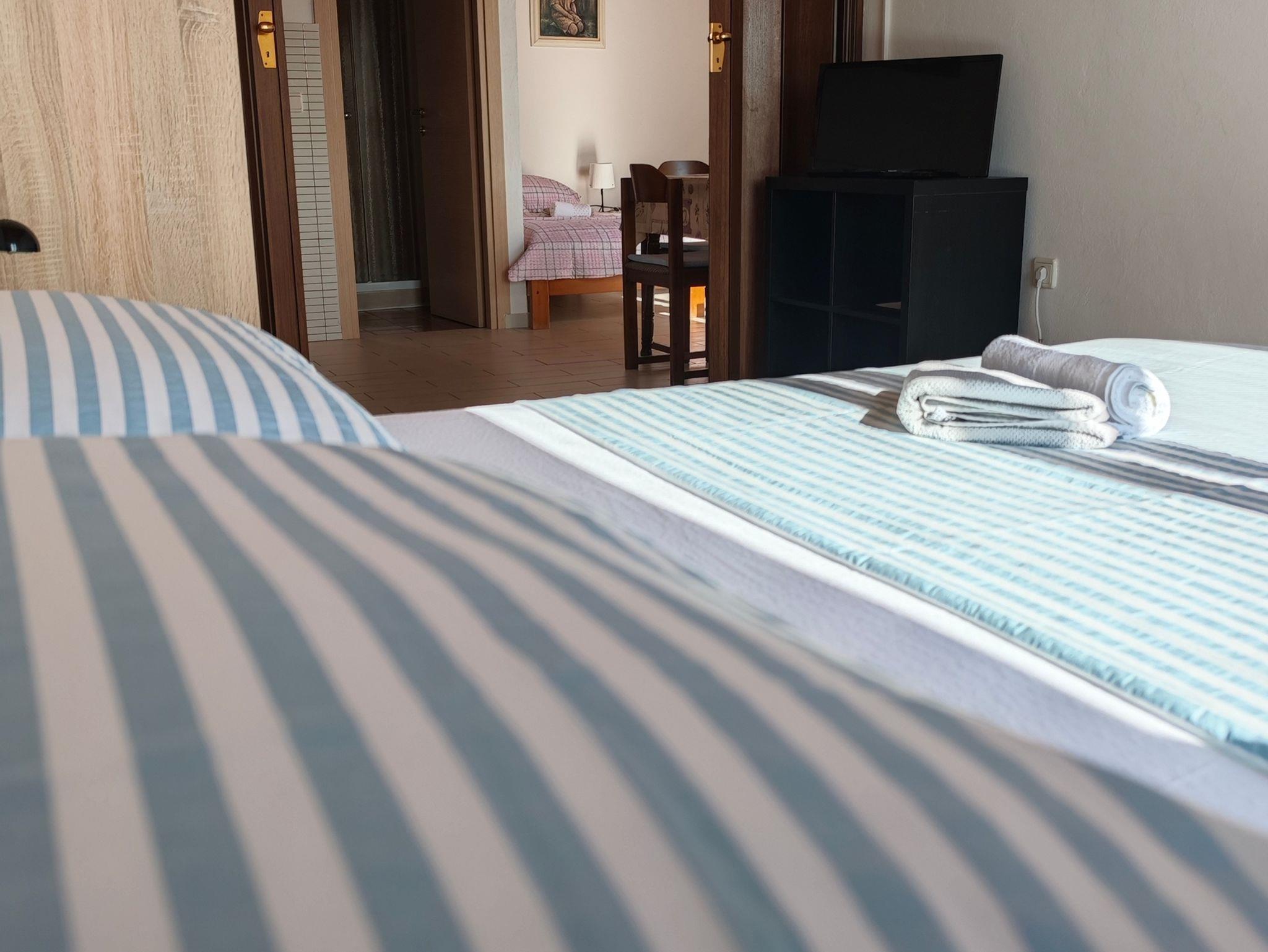 Studio bietet Platz für 4 Gäste. Die Betten sind in Schlafzimmern, die es 1 gibt, und in Esszimmer, innerhalb einer Gesamtfläche von 30m2, angeordnet. Die Gäste haben einen eigenen Balkon zur Verfügung, auf der sie in warmen Sommernächten genießen können. Das Studio-Apartment bietet Meerblick. Es ist erlaubt, Speisen auf dem Gemeinschafts-Grill vorzubereiten. IM PREIS INBEGRIFFEN: Kurtaxe, Endreinigung, Klimatisierung, Parkplatz, Internet, Liegestühle. VERBINDLICHE ZUSÄTZLICHE KOSTEN: Aufzahlung für Kurzaufenthalte (prozentualer Zuschlag pro Nächtigungsanzahl: 30% - 1, 20% - 2, 10% - 3). Die Verfügbarkeit zusätzlicher Dienstleistungen in Ihrem reservierten Termin und die Preise derselben (falls nicht aufgeführt) müssen im Voraus überprüft werden. Zusätzliche Dienstleistungen die in der Zahlungsaufforderung nicht aufgeführt sind werden direkt beim Vermieter bezahlt, angenommen der Gast nutzt auch diese.