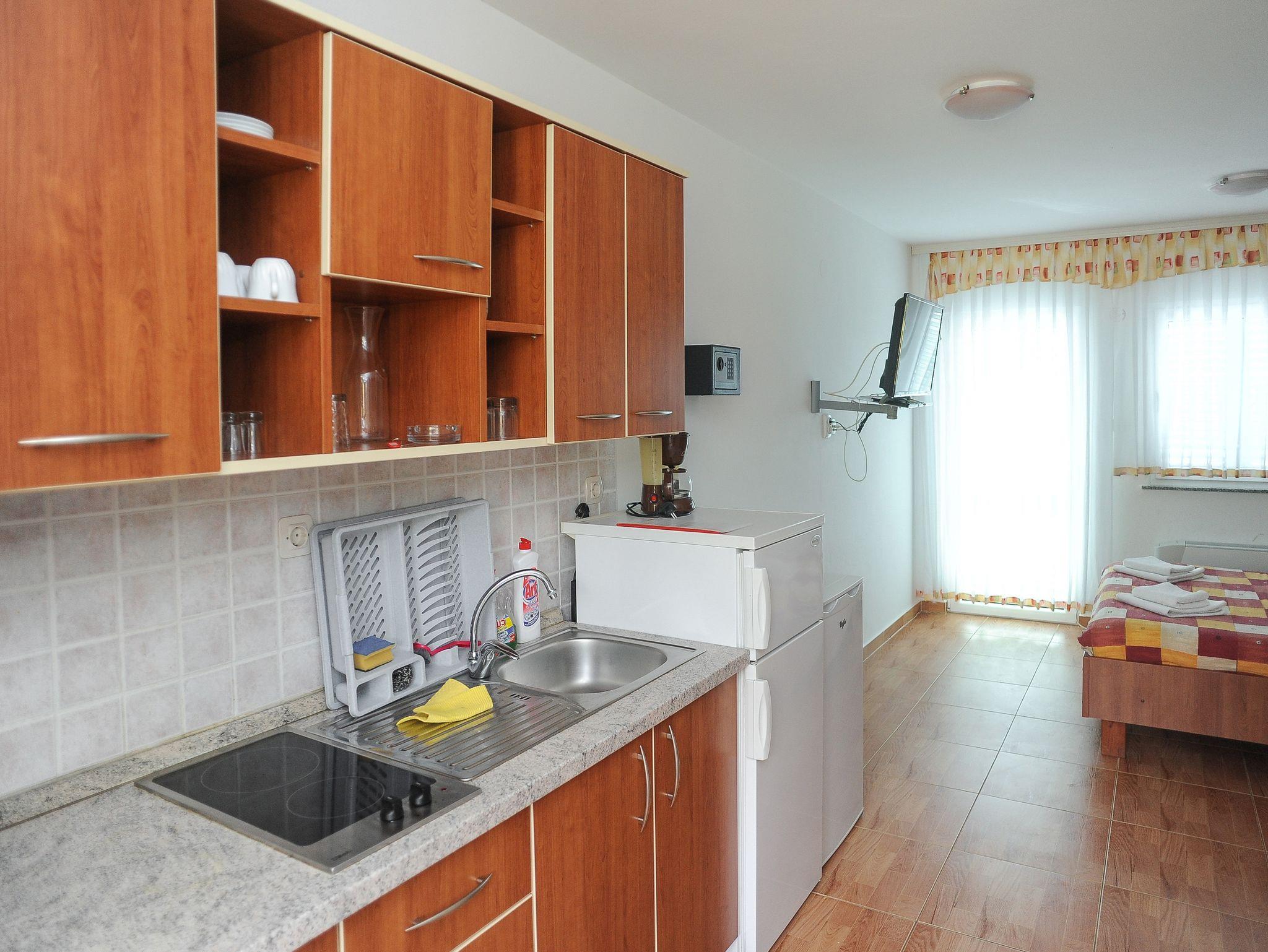 Studio bietet Platz für 2 Gäste. Die Betten sind in Schlafzimmern, die es 1 gibt, innerhalb einer Gesamtfläche von 19m2, angeordnet. Die Gäste haben eine eigene Terrasse zur Verfügung, auf der sie in warmen Sommernächten genießen können. Das Studio-Apartment bietet Meerblick. Während ihres Aufenthalts können Gäste das gemeinsam zur Nutzung stehende Schwimmbad benutzen. IM PREIS INBEGRIFFEN: Endreinigung, Klimatisierung, Pool, Parkplatz, Internet, Föhn. VERBINDLICHE ZUSÄTZLICHE KOSTEN: Kurtaxe (Erwachsene 0,93 € - 1,60 € Nacht/Person, Kinderermäßigung 12 - 17 Jahre), Aufzahlung für Kurzaufenthalte (prozentualer Zuschlag pro Nächtigungsanzahl: 30% - 1, 20% - 2, 10% - 3). UNVERBINDLICHE ZUSÄTZLICHE KOSTEN: Frühstück (10,00 €, 50% Nachlass für Kinder zwischen 4 und 12 Jahren, Kinder bis 4 Jahre sind frei.), Halbpension (30,00 €, 50% Nachlass für Kinder zwischen 4 und 12 Jahren, Kinder bis 4 Jahre sind frei.), Wäschewaschen (20,00 € Waschen), Zusatzbett (15,00 € pro Nacht). Die Verfügbarkeit zusätzlicher Dienstleistungen in Ihrem reservierten Termin und die Preise derselben (falls nicht aufgeführt) müssen im Voraus überprüft werden. Zusätzliche Dienstleistungen die in der Zahlungsaufforderung nicht aufgeführt sind werden direkt beim Vermieter bezahlt, angenommen der Gast nutzt auch diese. Ermäßigung auf den Grundpreis: Gratistag 28=25 (bei einem Aufenthalt von 28 oder mehr Tagen erhalten Sie 3 kostenlose Tage für den Aufenthalt bis 31.12.26).