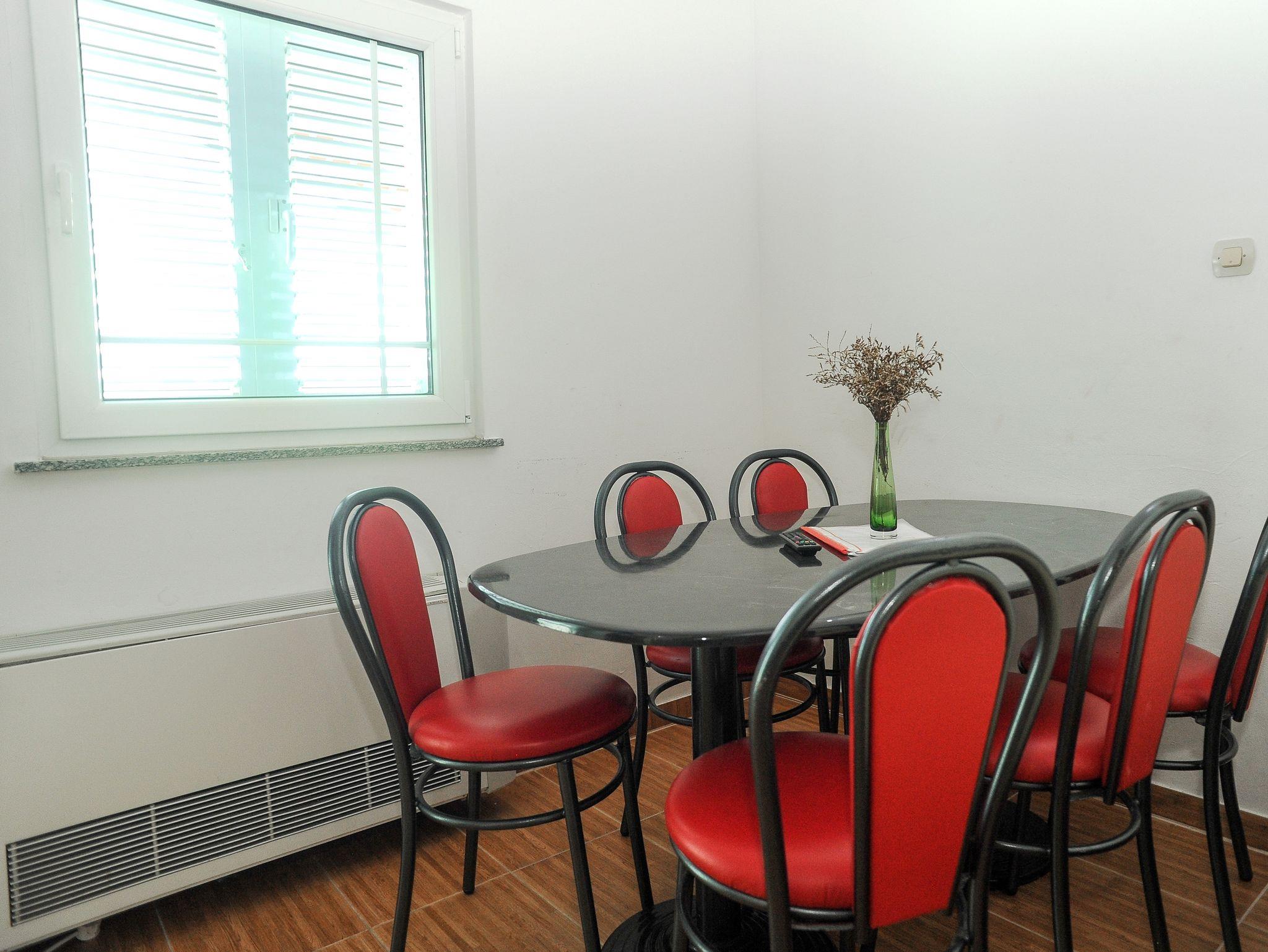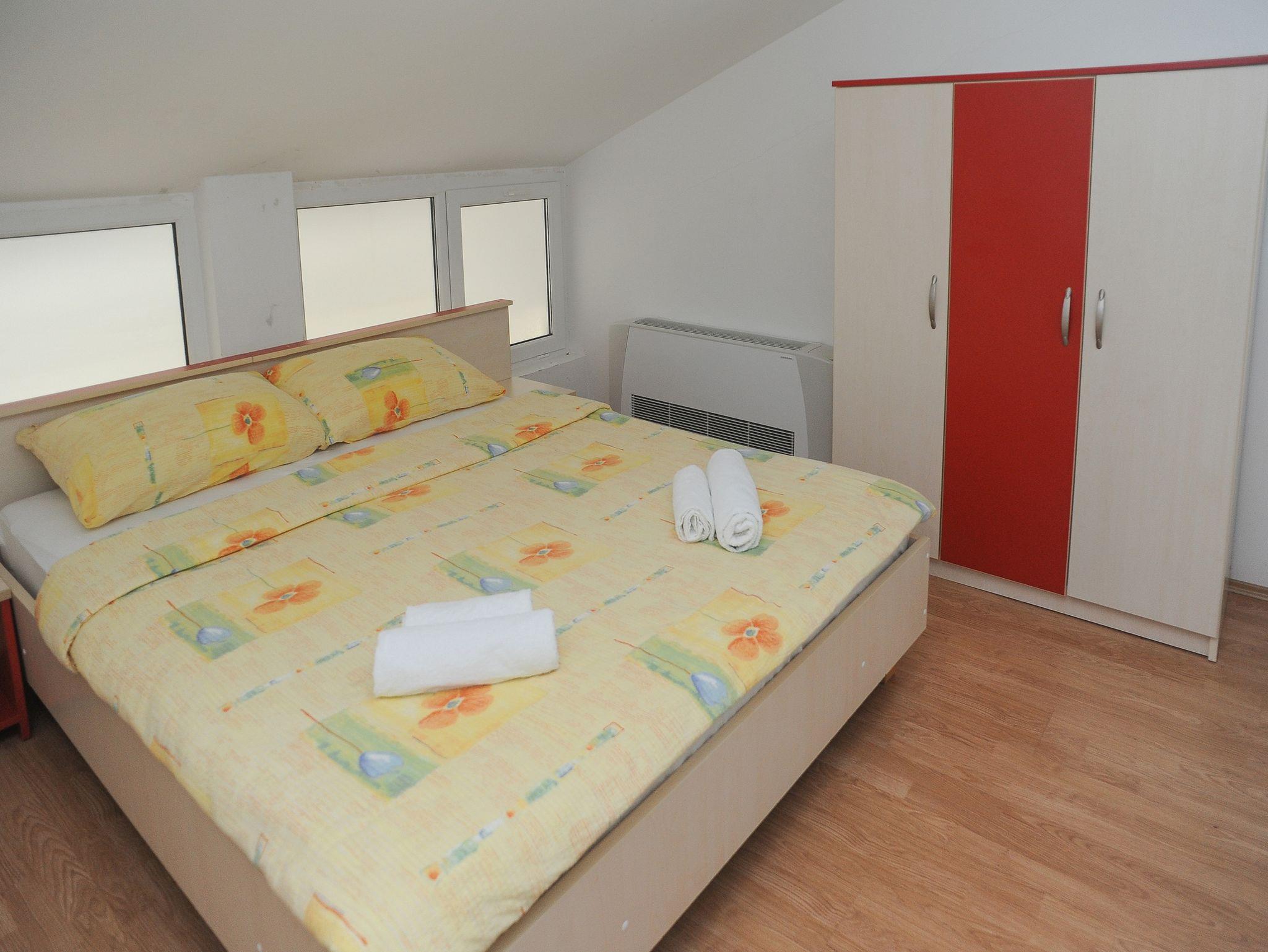 Ferienwohnung bietet Platz für 6 Gäste. Die Betten sind in Schlafzimmern, die es 2 gibt, und in Esszimmer, innerhalb einer Gesamtfläche von 44m2, angeordnet. Die Gäste haben eine eigene Terrasse zur Verfügung, auf der sie in warmen Sommernächten genießen können. Das Apartment bietet Meerblick. Während ihres Aufenthalts können Gäste das gemeinsam zur Nutzung stehende Schwimmbad benutzen. IM PREIS INBEGRIFFEN: Endreinigung, Klimatisierung, Pool, Parkplatz, Internet, Föhn. VERBINDLICHE ZUSÄTZLICHE KOSTEN: Kurtaxe (Erwachsene 0,93 € - 1,60 € Nacht/Person, Kinderermäßigung 12 - 17 Jahre), Aufzahlung für Kurzaufenthalte (prozentualer Zuschlag pro Nächtigungsanzahl: 30% - 1, 20% - 2, 10% - 3). UNVERBINDLICHE ZUSÄTZLICHE KOSTEN: Frühstück (10,00 €, 50% Nachlass für Kinder zwischen 4 und 12 Jahren, Kinder bis 4 Jahre sind frei.), Halbpension (30,00 €, 50% Nachlass für Kinder zwischen 4 und 12 Jahren, Kinder bis 4 Jahre sind frei.), Wäschewaschen (20,00 € Waschen), Zusatzbett (15,00 € pro Nacht). Die Verfügbarkeit zusätzlicher Dienstleistungen in Ihrem reservierten Termin und die Preise derselben (falls nicht aufgeführt) müssen im Voraus überprüft werden. Zusätzliche Dienstleistungen die in der Zahlungsaufforderung nicht aufgeführt sind werden direkt beim Vermieter bezahlt, angenommen der Gast nutzt auch diese. Ermäßigung auf den Grundpreis: Gratistag 21=19 (bei einem Aufenthalt von 21 Tagen oder mehr erhalten Sie 2 Gratistage für den Aufenthalt bis 31.12.26).