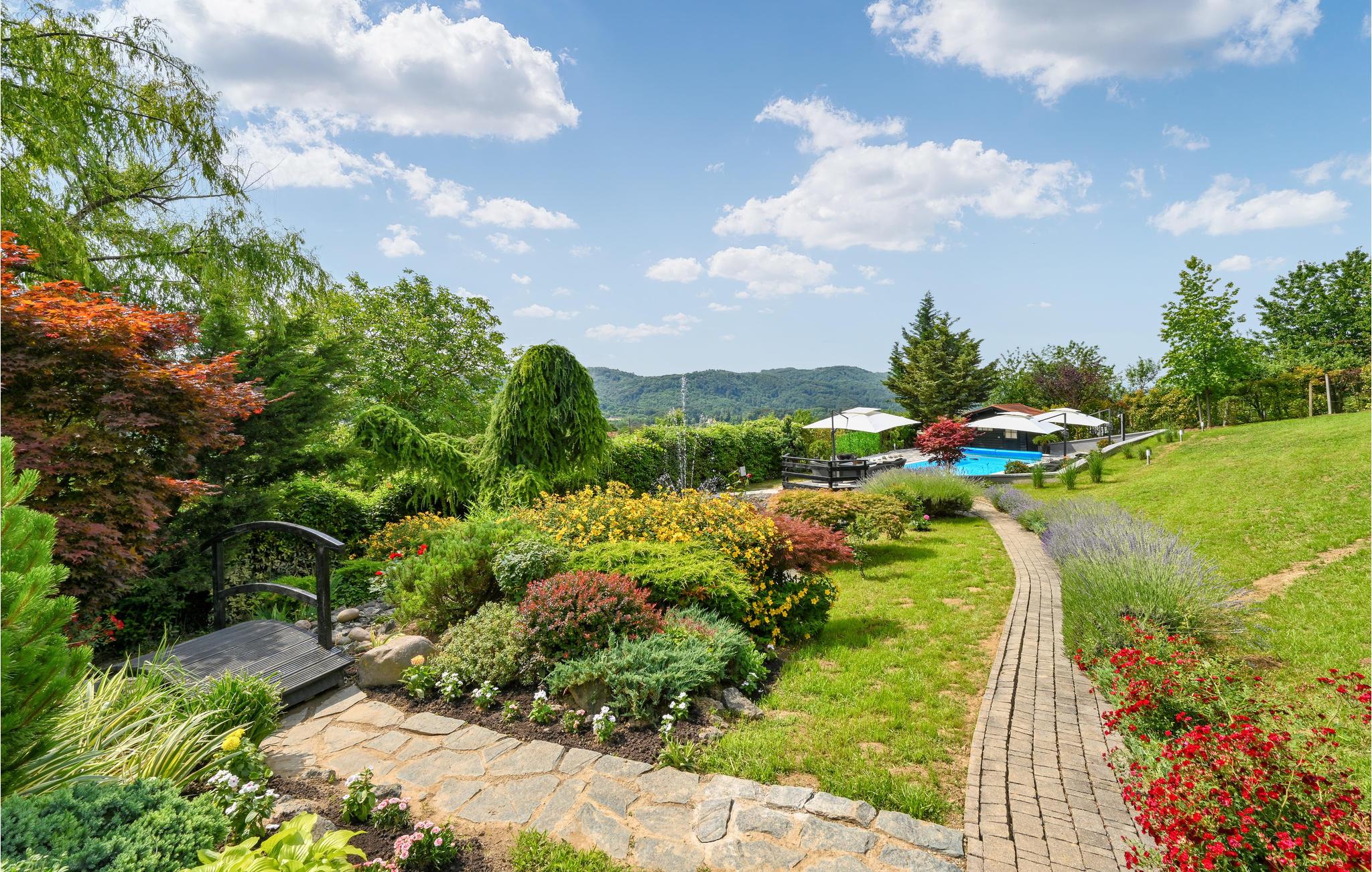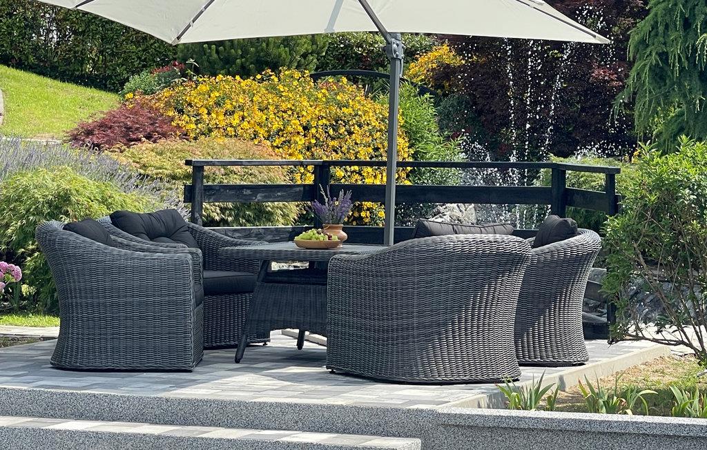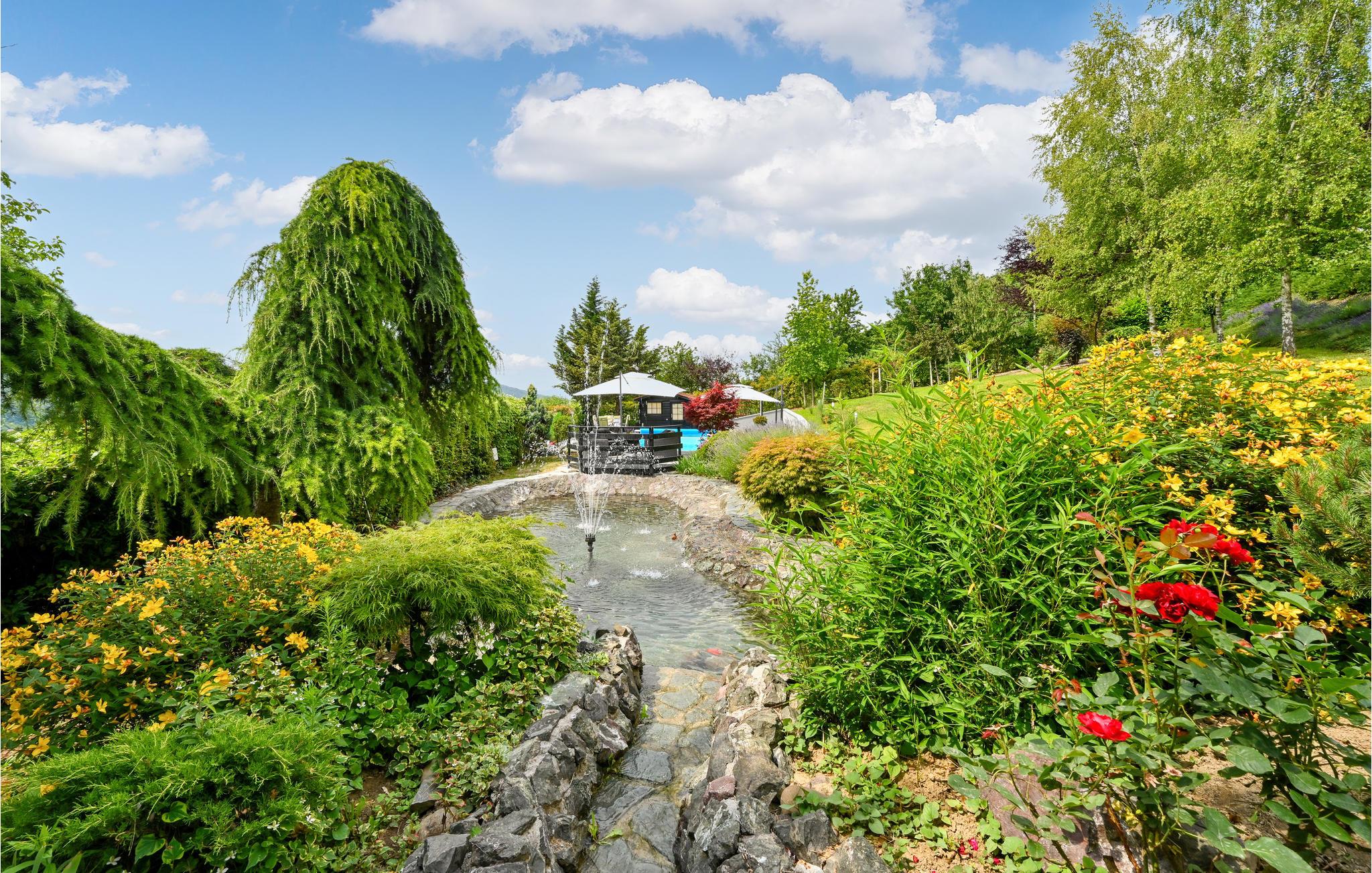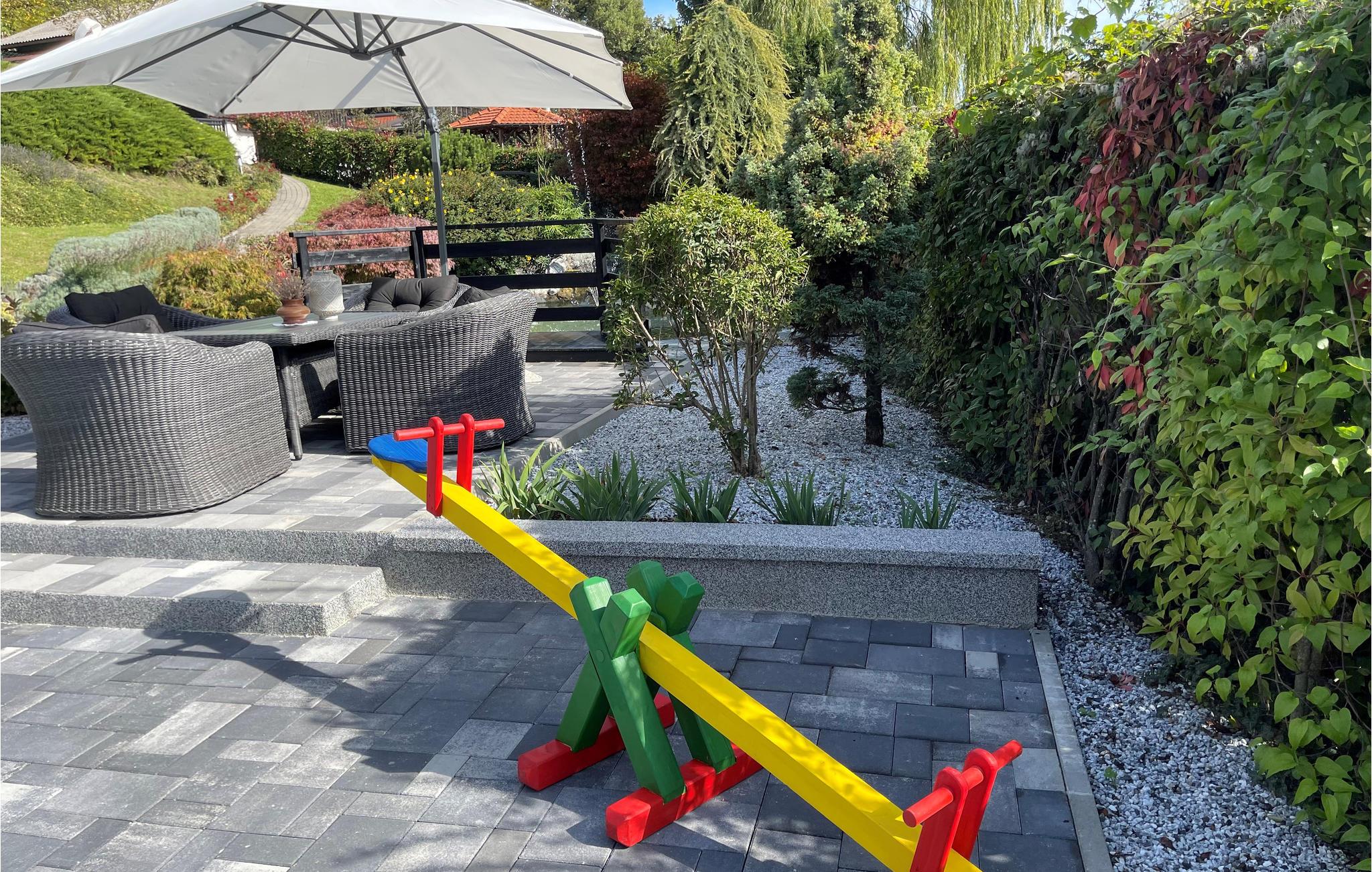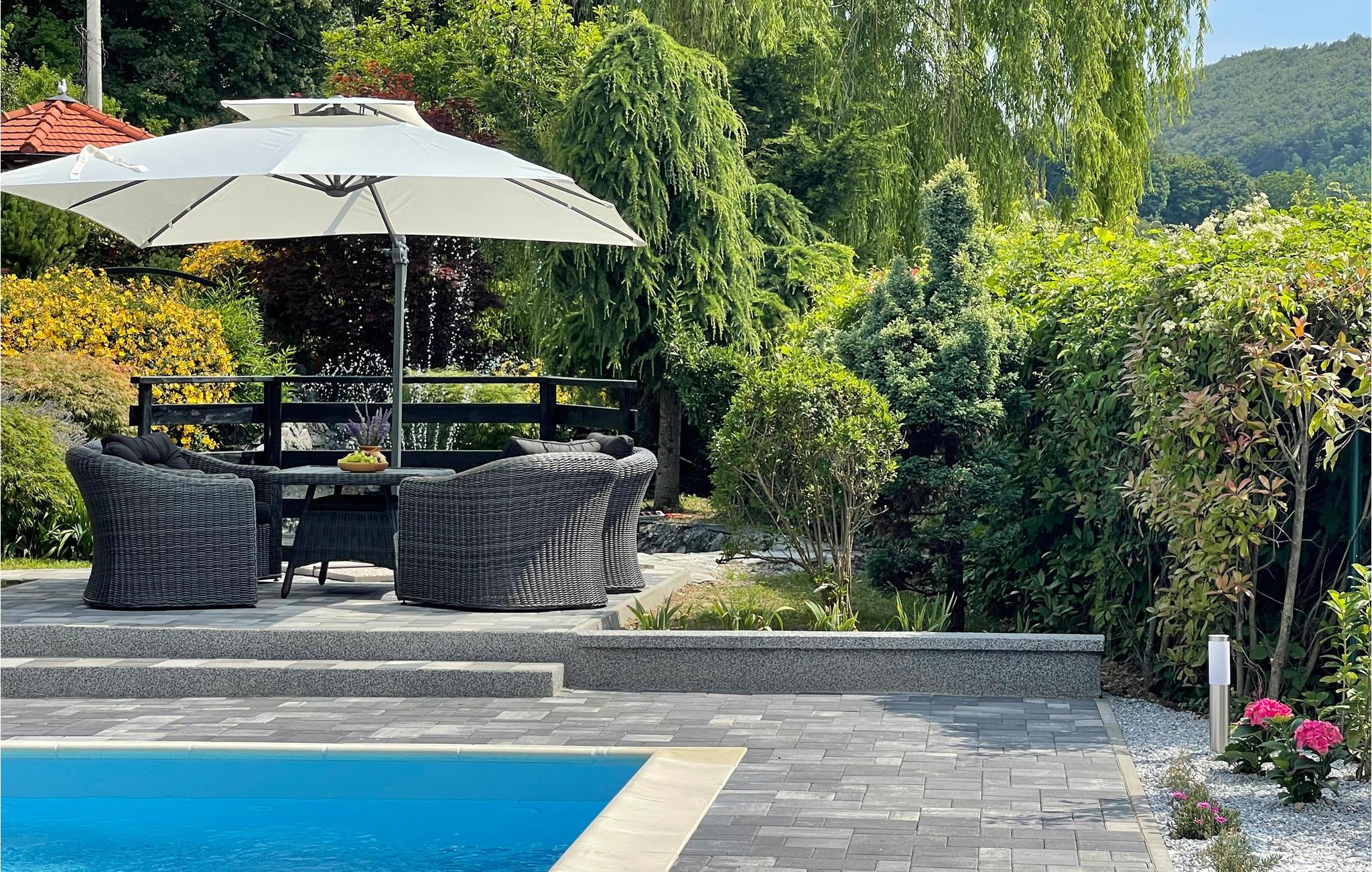 Huset har altan og flere terrasser med skøn udsigt, så I har altid har et dejligt sted at sidde ude og nyde ferien. Hovedattraktionen er naturligvis poolen, som ligger overfor huset I en flot have, som passes kærligt af ejeren. Her kan I kan tilbringe timevis med at plaske rundt i poolen og sole jer. Til børnenes underholdning er der desuden diverse udendørsspil, trækvogn og gynge. Indenfor kan I konkurrere i bordtennis. Afslut en skøn feriedag med en lækker grillmiddag efterfulgt at en dejlig stund i spbadet.