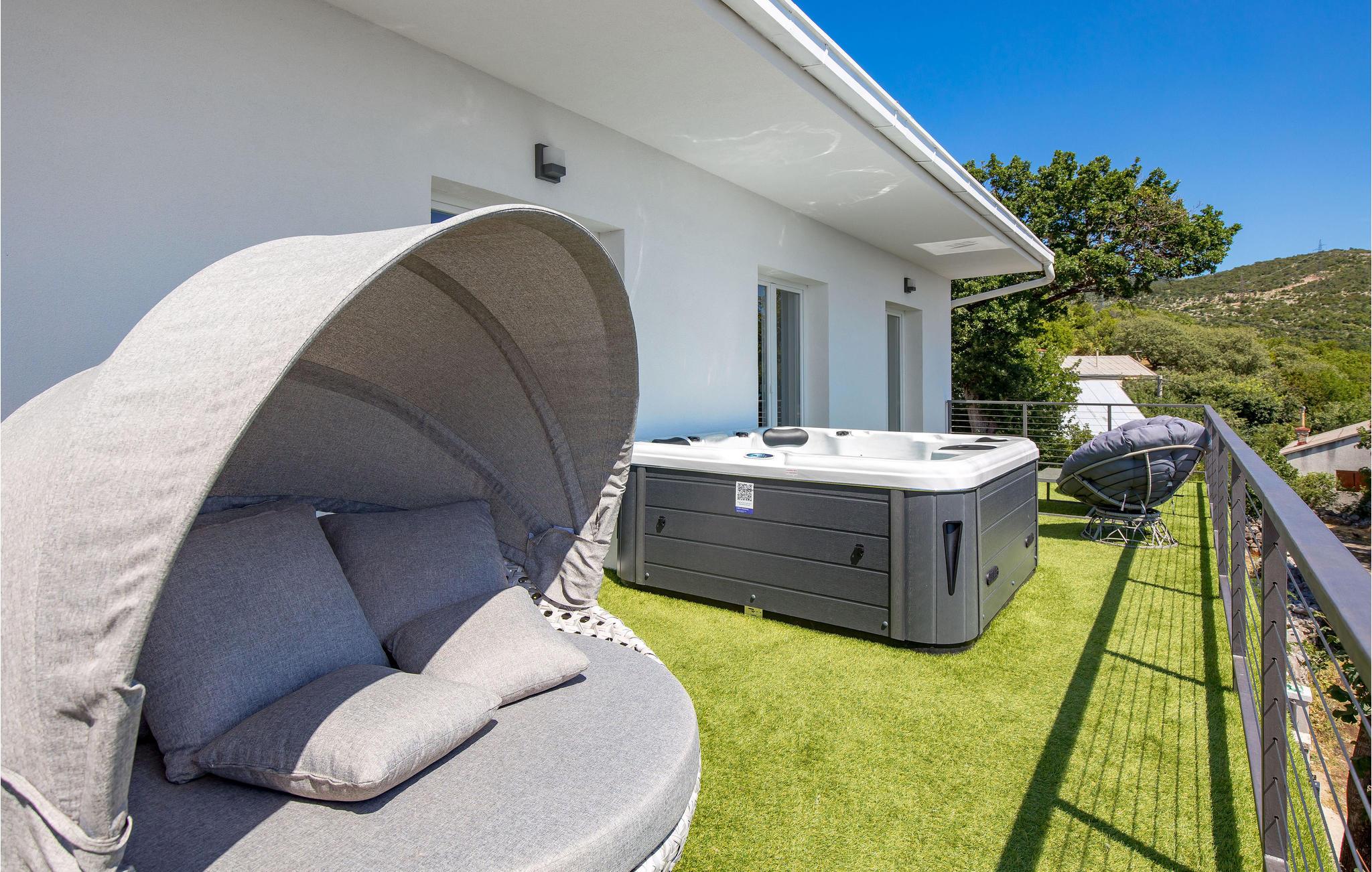 Forkæl jer selv med en afslappende tid på terrassen foran, hvor en solseng, jacuzzi og en betagende udsigt venter på jer. Træk jer tilbage her for at nyde fred og ro. Men der er også meget, der venter på jer bag huset. Svøm og plask i poolen, nyd jeres måltider al fresco eller solbad på sengen eller liggestolene.