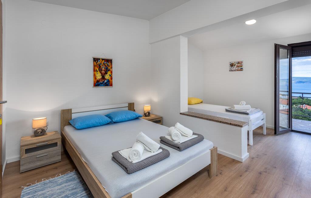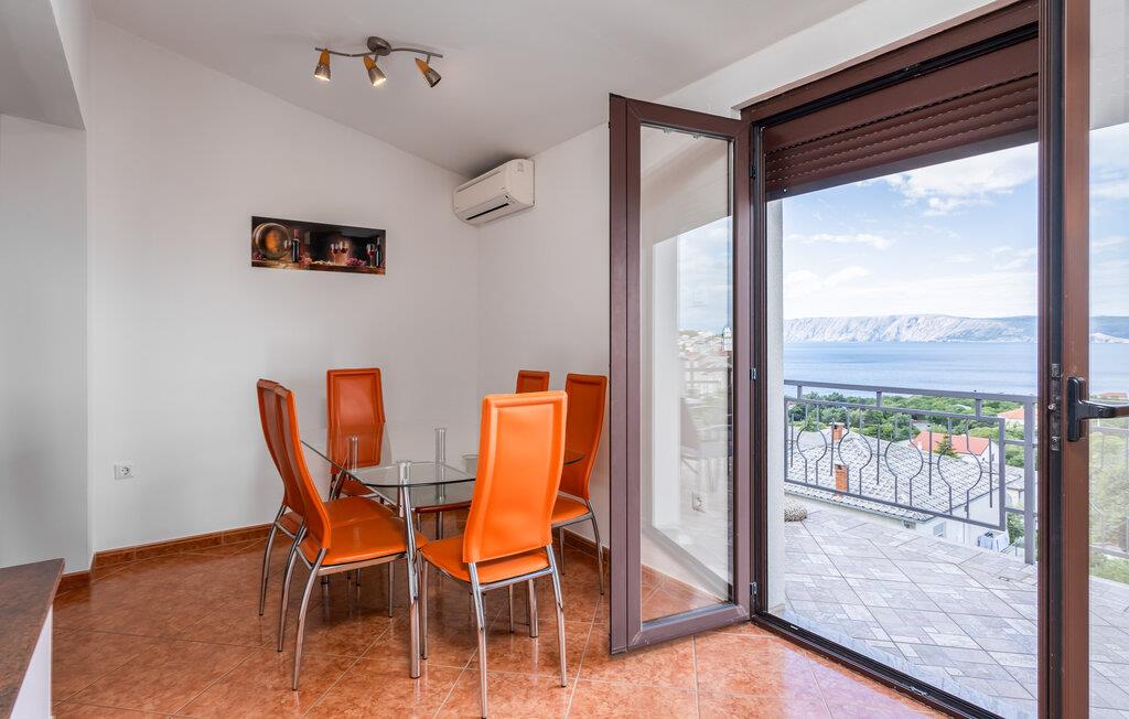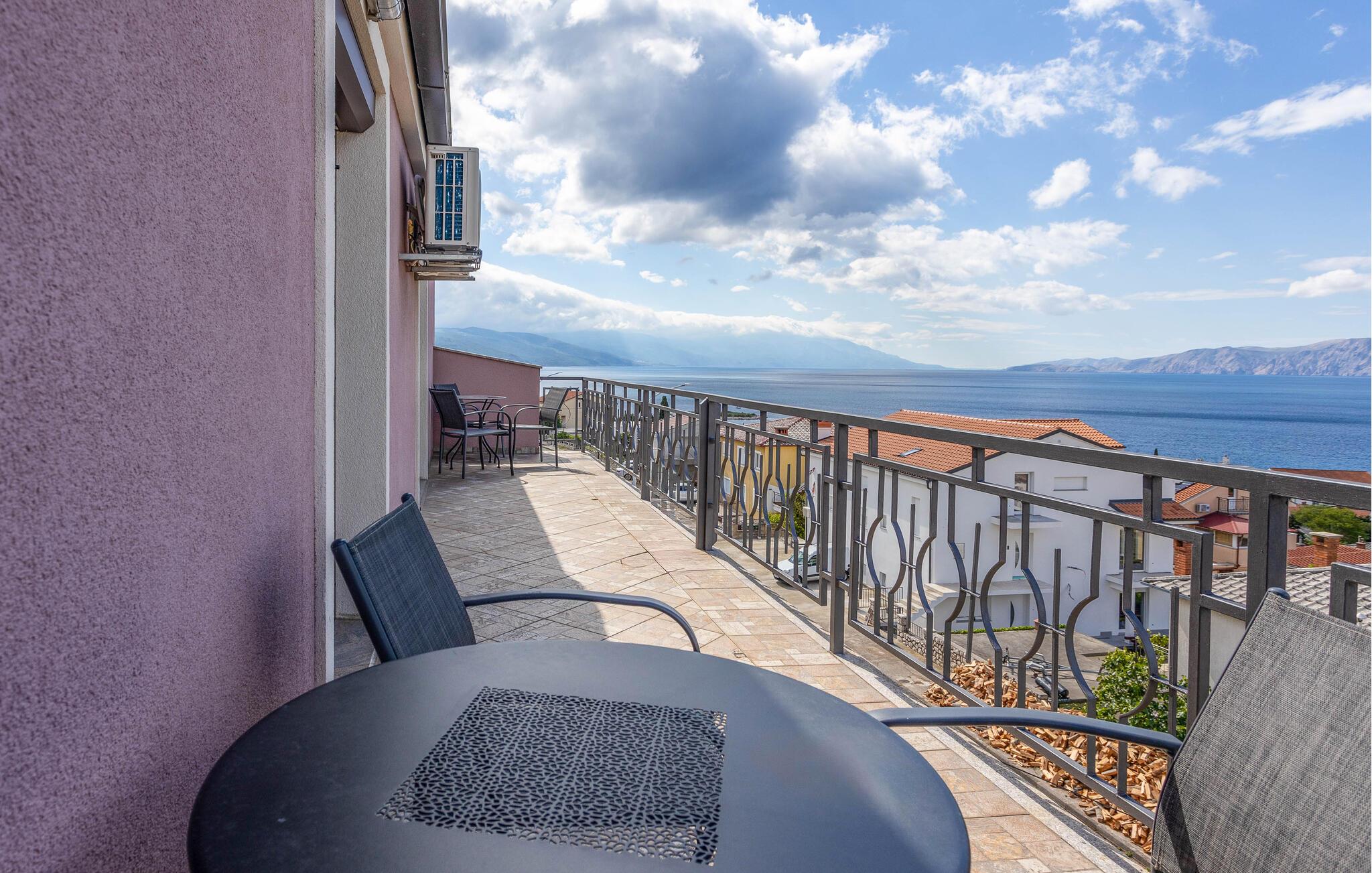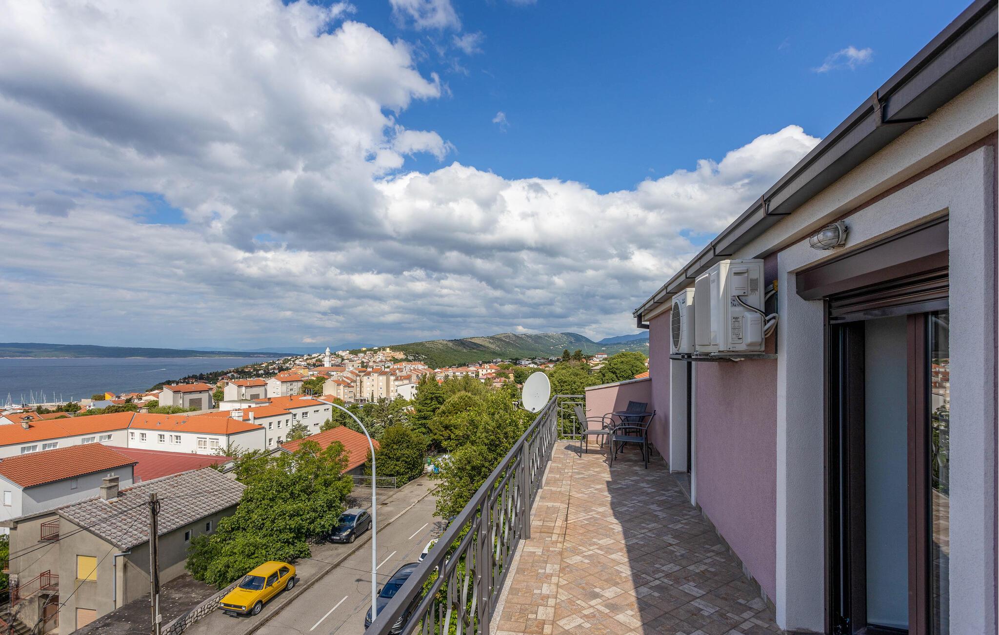Denne rummelige ferielejlighed ligger på anden etage i et privat hus er et godt indrettet med alt, hvad I behøver for at få en behagelig ferie. Fra altanen, der går hele vejen langs husets forside, har I en flot udsigt til havet og øen Krk. Det tager få minutter at gå ind til byens centrum og lidt længere til havet. På den store lokale strand finder I aktiviteter for hele familien. I aftentimerne kan I nyde atmosfæren i den gamle by eller besøge Crikvenica. Vi anbefaler, at I tager på udflugt til øen Krk eller går på shopping i Rijeka.
