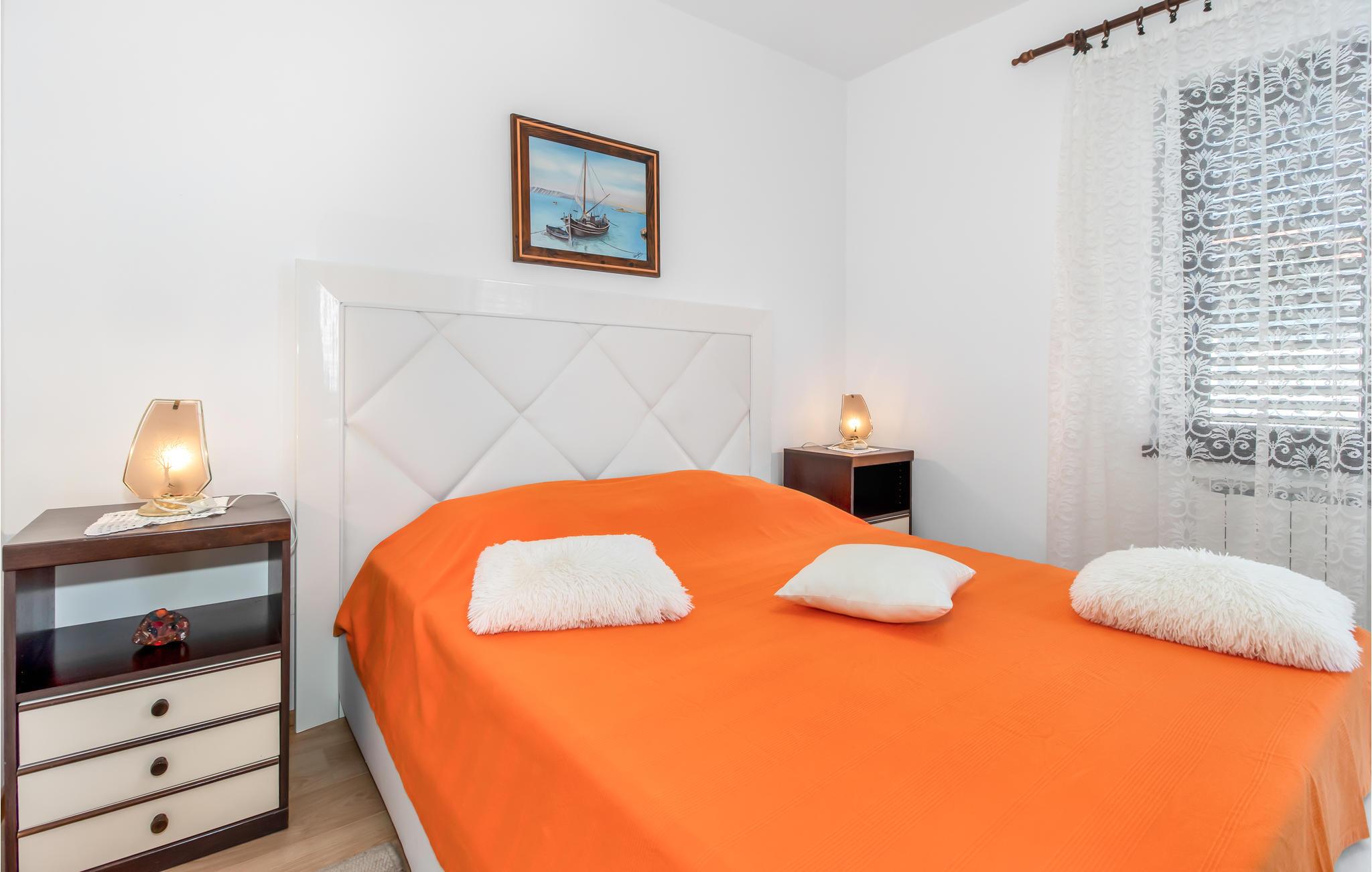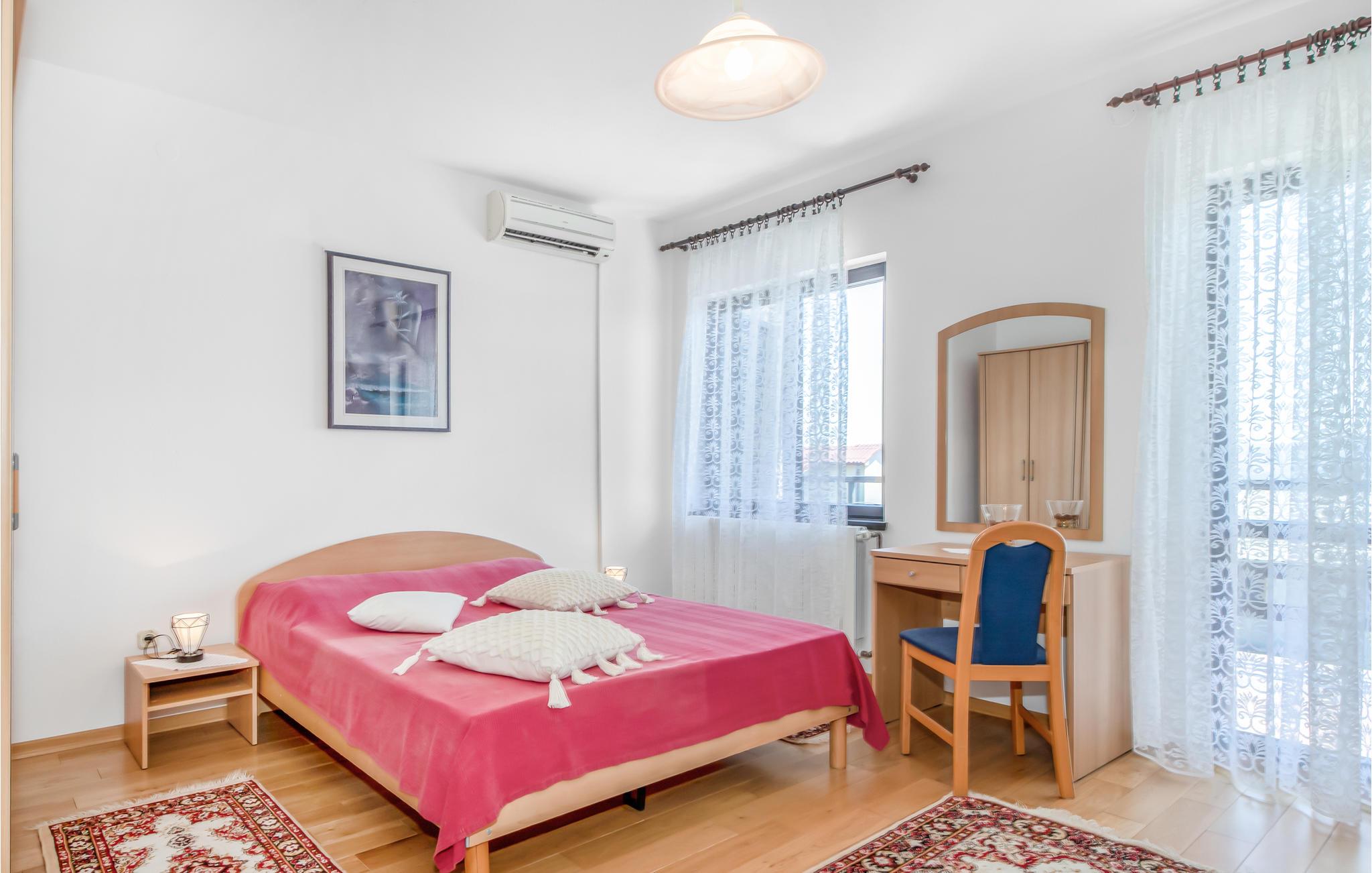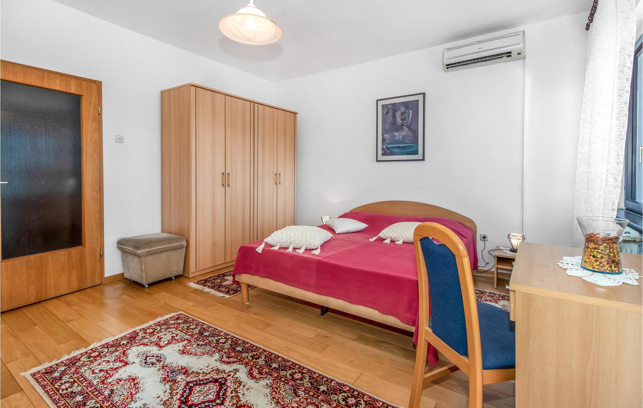 Lejligheden ligger på første sal og har to soveværelser med dobbeltsenge, et badeværelse med badekar og køkken med spiseplads.