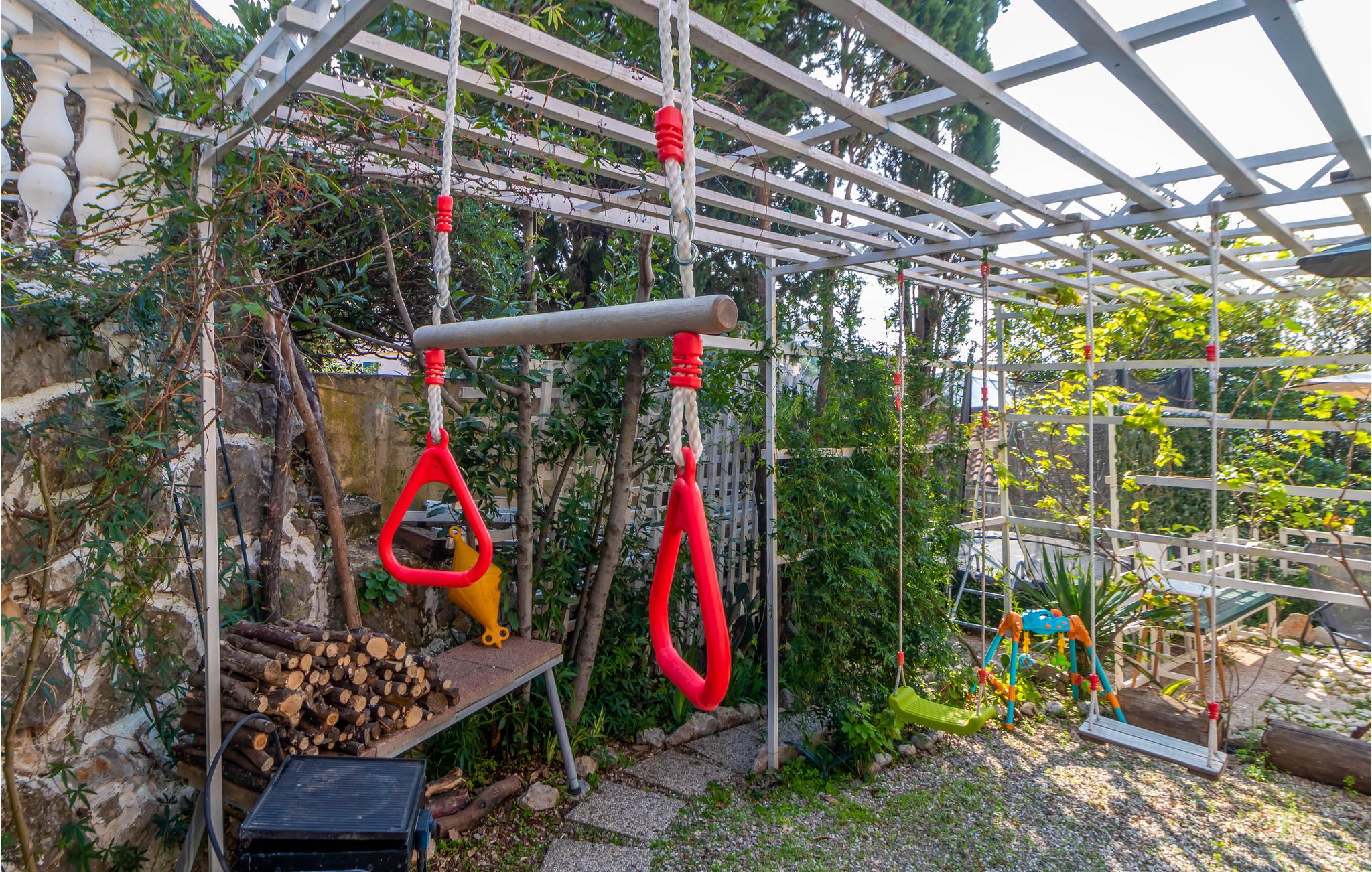 I kan nyde jeres feriemåltider på den rummelige terrasse med pergola og havudsigt, ligesom der er mulighed for at tilberede maden på murstensgrillen. Fælleshaven giver jeres børn mulighed for at lege, hoppe og gynge. Her kan I komme i kontakt med husets øvrige gæster, og jeres børn kan få ferievenner.