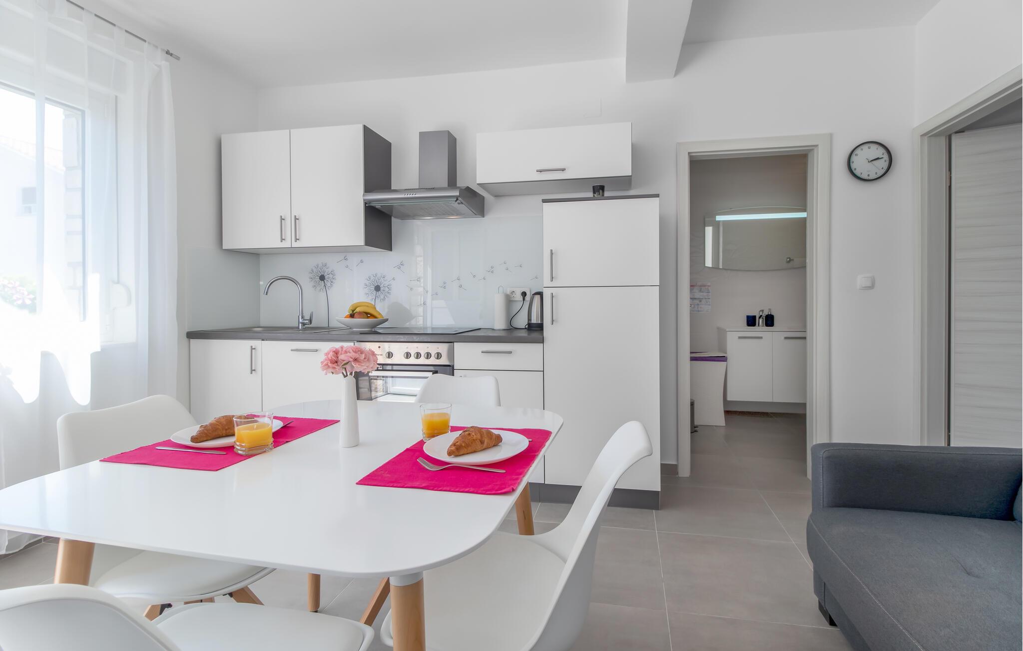 Denne lyse ferielejlighed byder jer velkommen med en frisk og indbydende atmosfære og ligger kun en kort gåtur fra stranden. Lad den behagelige havbrise blæse gennem værelserne under afslappende siestaer og hyggelige måltider. Forkæl jer selv med en pause efter en lang dag i solen eller stream en god serie.