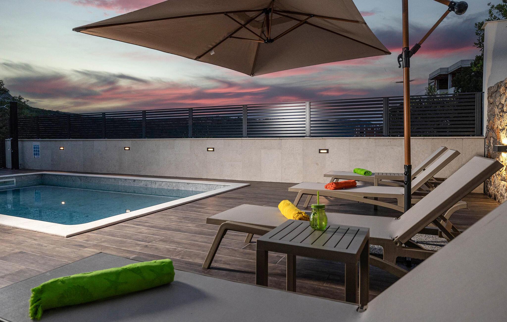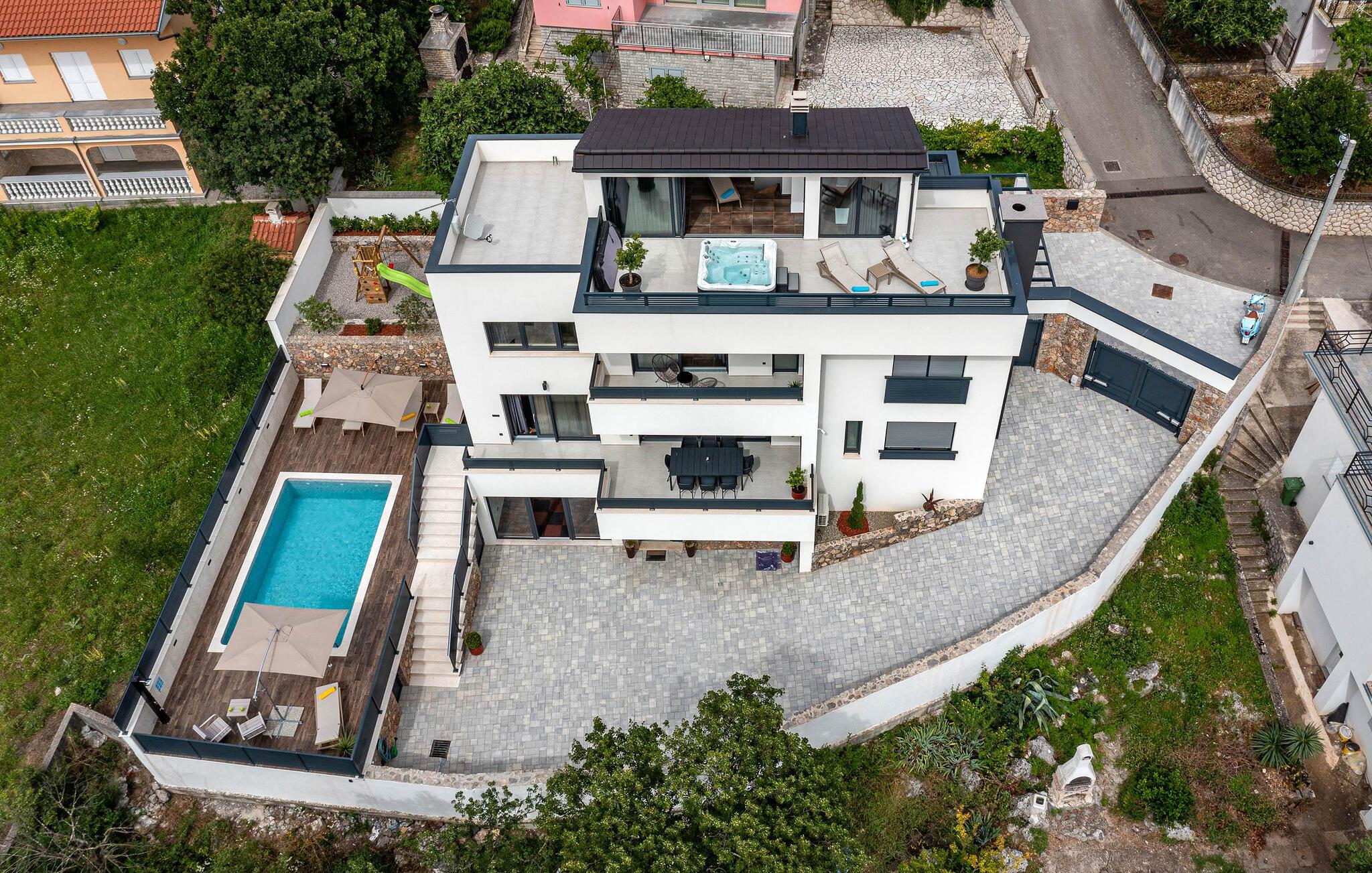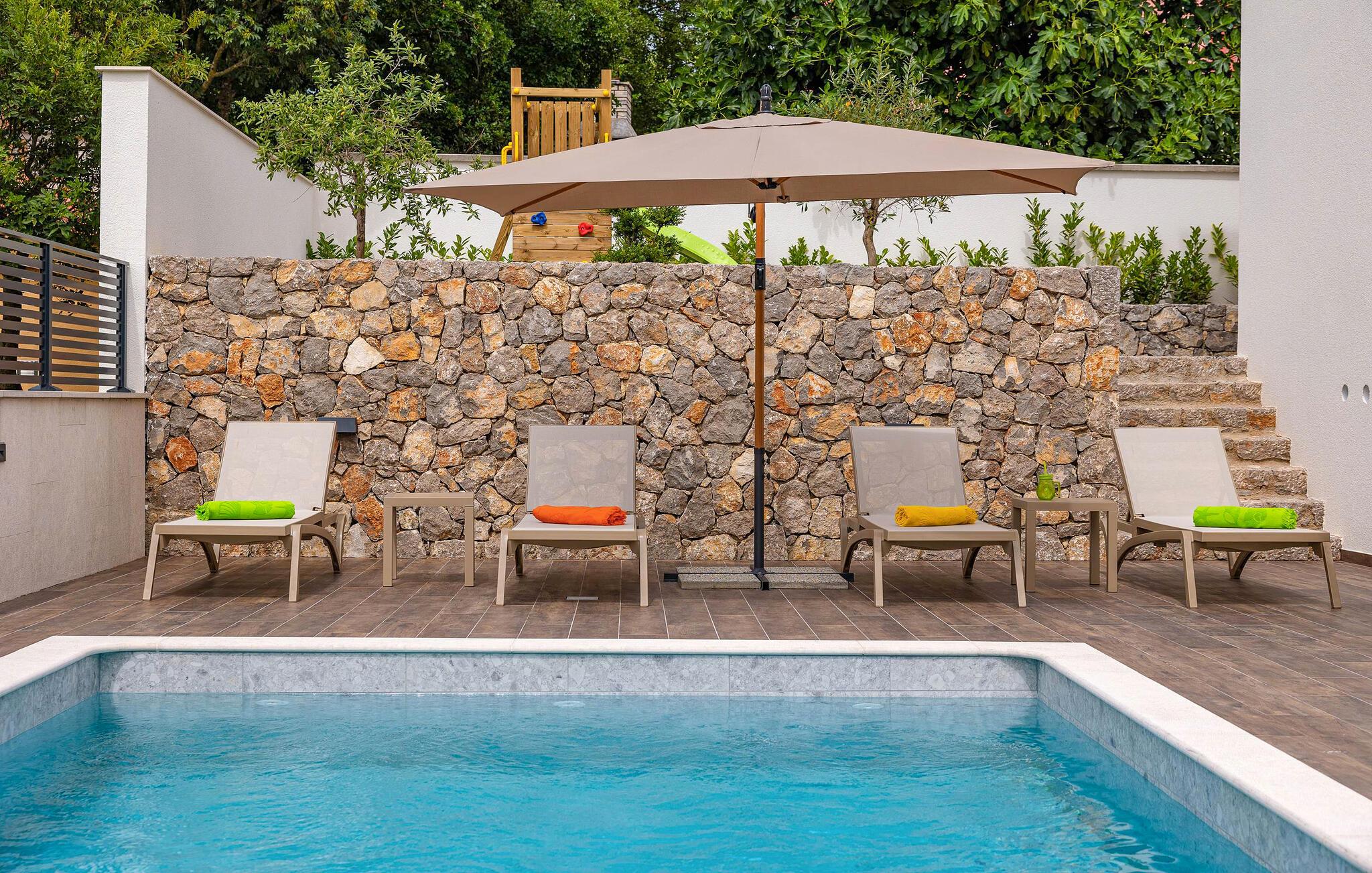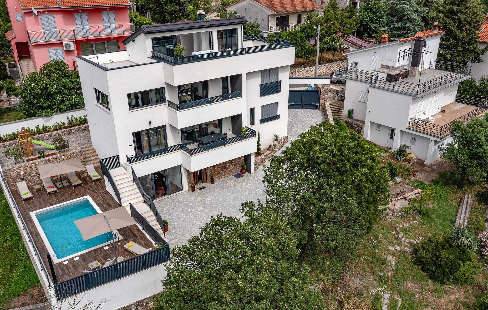 Dette feriehus i Novi Vinodolski på Crikvenica-Vinodol Riviera byder jer velkommen til en unik ferie i Kroatien. Begynd jeres dage med en forfriskende svømmetur i den private pool, før I finder ren afslapning i saunaen eller det udendørs spabad. Udnyt fitnessfaciliteterne til at holde jer i form og lad børnene lege indendørs eller løbe rundt udenfor på legepladsen. Nyd husets rummelige værelser og de mange faciliteter, det har at tilbyde.