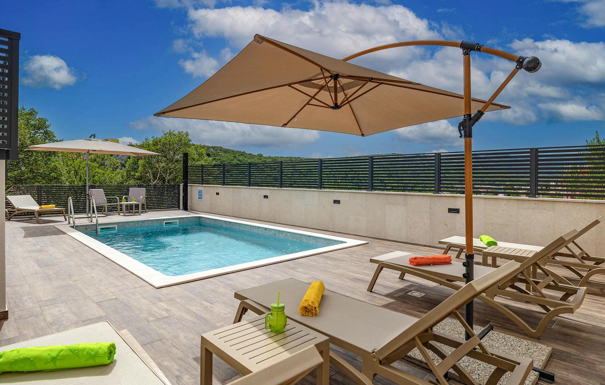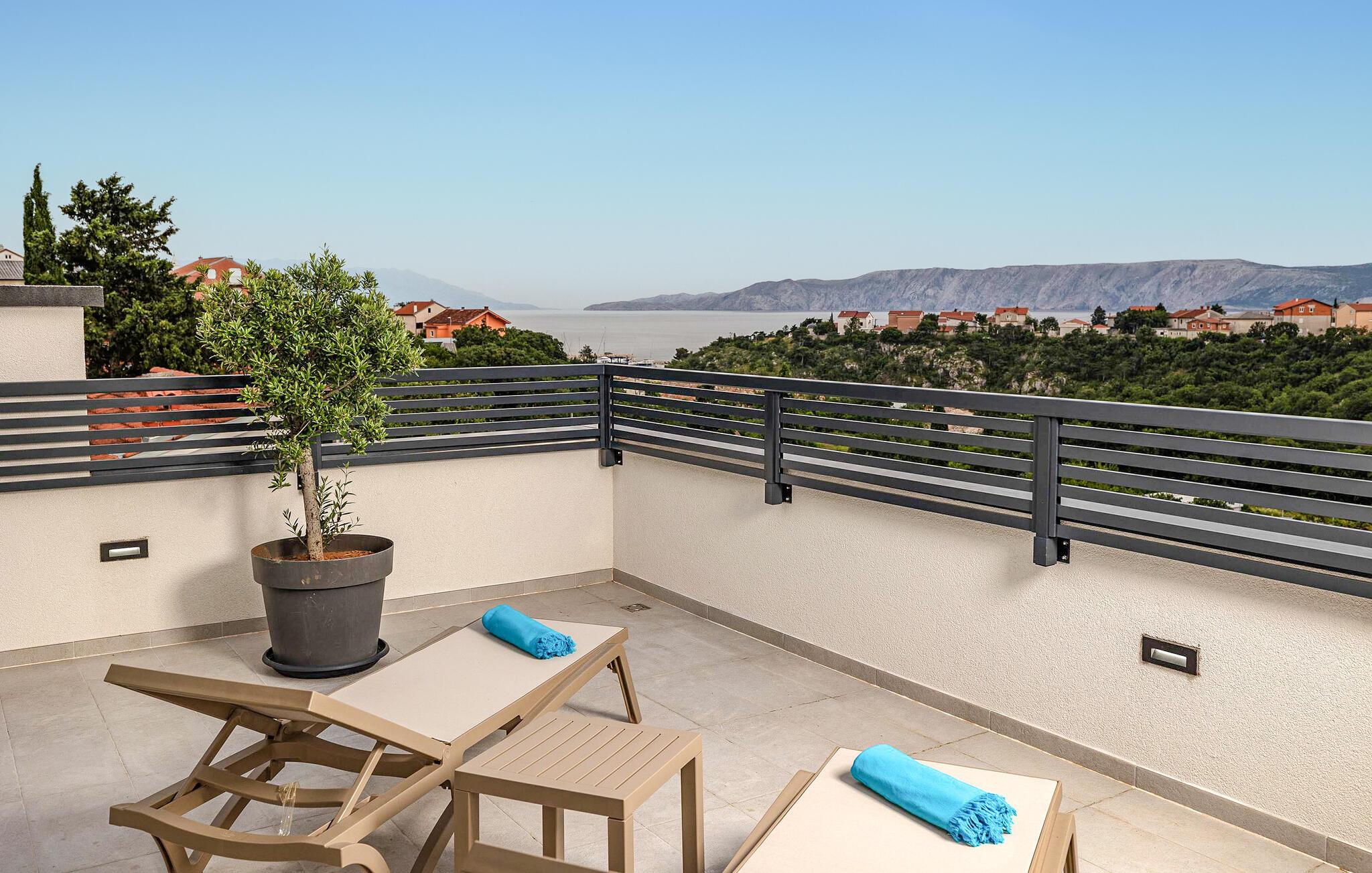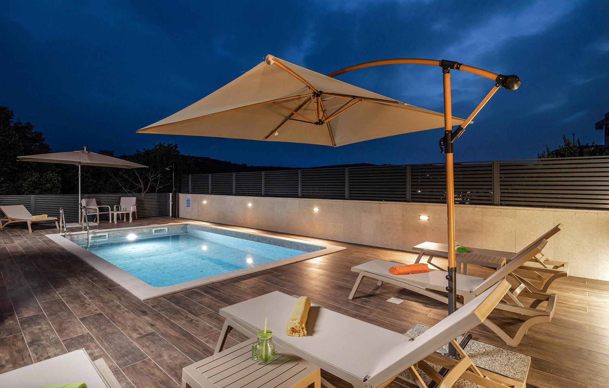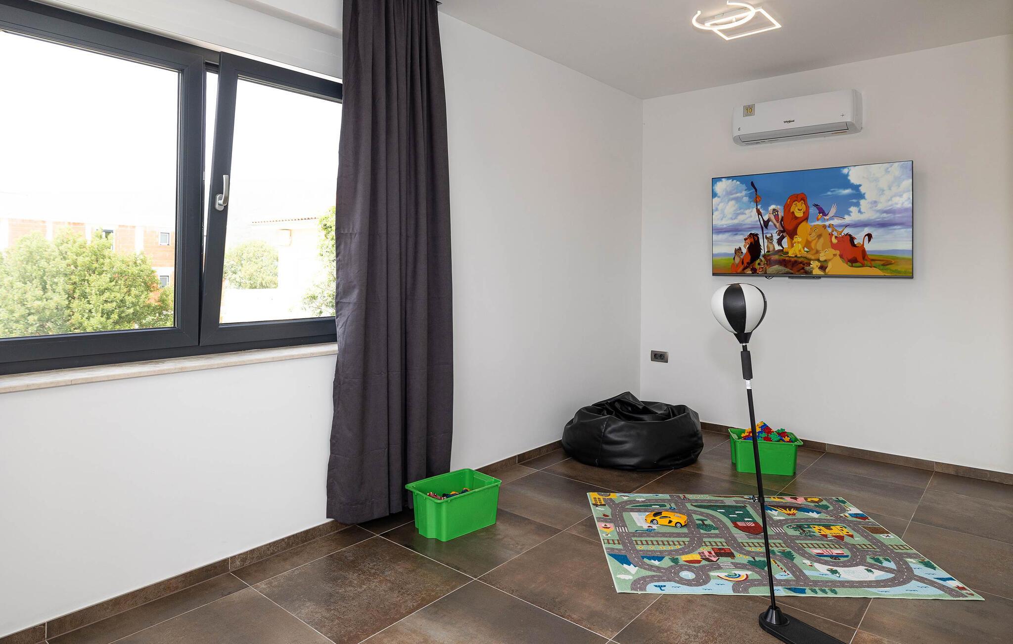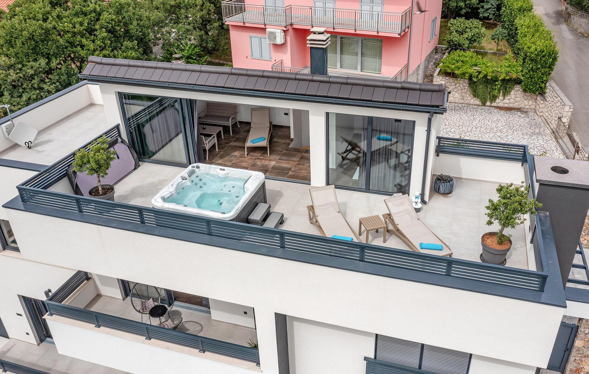Dette feriehus i Novi Vinodolski på Crikvenica-Vinodol Riviera byder jer velkommen til en unik ferie i Kroatien. Begynd jeres dage med en forfriskende svømmetur i den private pool, før I finder ren afslapning i saunaen eller det udendørs spabad. Udnyt fitnessfaciliteterne til at holde jer i form og lad børnene lege indendørs eller løbe rundt udenfor på legepladsen. Nyd husets rummelige værelser og de mange faciliteter, det har at tilbyde.