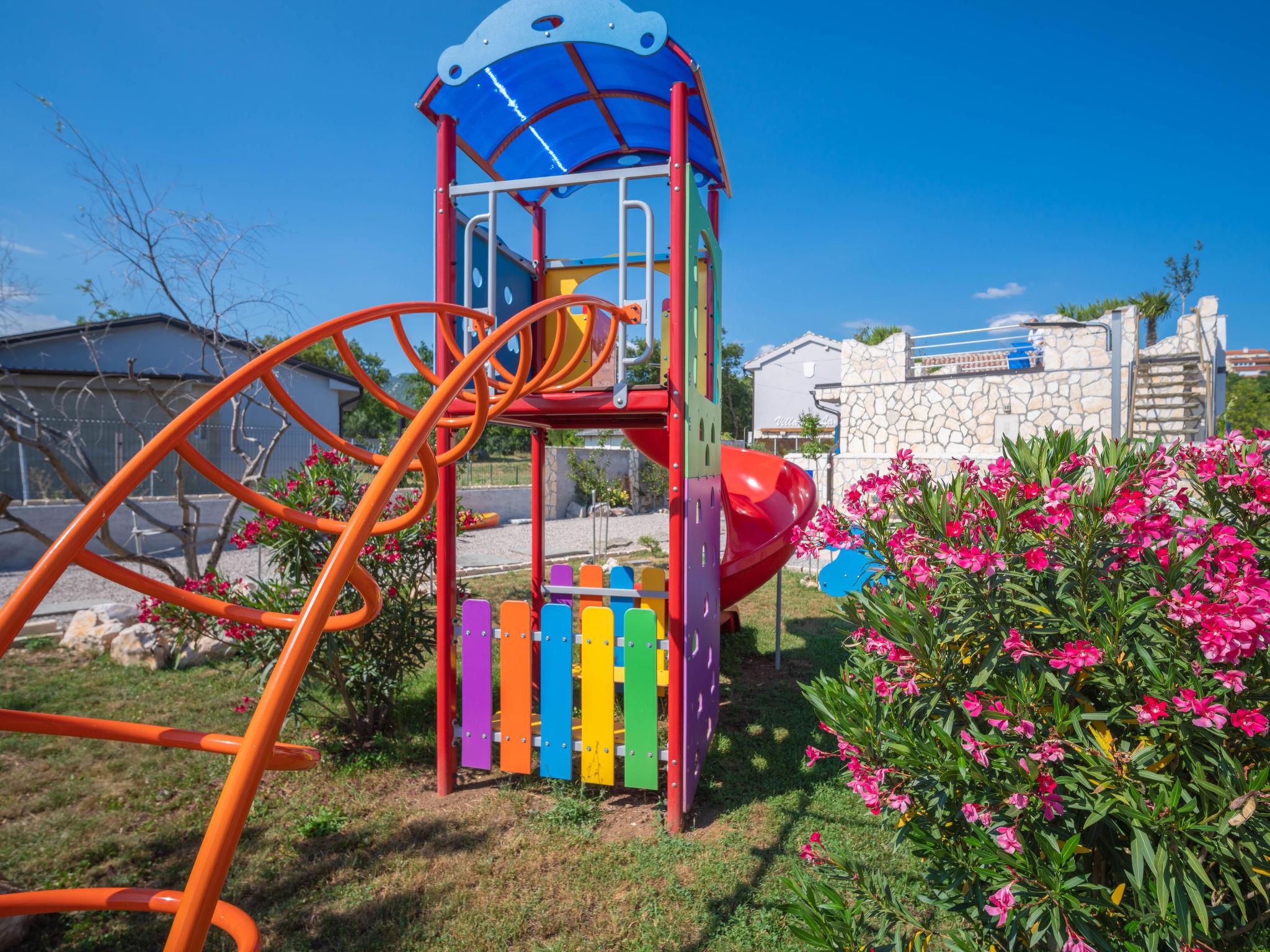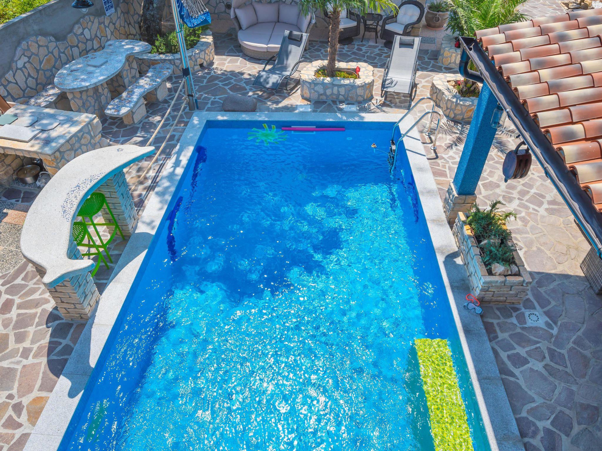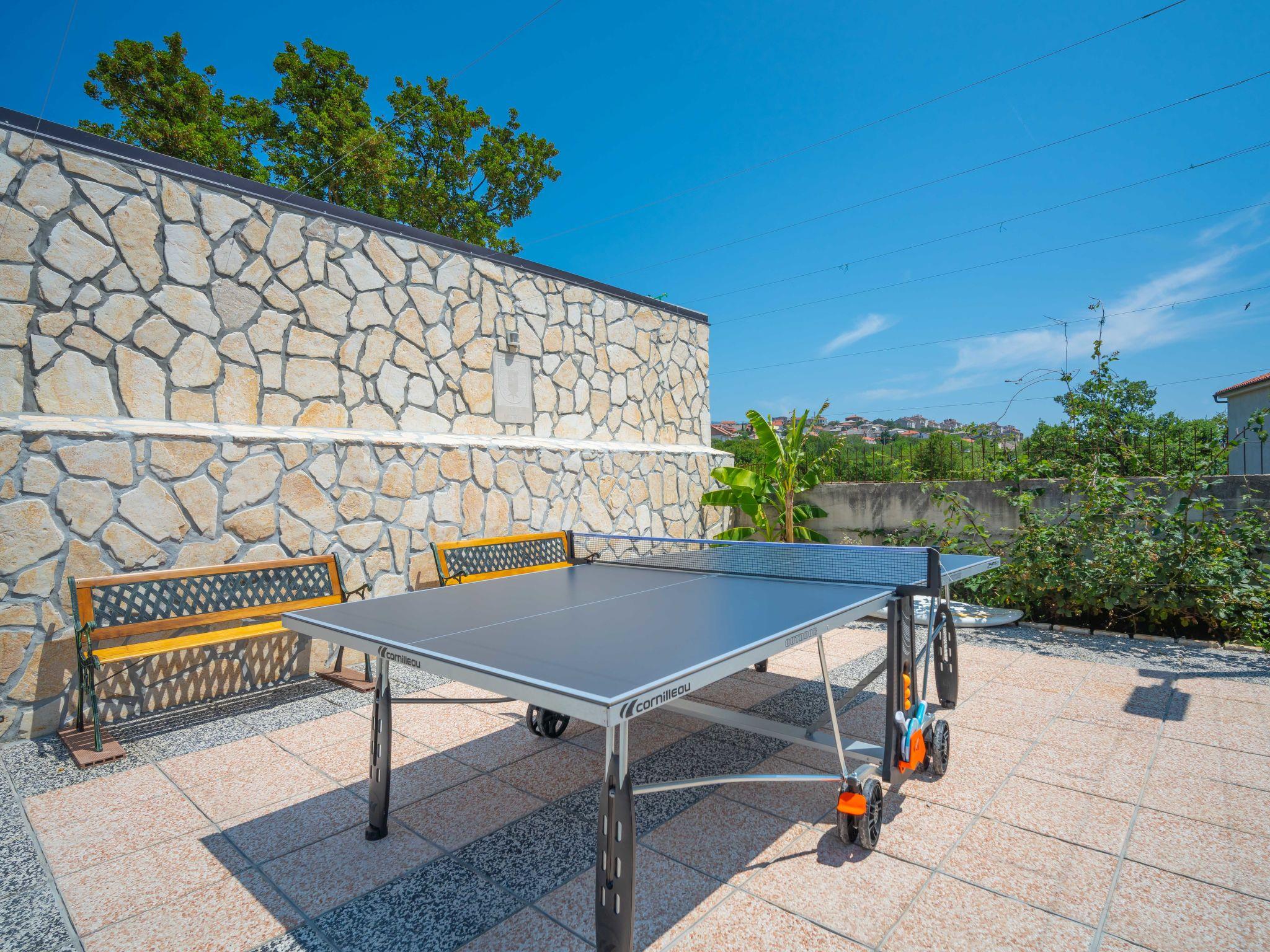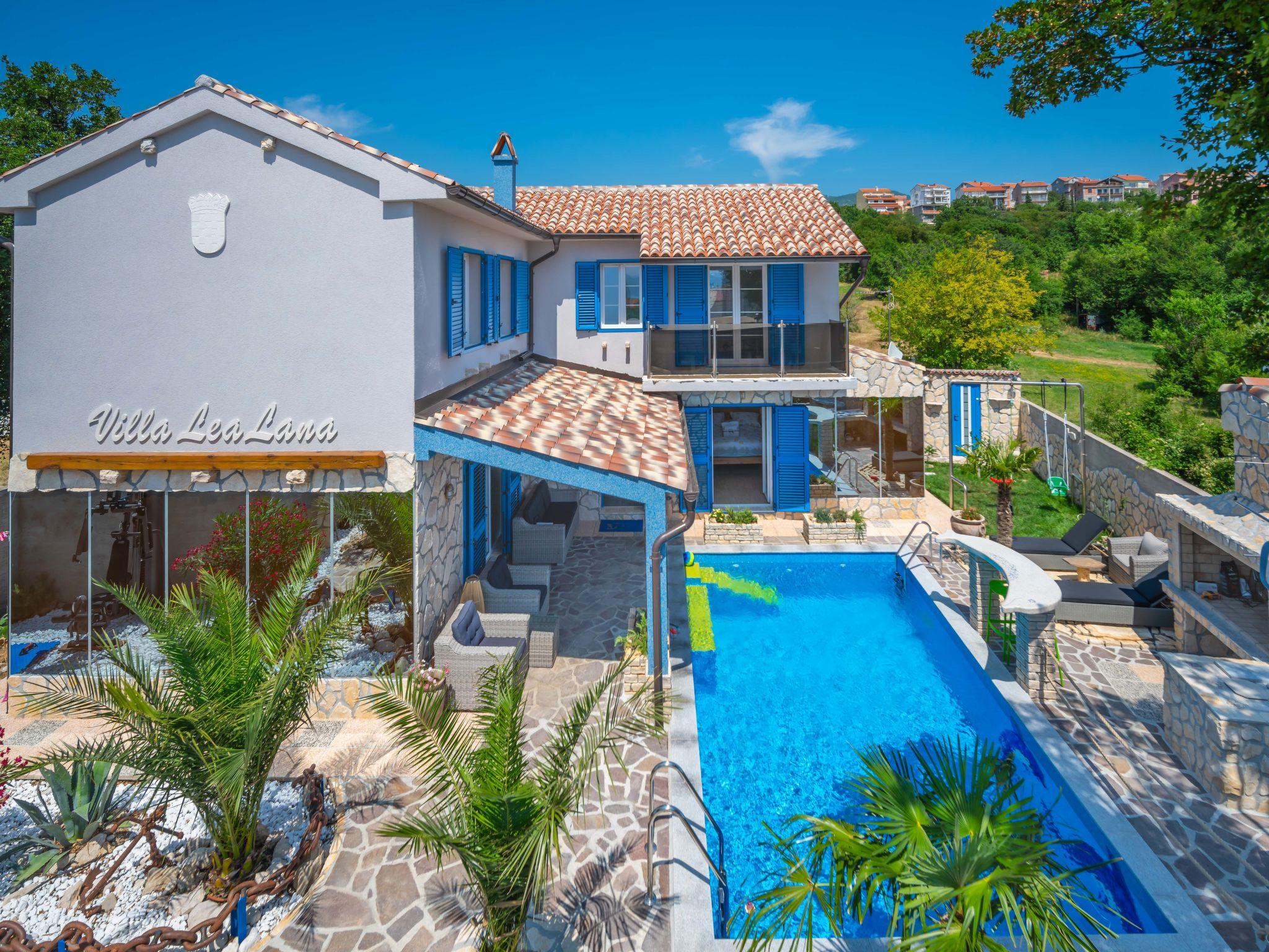Villa "Lea Lana", 2 storeys. 500 m from the centre of Novi Vinodolski, in a quiet, sunny position, 700 m from the sea, 900 m from the beach. Private: property 1'000 m2 (fenced) with wildlife garden, swimming pool angular (7 x 4 m, depth 150 cm, seasonal availability: 01.May. - 15.Oct.) with internal staircase. WC in the pool area, outdoor shower, hot tub, pool house, table tennis, terrace (50 m2), garden furniture, barbecue, children's playground (slide, swing). In the house: internet access, table football, burglar alarm system, washing machine. Parking (for 3 cars) at the house on the premises. Shop, supermarket, restaurant 500 m, bus stop 1.4 km, pebble beach, public bathing area, concrete beach 900 m. Please note: suitable for families. Groups of teenagers on request only. By groups of young people double deposit is requested on arrival. Organizing a party is not allowed. Pool house arranged as a playroom (table football, darts, play station). Available: multifunctional exercise machine. Welcome drink and snack upon arrival.