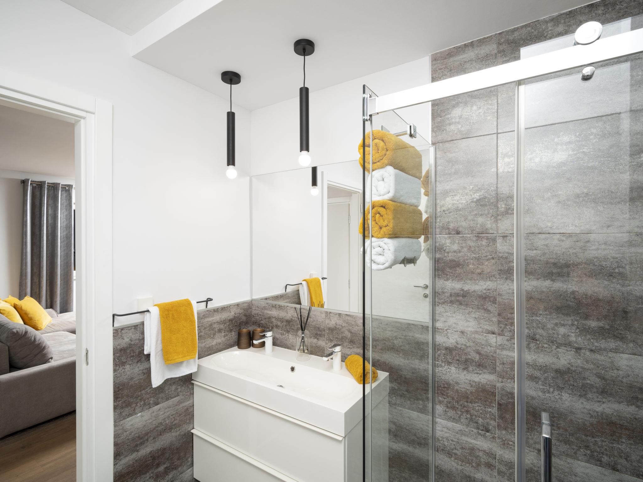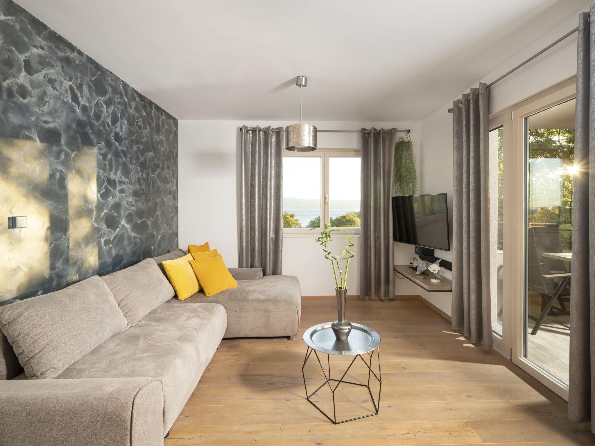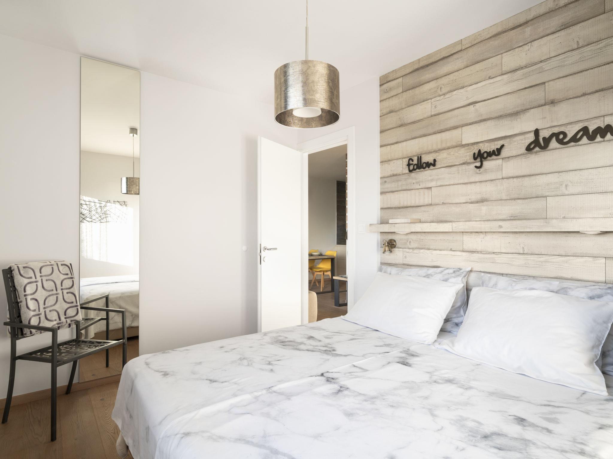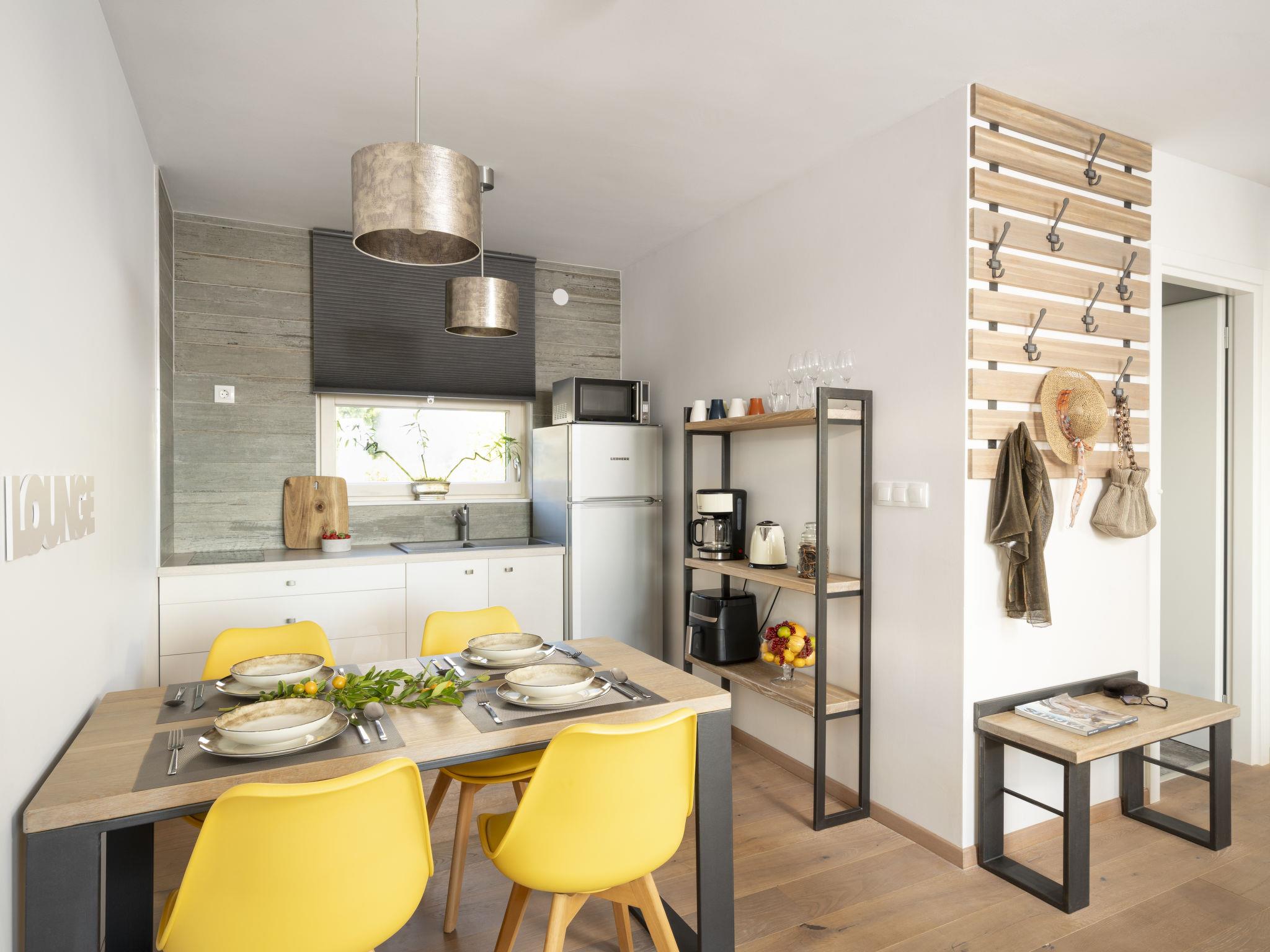"Family Lounge", 3-room apartment 41 m2 on 1st floor. Living/dining room with satellite TV and air conditioning. Exit to the terrace. 1 room with 1 french bed (180 cm, length 200 cm). 1 room with 1 french bed (160 cm, length 200 cm). Open kitchen (oven, 2 induction hot plates, toaster, kettle, microwave, freezer, electric coffee machine). Shower/WC. Floor heating, forced-air heating. Terrace 9 m2. Balcony furniture. Facilities: safe, iron, children's high chair, baby cot, hair dryer. Internet (WiFi, free). Please note: fire extinguisher.