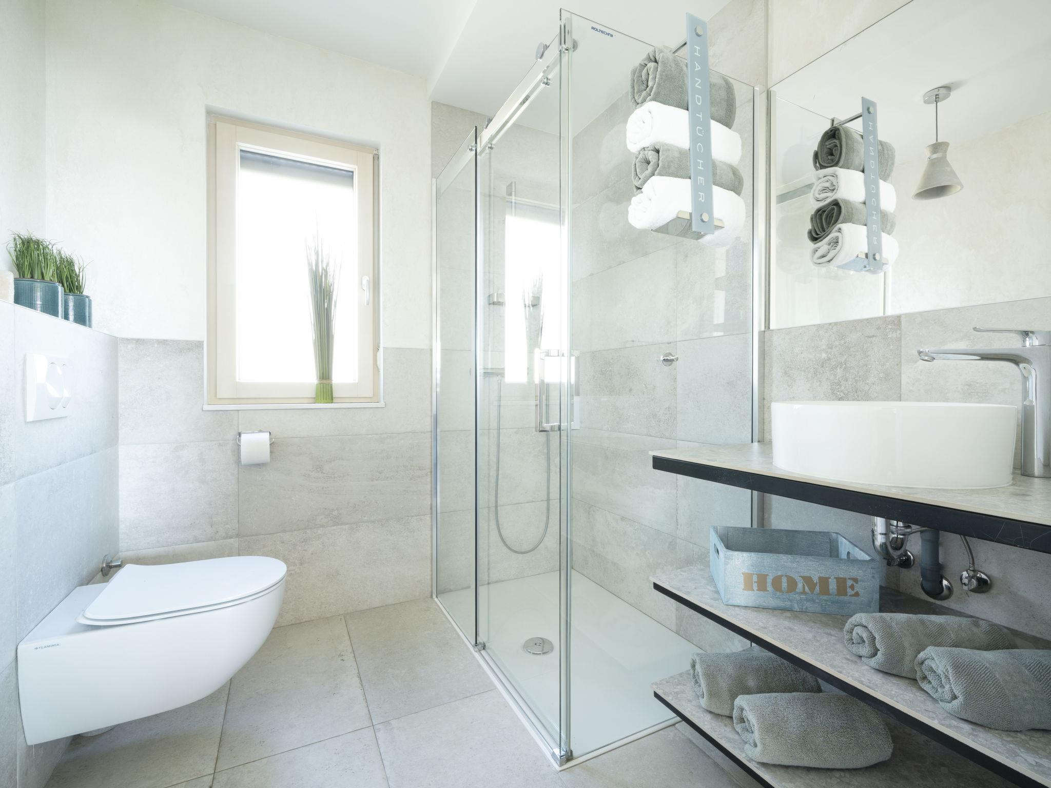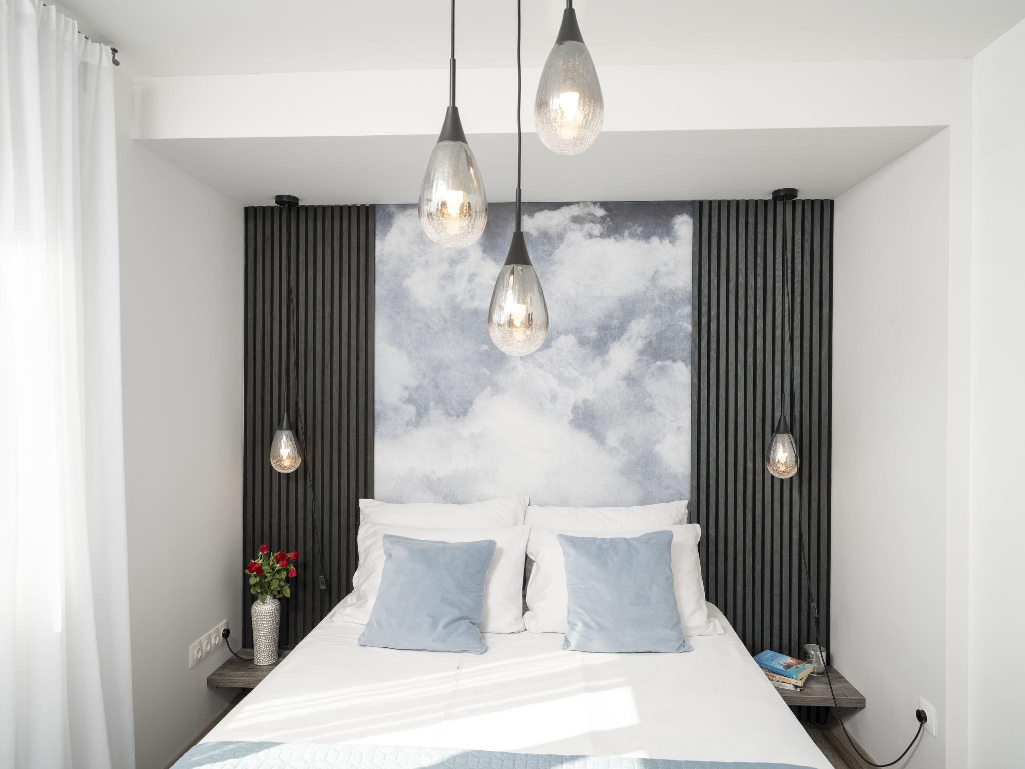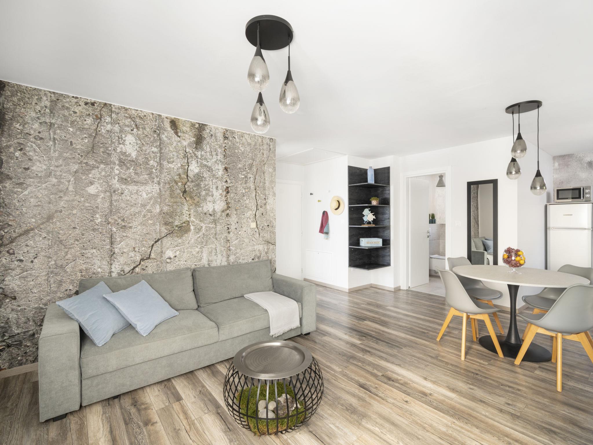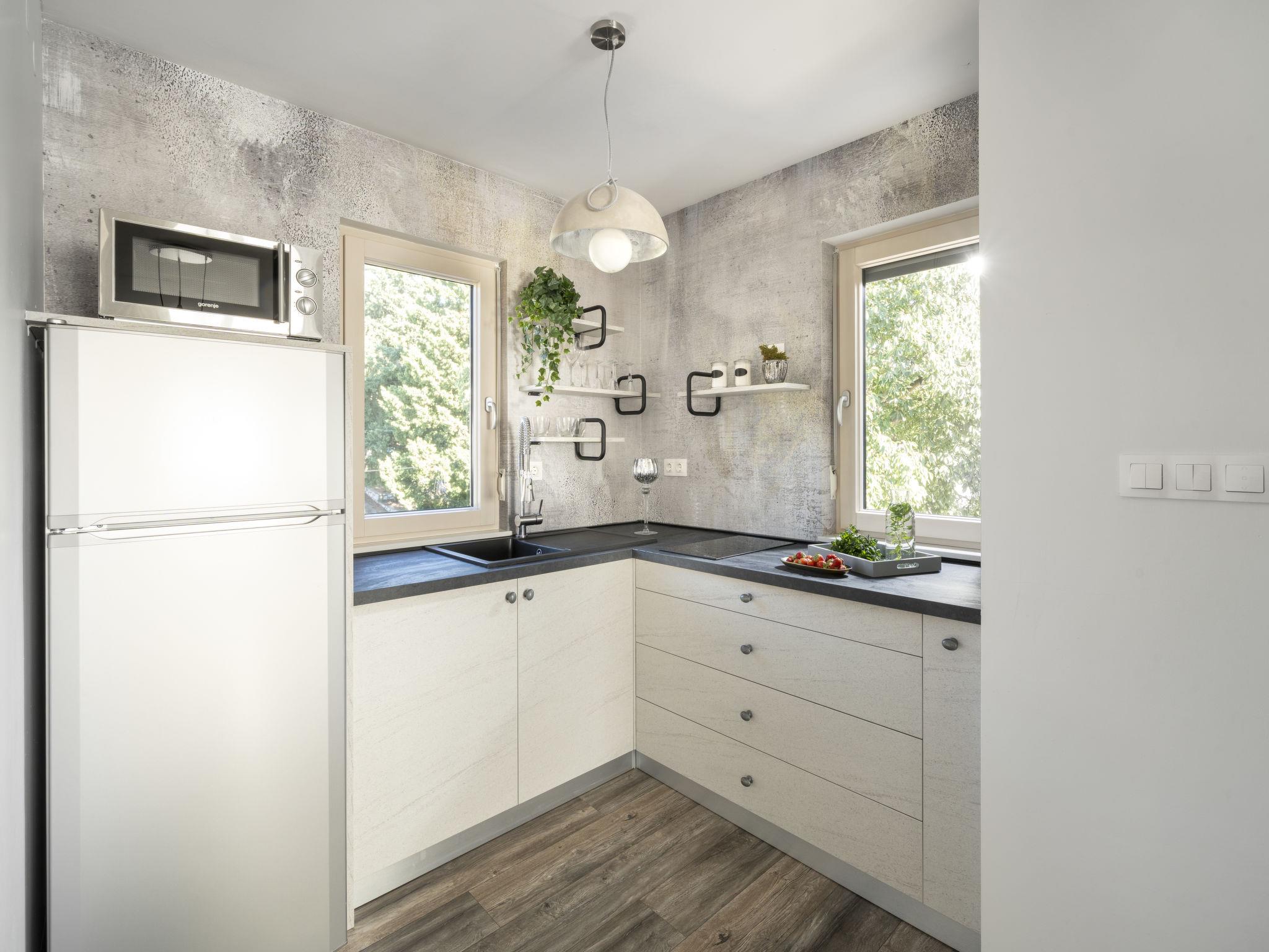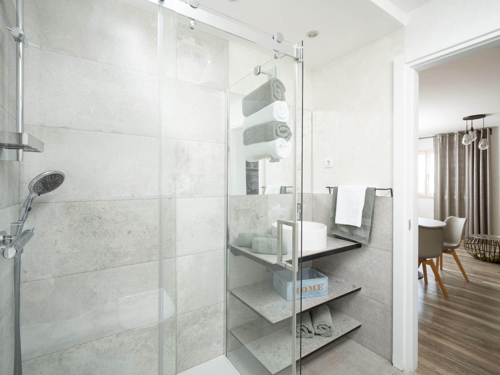 "Sky Lounge", 2-room apartment 38 m2 on 2nd floor. Living/dining room with satellite TV and air conditioning. Exit to the terrace. 1 room with 1 french bed (160 cm, length 200 cm). Open kitchen (oven, 2 induction hot plates, toaster, kettle, microwave, freezer, electric coffee machine). Shower/WC. Floor heating, forced-air heating. Terrace 9 m2. Balcony furniture. Facilities: safe, iron, children's high chair, baby cot, hair dryer. Internet (WiFi, free). Please note: fire extinguisher.