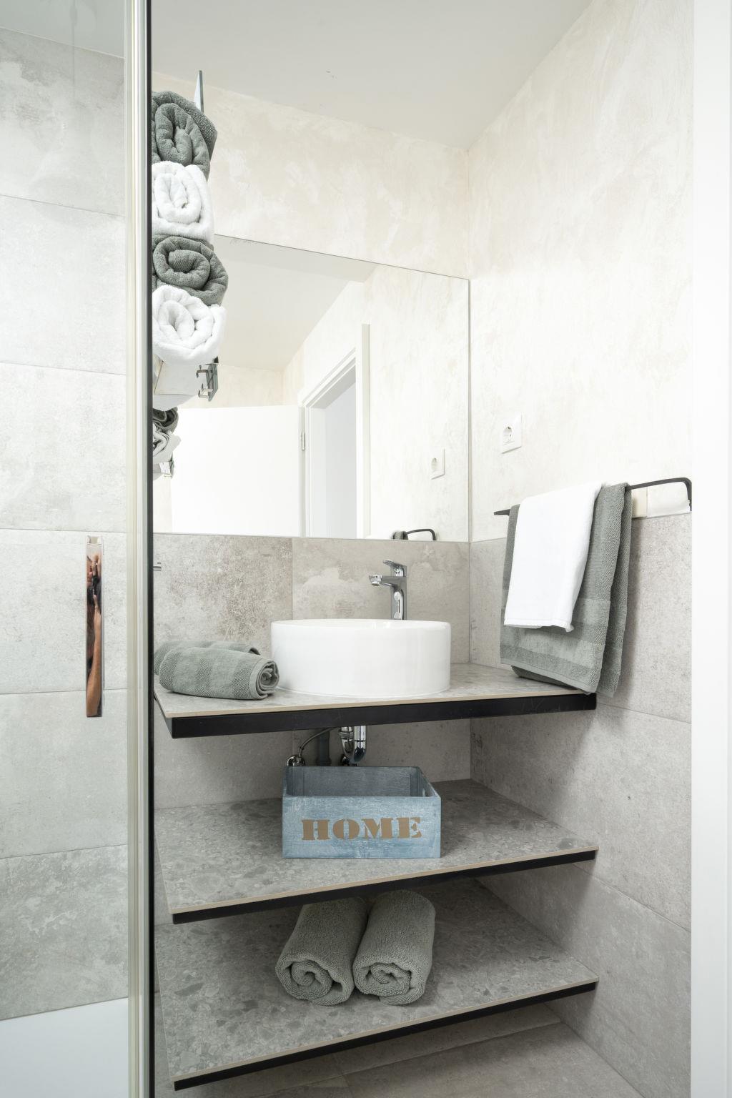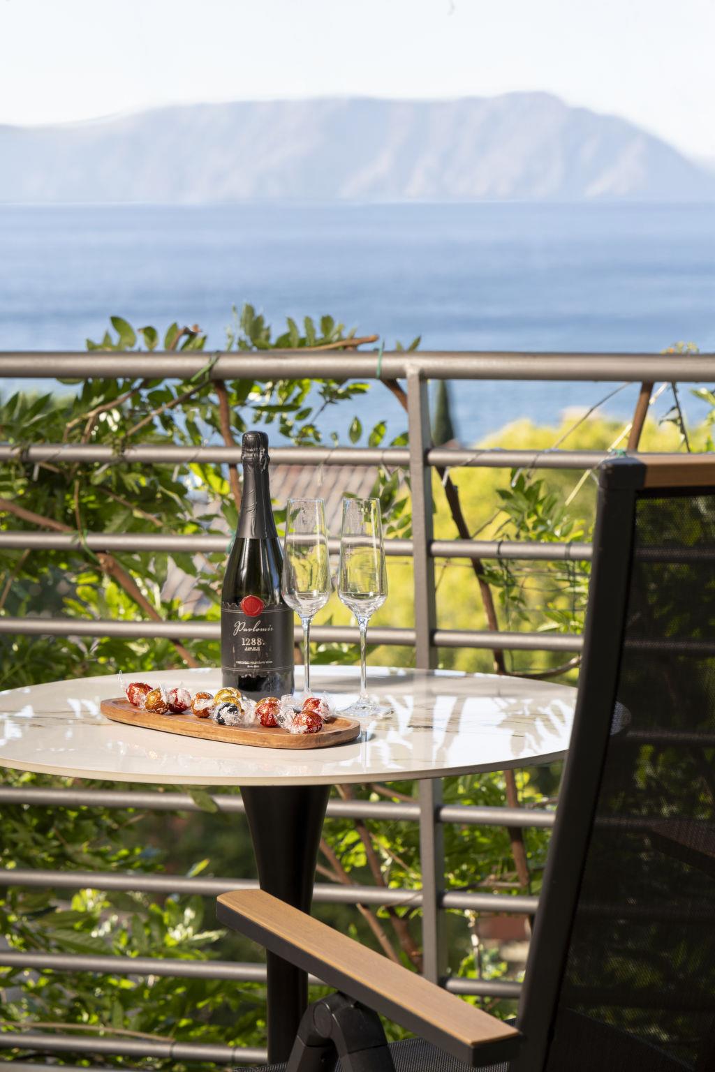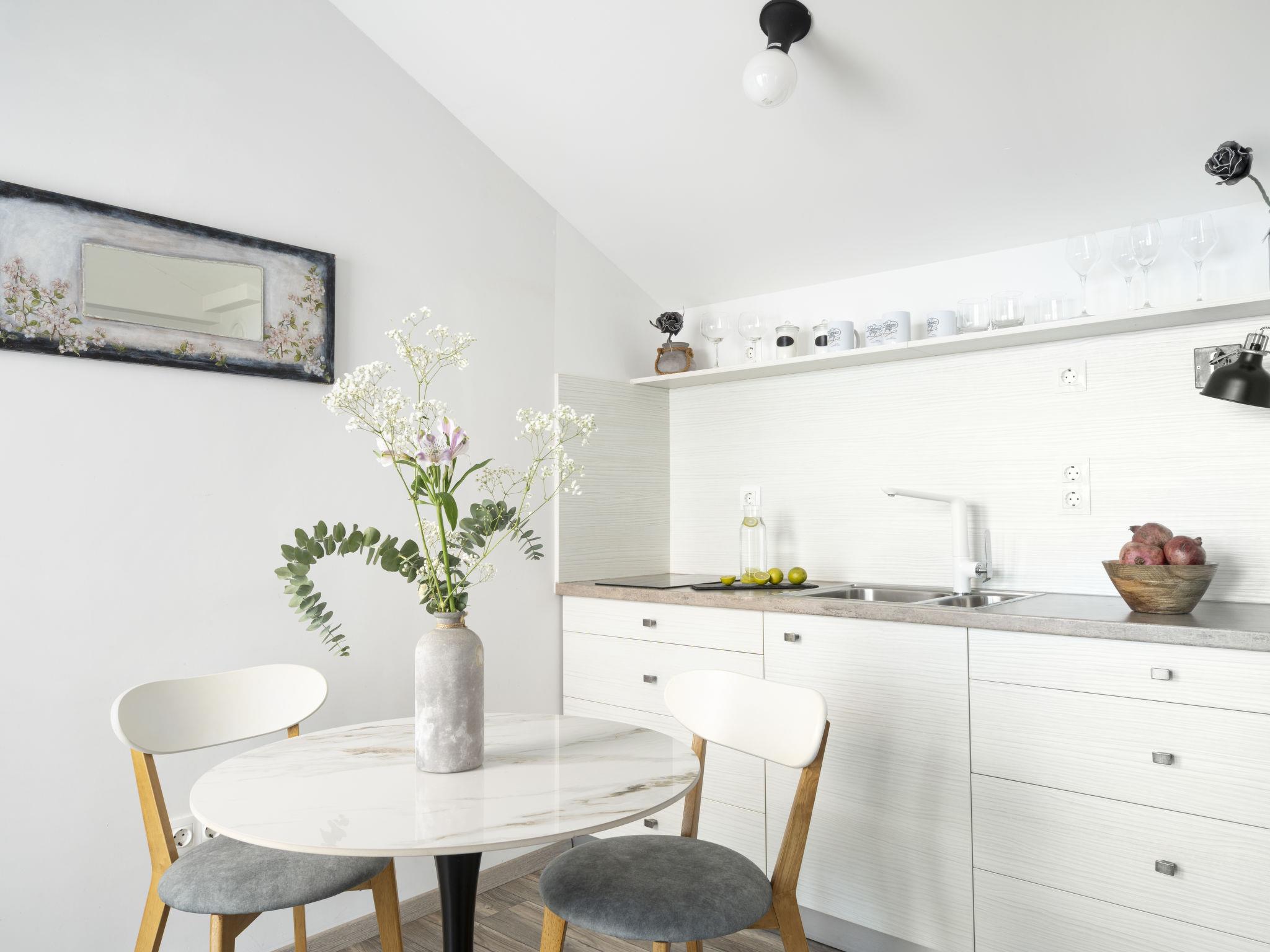 "Lovers lounge", 1-room studio 25 m2 on 2nd floor. Living/sleeping room with 1 french bed (180 cm, length 200 cm), satellite TV and air conditioning. Open kitchen (oven, 2 induction hot plates, toaster, kettle, microwave, freezer, electric coffee machine) with dining table. Exit to the terrace. Shower/WC. Floor heating, forced-air heating. Terrace 7 m2. Balcony furniture. Facilities: safe, iron, baby cot, hair dryer. Internet (WiFi, free). Please note: fire extinguisher.