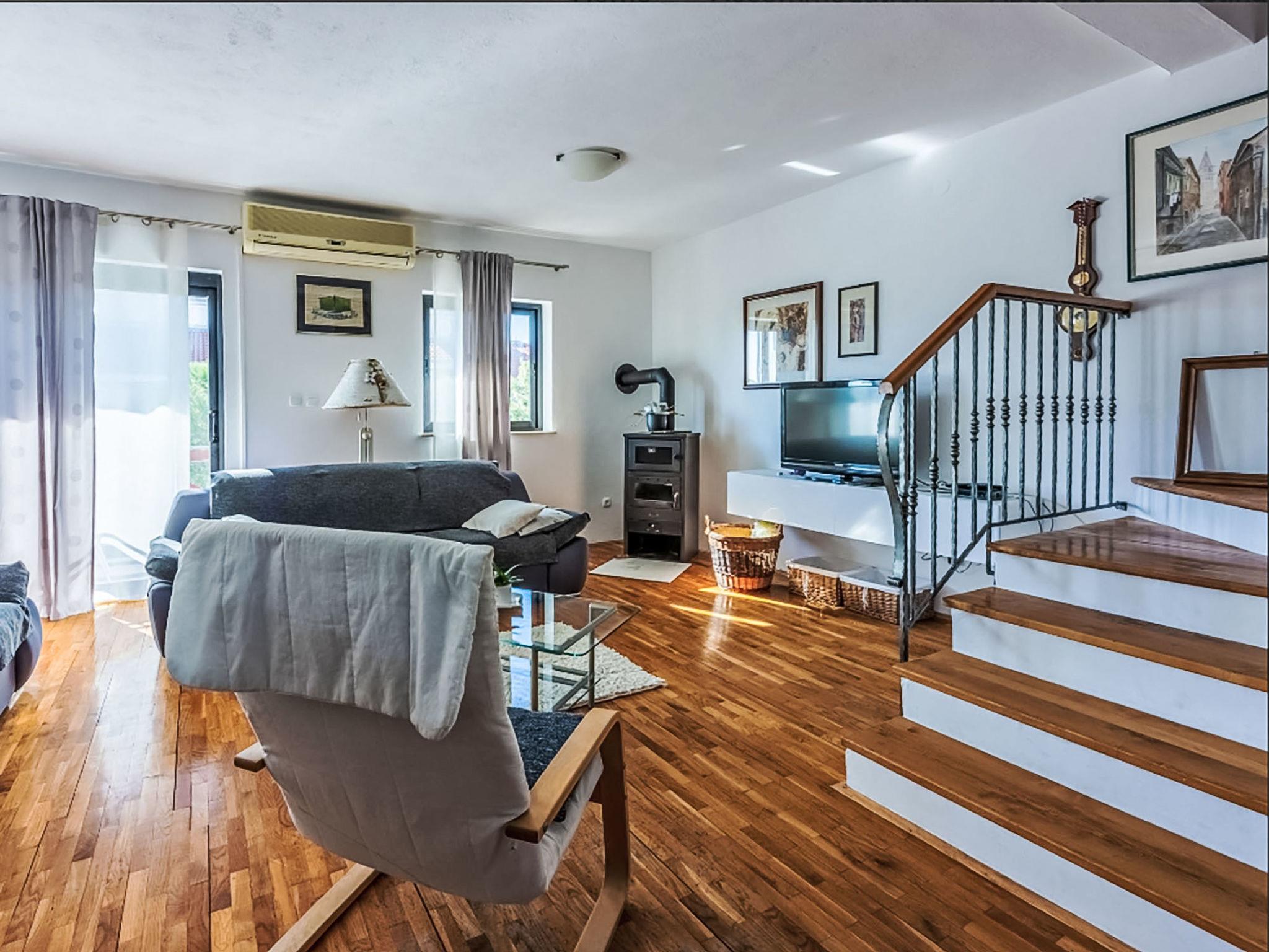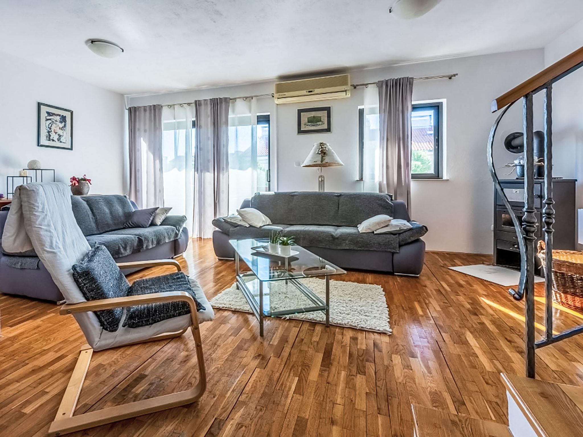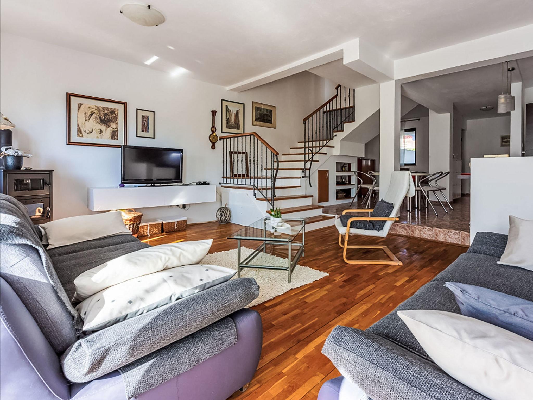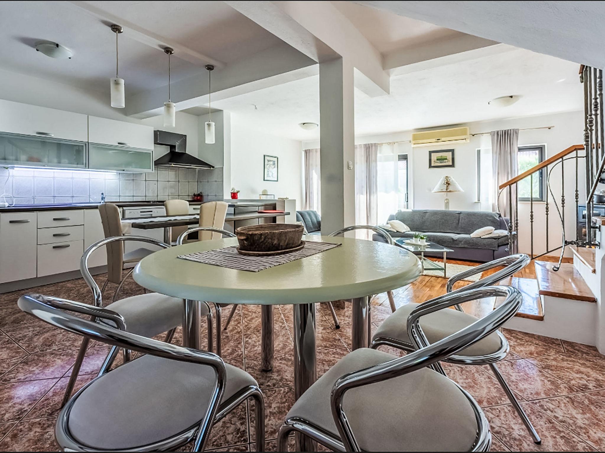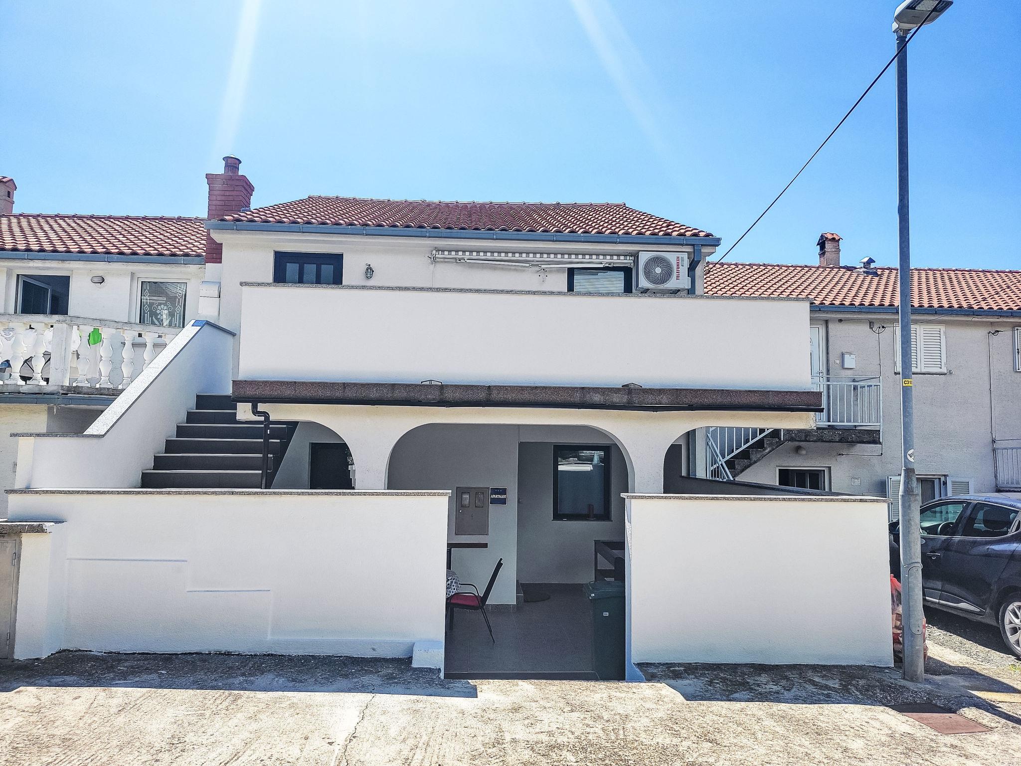 Novi Vinodolski: Apartment house "Deleut", 3 storeys. 1 km from the centre of Novi Vinodolski, 1.8 km from the sea, 1.8 km from the beach. For shared use: property 400 m2 (fenced). Terrace (50 m2), barbecue, barbecue house. In the house: internet access, washing machine. Parking at the house on the premises. Shop, restaurant 800 m, bus stop 1 km, pebble beach 1.8 km. Please note: the owner lives on the same property.