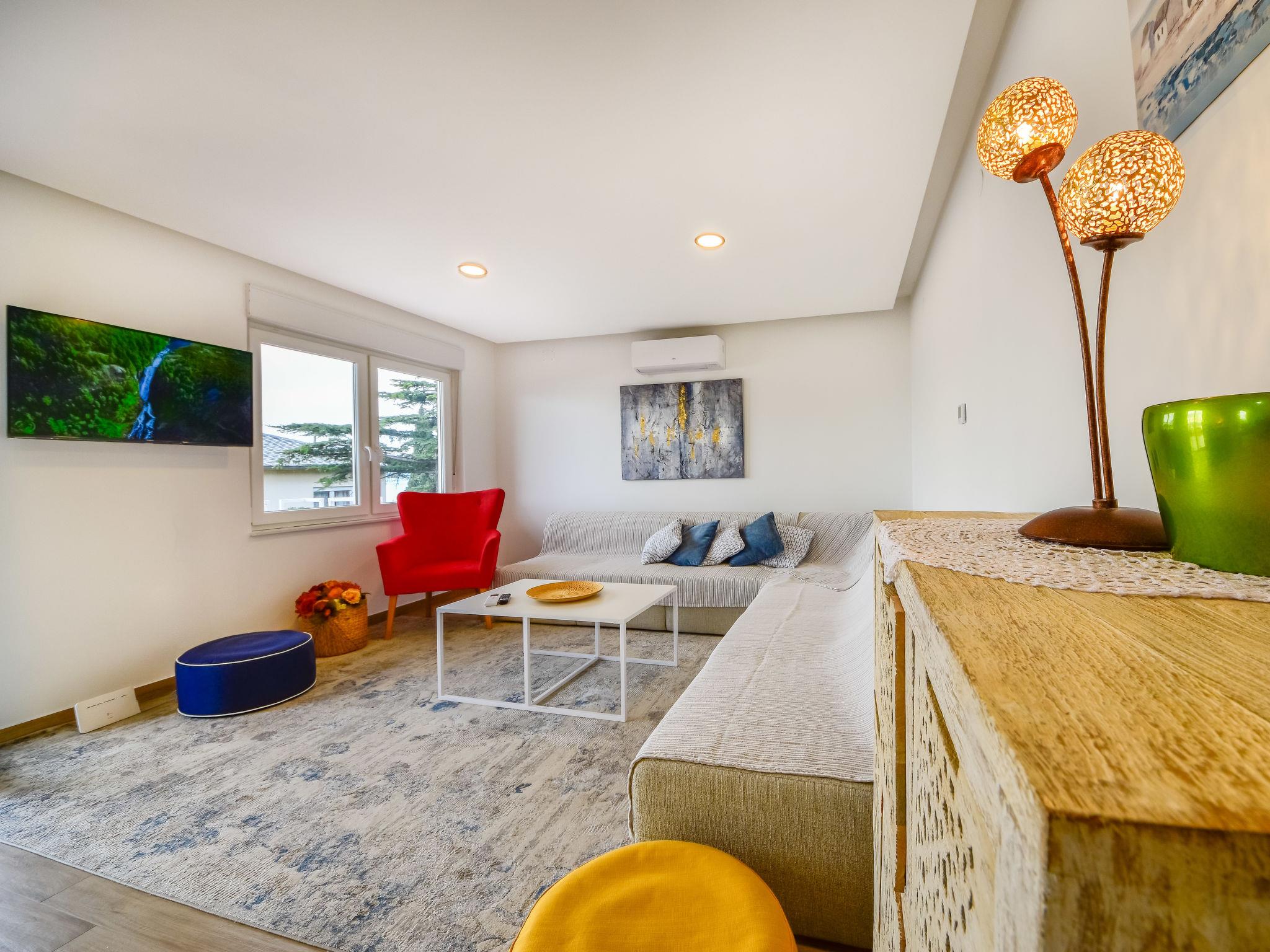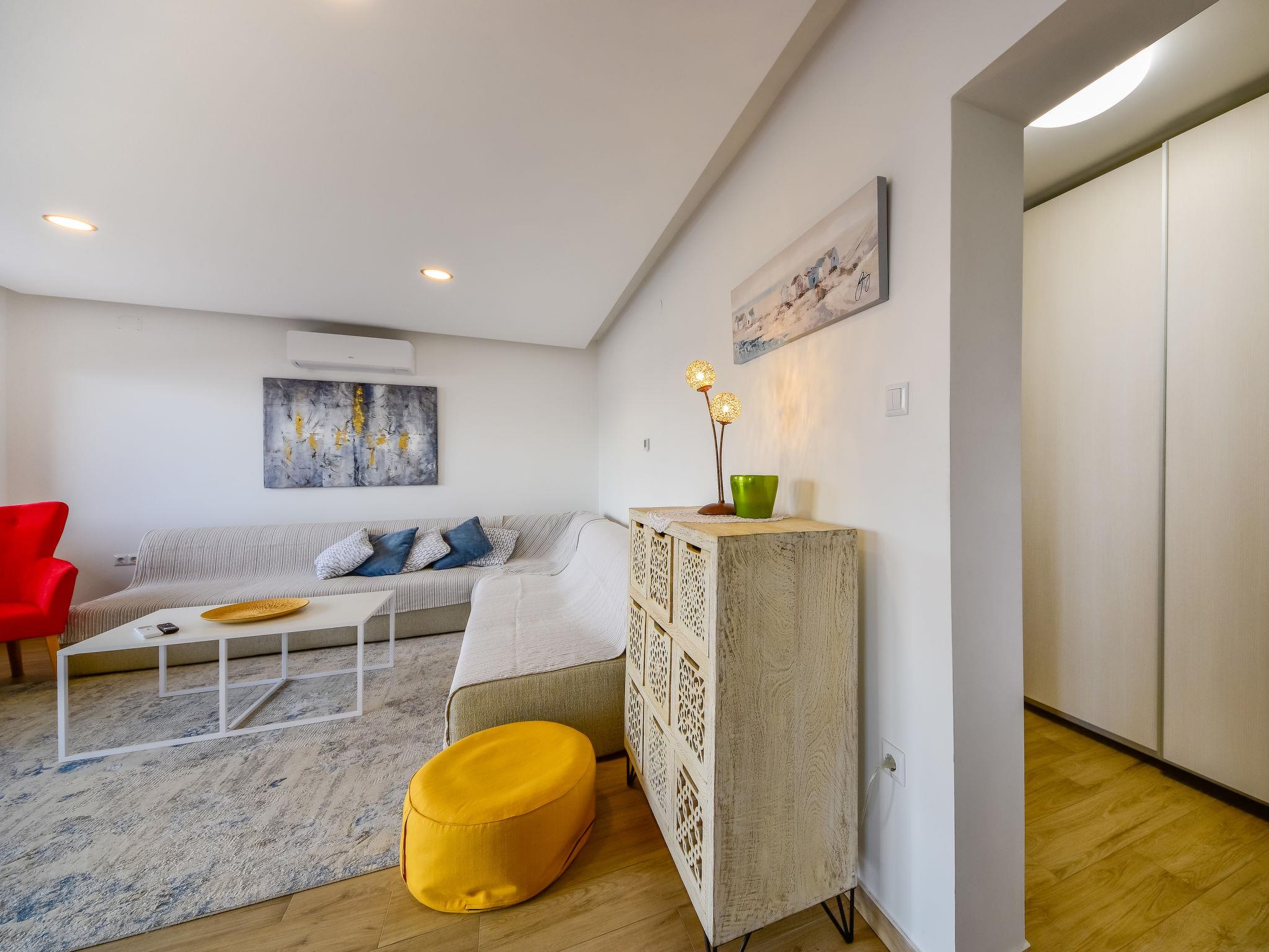 2-room apartment 85 m2 on 1st floor. Spacious, fully renovated in 2023, comfortable furnishings: living/dining room 20 m2 with digital TV and air conditioning. Exit to the terrace. 1 room with 1 bed (90 cm, length 200 cm), 1 double bed (200 cm, length 200 cm). Open kitchen (oven, dishwasher, 4 ceramic glass hob hotplates, kettle, freezer). Bath/shower/WC. Electric heating, floor heating. Heating available only from 01.10. to 01.05. Terrace 20 m2 partly roofed. Terrace furniture. Beautiful panoramic view of the sea. Facilities: Internet (WiFi, free). Please note: TV only HR.