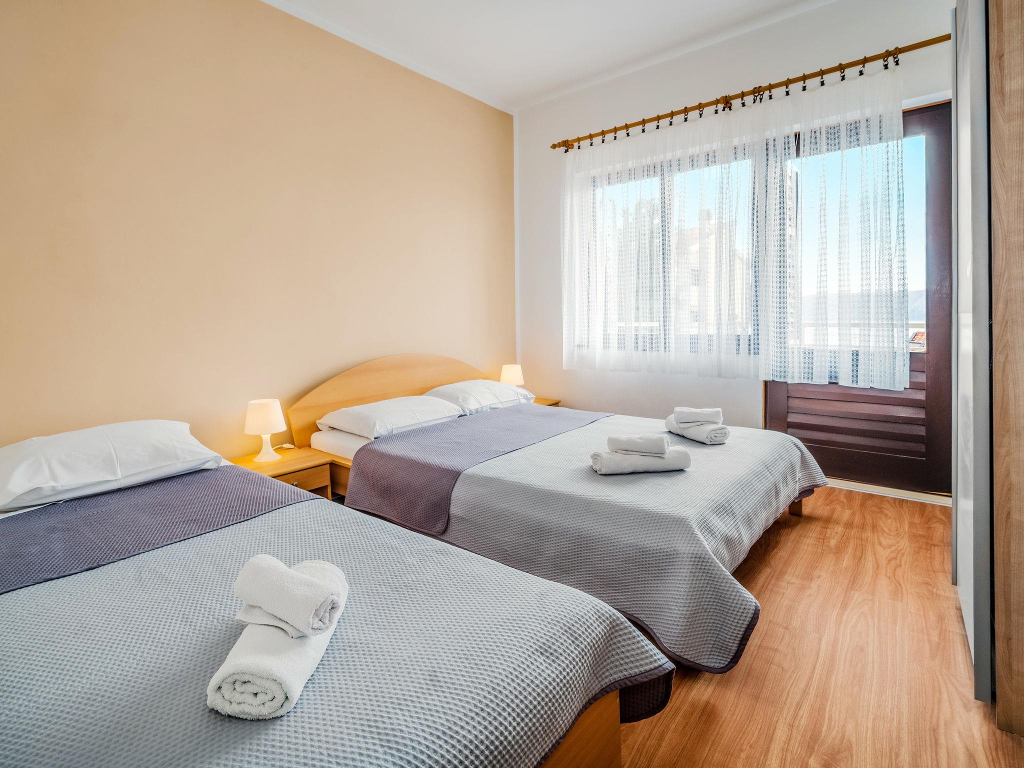 "Monja", 3-room apartment 75 m2 on 1st floor. Beautiful furnishings: living room with satellite TV and air conditioning. Exit to the balcony. 1 room with 1 french bed (140 cm, length 200 cm). 1 room with 1 french bed (160 cm, length 200 cm). Open kitchen (oven, dishwasher, 4 ceramic glass hob hotplates, toaster, kettle, microwave, freezer, electric coffee machine) with dining table. Shower/WC, sep. WC. No heating option. Balcony 15 m2. Balcony furniture. View of the sea. Facilities: washing machine, iron. Internet (WiFi, free). Parking (1 car). Please note: non-smokers only. Maximum 1 pet/ dog allowed.