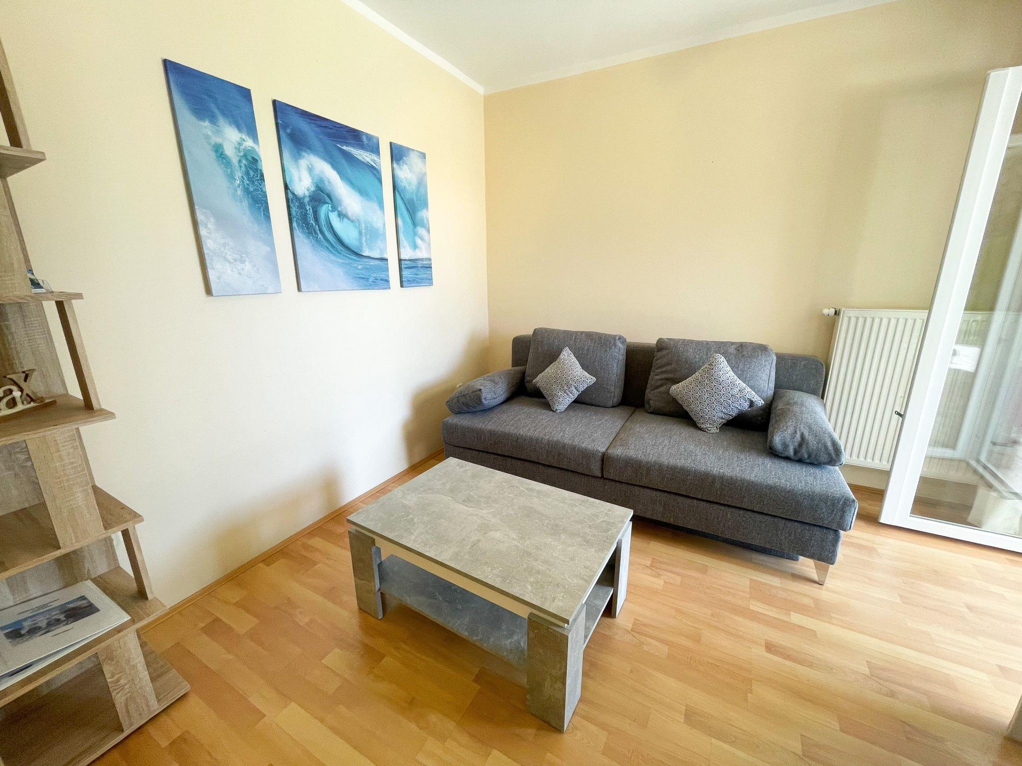 Our ground floor holiday flat includes a cosy living room with a sofa bed and a TV with satellite connection, ideal for relaxing evenings after a sun-filled day. For your convenience, there is a small but cosy kitchenette with a 2-ring induction hob, dishwasher and kettle. An additional cupboard in the hallway offers plenty of storage space for your holiday equipment.