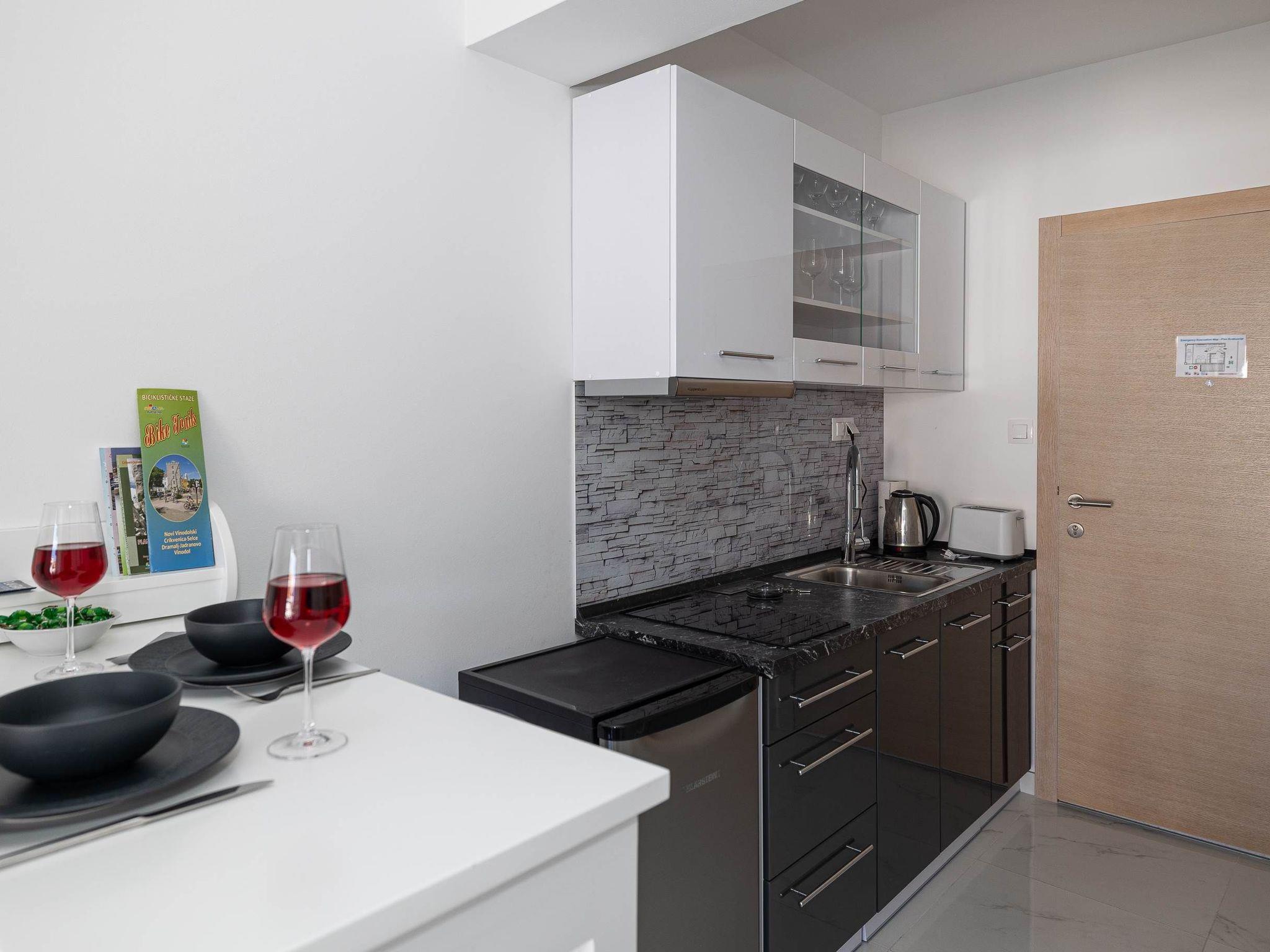 Inside, the 24 m² studio apartment is thoughtfully arranged to maximize space and comfort. The integrated living, bedroom, and dining area ensure a seamless living experience, complemented by the convenience of air conditioning throughout the space. For your culinary needs, the kitchenette is equipped with a 2-plate stove, filter coffee machine, electric kettle, and mini oven, allowing you to prepare simple meals with ease. The sofa bed accommodates two guests comfortably, and the bathroom comes equipped with a shower, ensuring your stay is both comfortable and convenient.