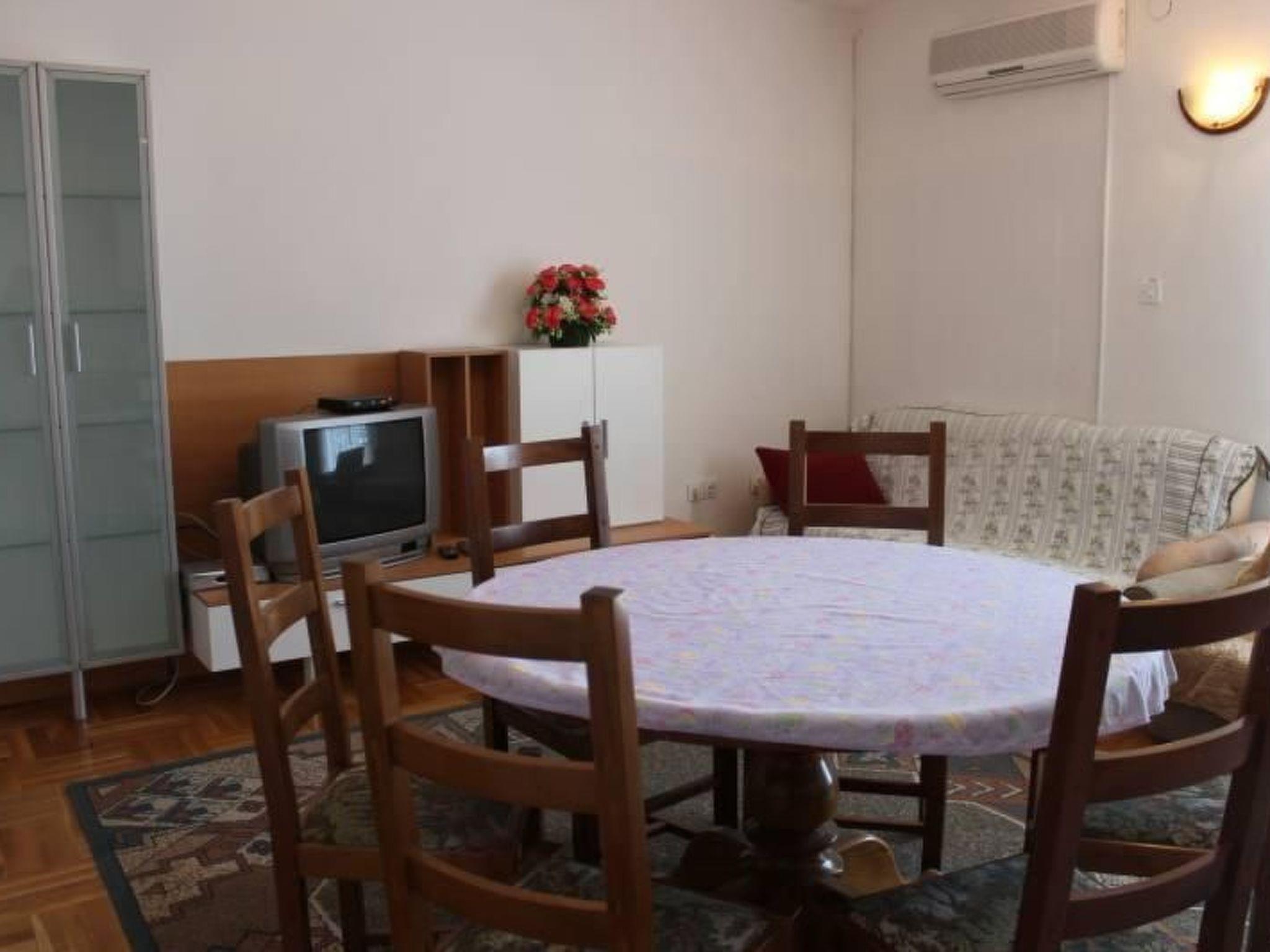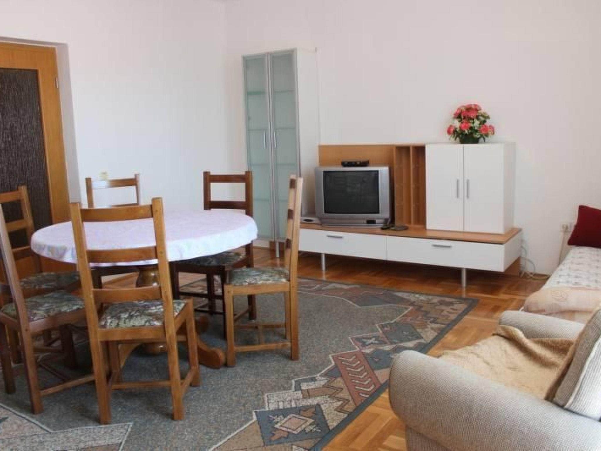 Living room, dining room and kitchen are one unit; dining table and chairs for every person; additional two. Sleep poss. on an additional bed, one additional option. Sleep poss. on a sofa, with balcony