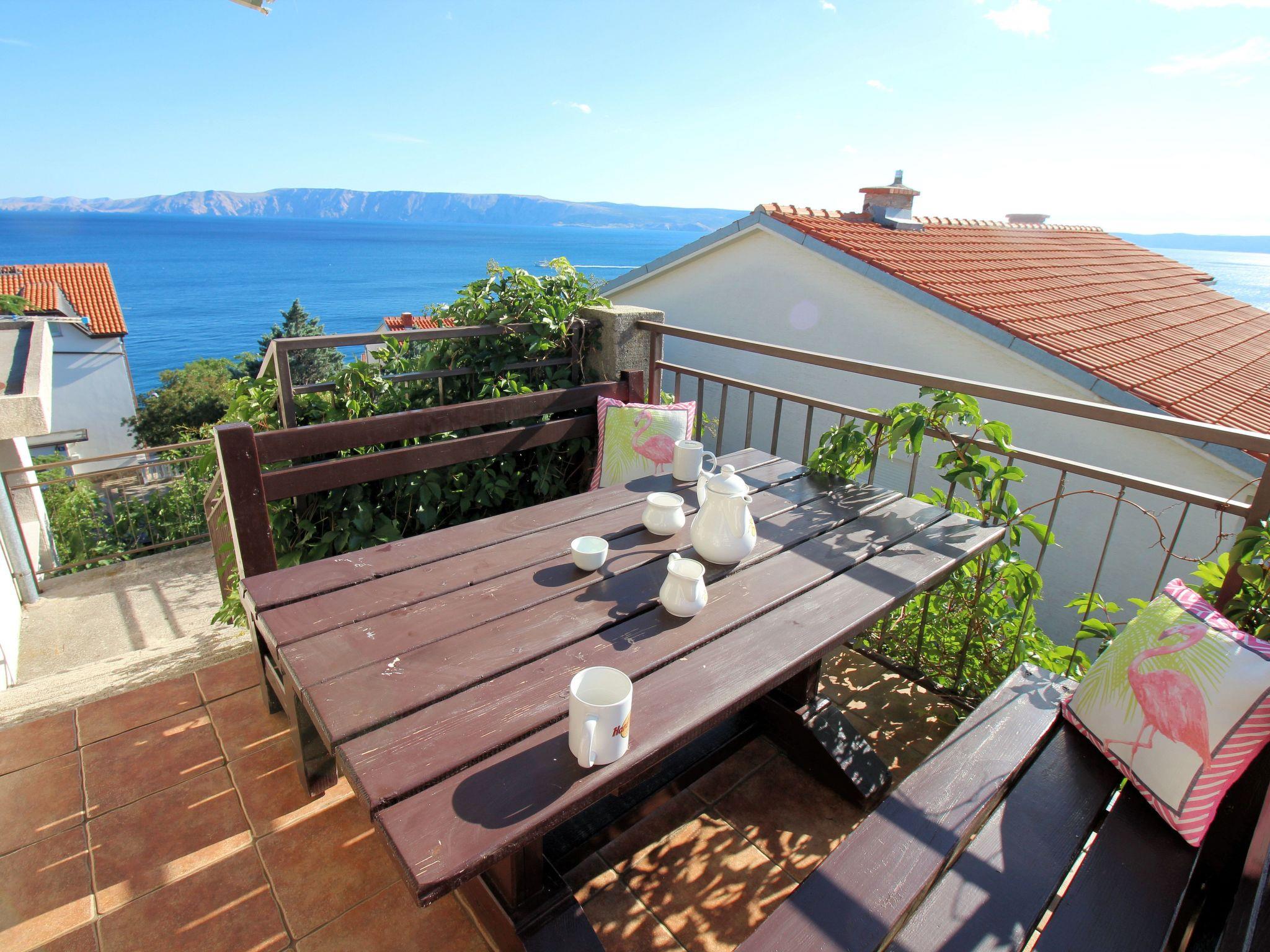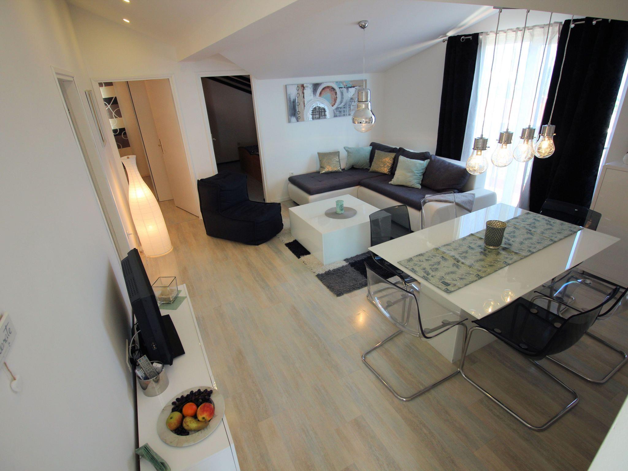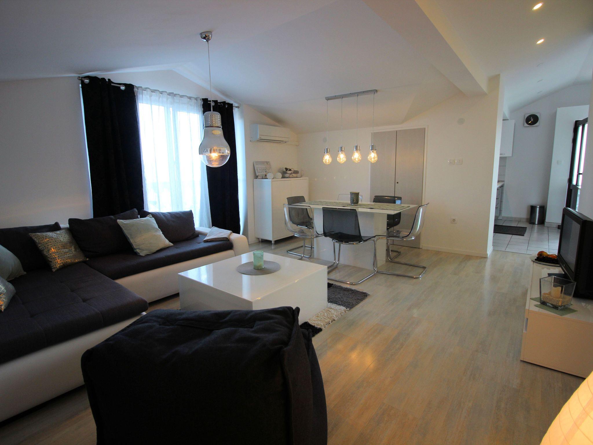 The apartment is located just 180 meters from one of the beautiful beaches. From the balcony you have a breathtaking view. It is located in the picturesque coastal town of Novi Vinodolski and is only 3 minutes from the beach. It is luxuriously furnished in a minimalist style and has a total area of ??82 m². This is divided into three bedrooms, a living room, a kitchen, a dining room, a bathroom and a balcony from which you can enjoy a breathtaking view of the sea. Capacity 4 + 1 people. The main bedroom has a double bed. The second bedroom has a double bed, the third room has two single beds that can be joined. The living room is connected to the kitchen (fully equipped) and dining room and from there you can also access the 12 m² balcony. The living room has air conditioning. You have your own parking space on the property, free Wi-Fi and there is a communal garden with a barbecue which can also be used.