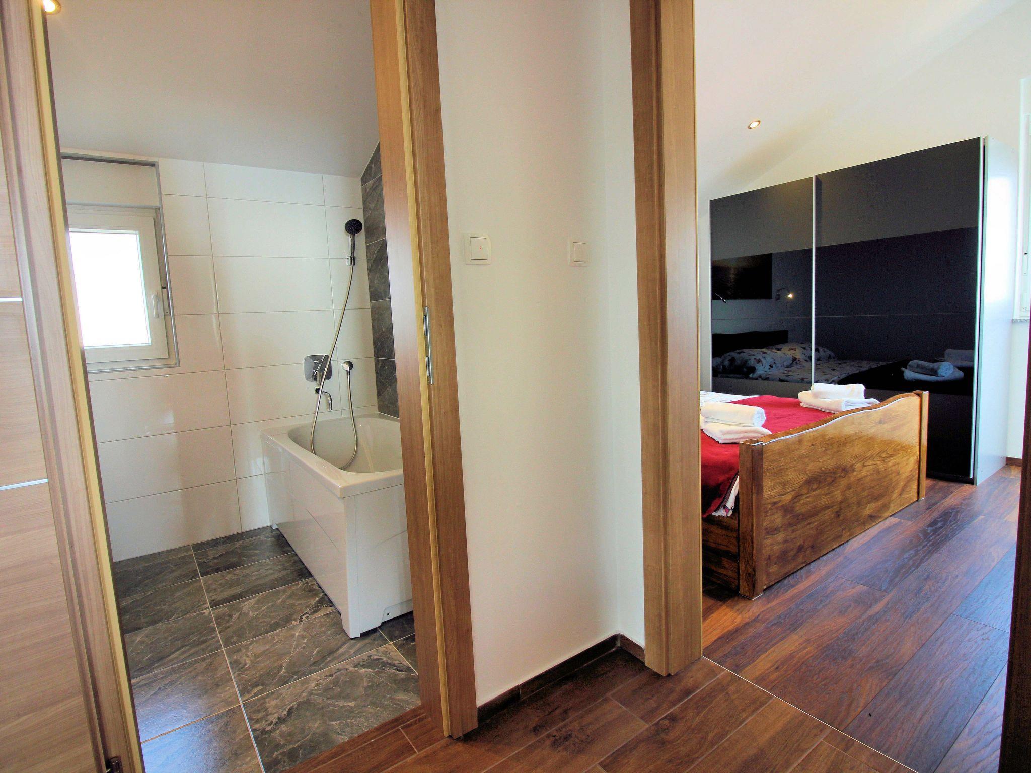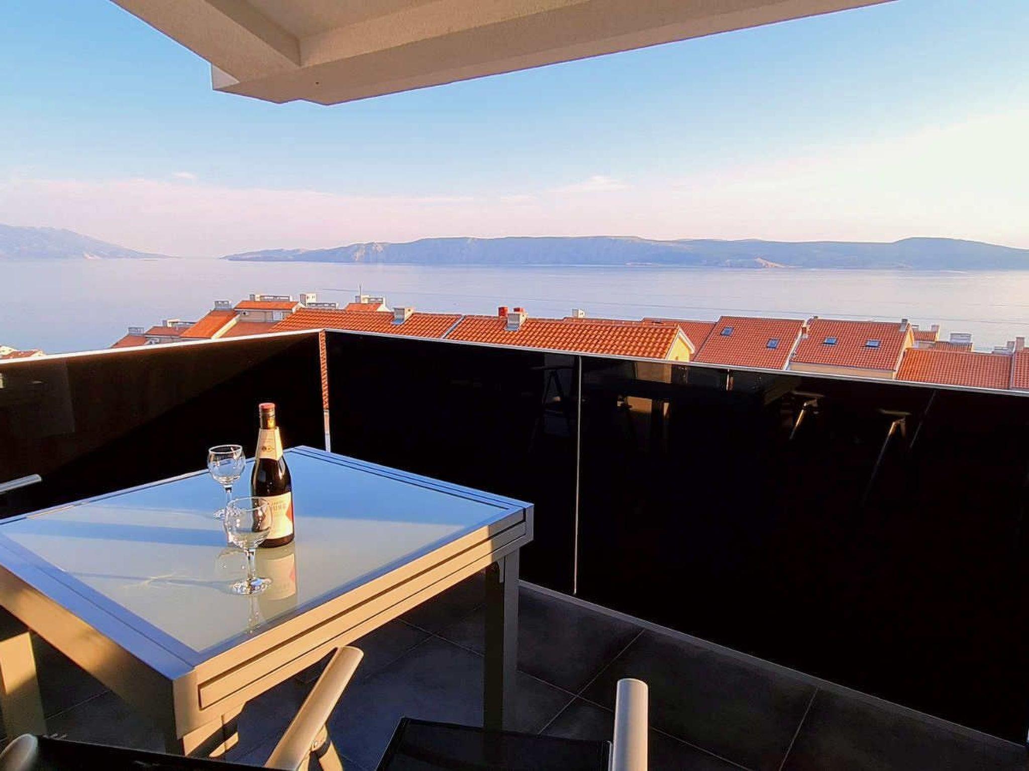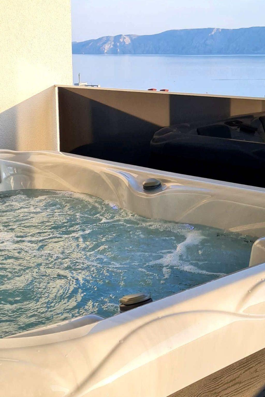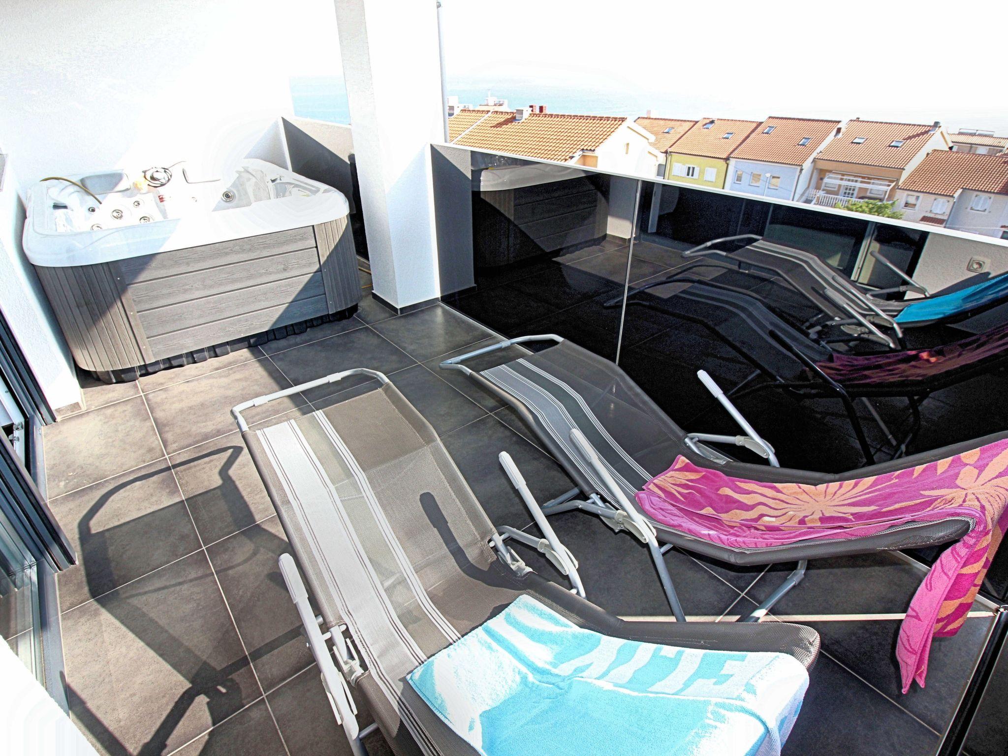 Stepping outside, the apartment extends its offerings with two captivating balconies and a spectacular roof terrace. The balconies, perfect for early morning coffees or evening relaxation, offer stunning views of the sea and the island of Krk. The roof terrace, however, is a tranquil haven of its own. It's furnished with a table, chairs, and two comfort loungers and features a private jacuzzi. This exclusive space invites guests to unwind under the sky, whether it's enjoying the whirl of the jacuzzi or simply soaking in the picturesque surrounds.