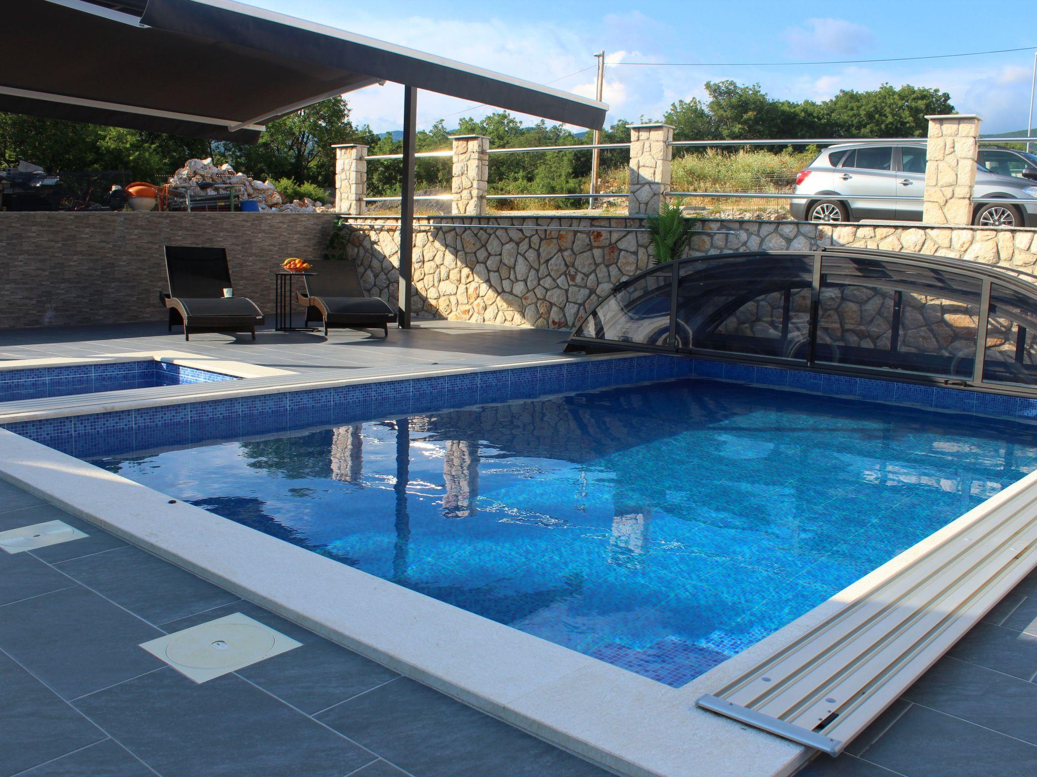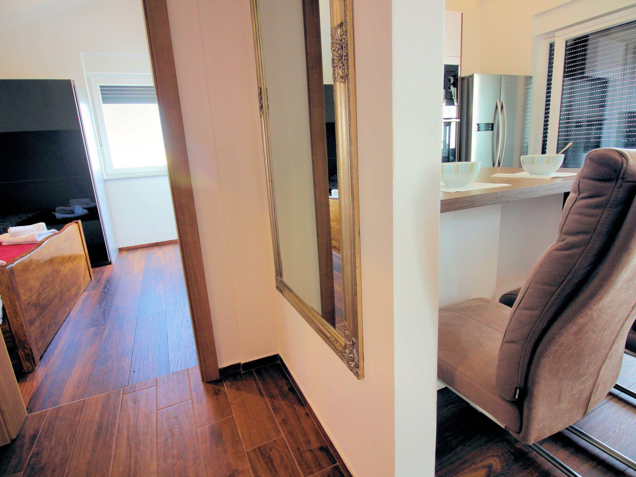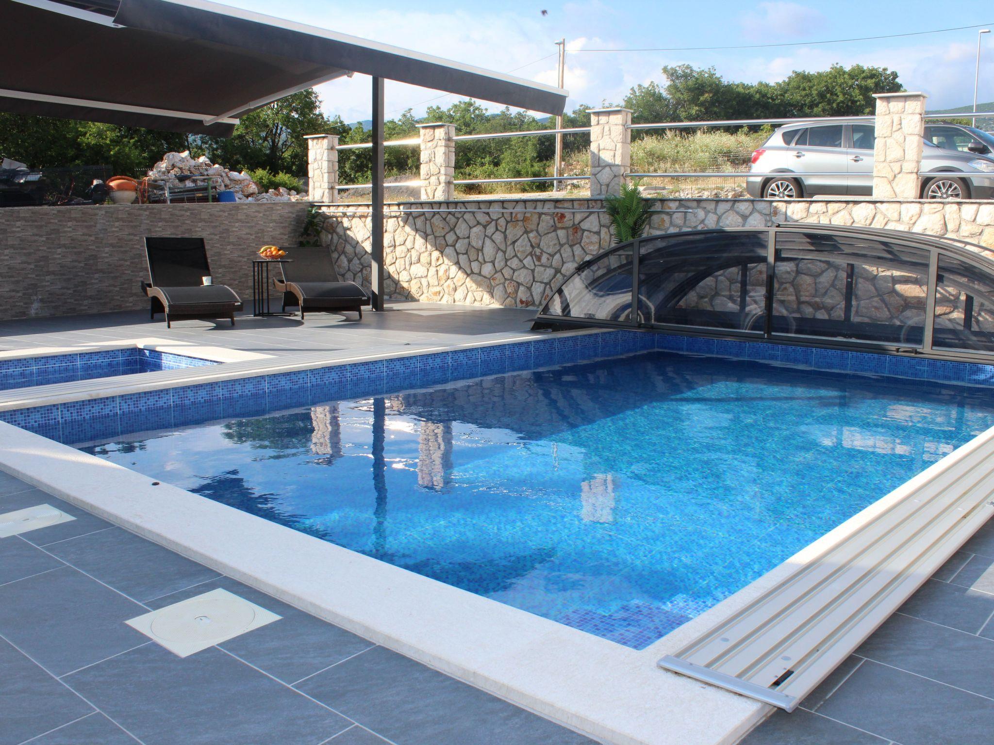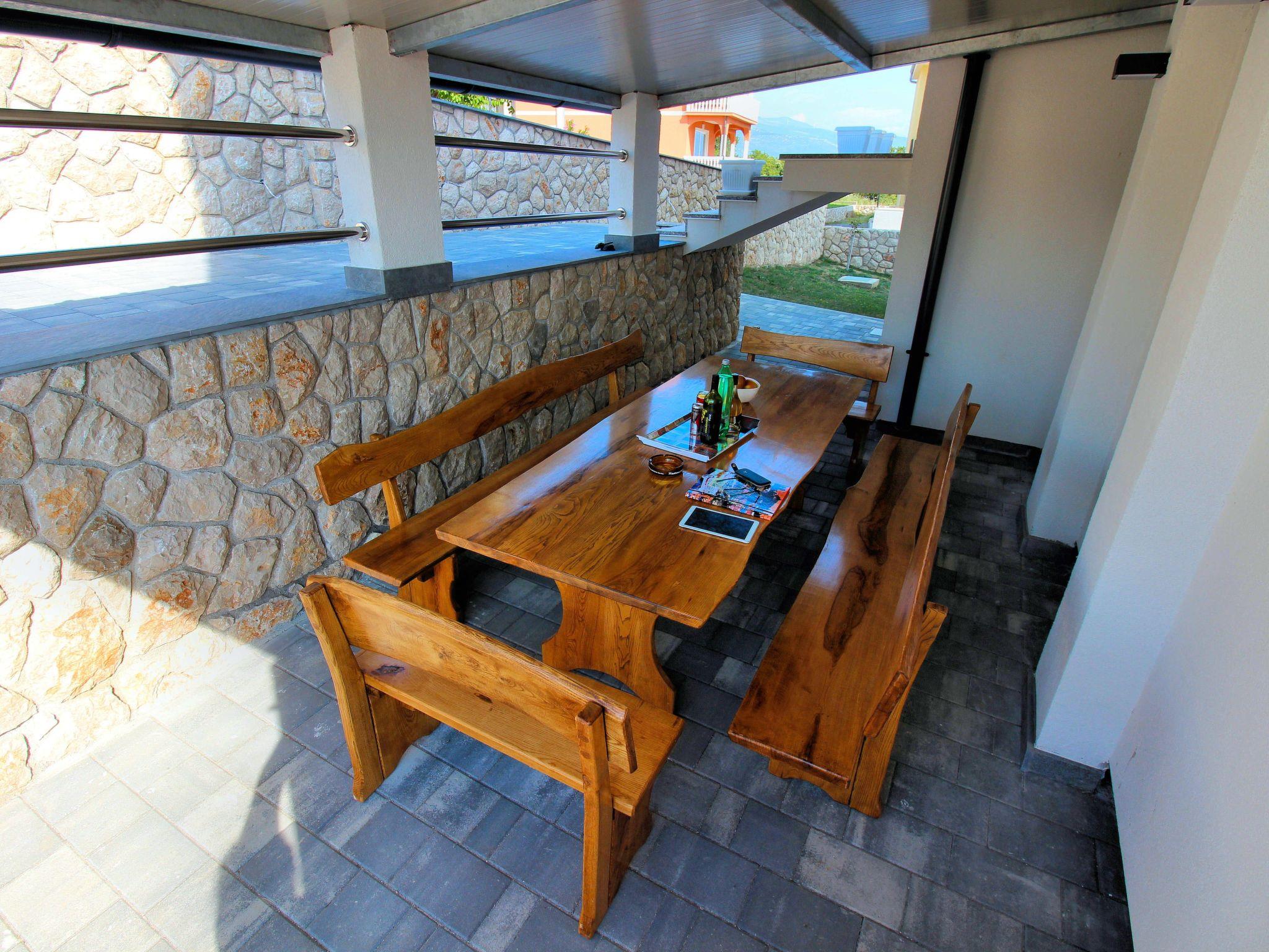 Stepping outside, the apartment extends its offerings with two captivating balconies and a spectacular roof terrace. The balconies, perfect for early morning coffees or evening relaxation, offer stunning views of the sea and the island of Krk. The roof terrace, however, is a tranquil haven of its own. It's furnished with a table, chairs, and two comfort loungers and features a private jacuzzi. This exclusive space invites guests to unwind under the sky, whether it's enjoying the whirl of the jacuzzi or simply soaking in the picturesque surrounds.