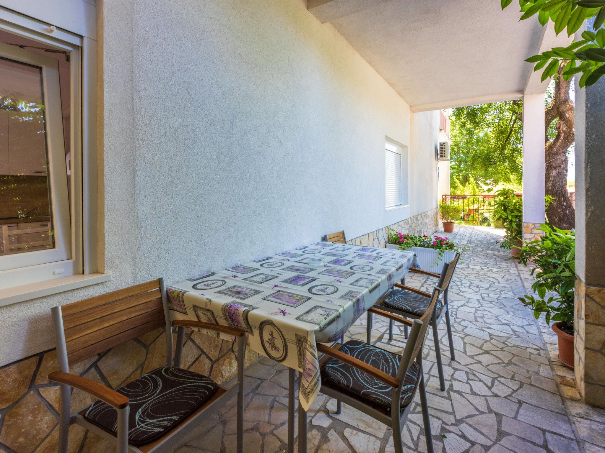 DETAILED DESCRIPTION:Living area:Living / dining room and kitchen are in one room, sofa bed for two people, terrace, tiles, TVKitchen description:Kitchen, dishes, kitchen towels, electric cooker, hotplates: 4, refrigerator with freezer, kettle, microwave, toaster, dishwasherBedroom:Double room with double bed, tilesBathroom:Bathroom with toilet, showerBalcony / Terrace:own terrace, roofed, seating, terrace size: 20 m²Miscellaneous:garden for use, barbecue, parking in the yard, pets not allowed, air-condition included in price, owner lives in the same house, bed linen available, towels available, hairdryer, washing machine, Internet via W-LAN,