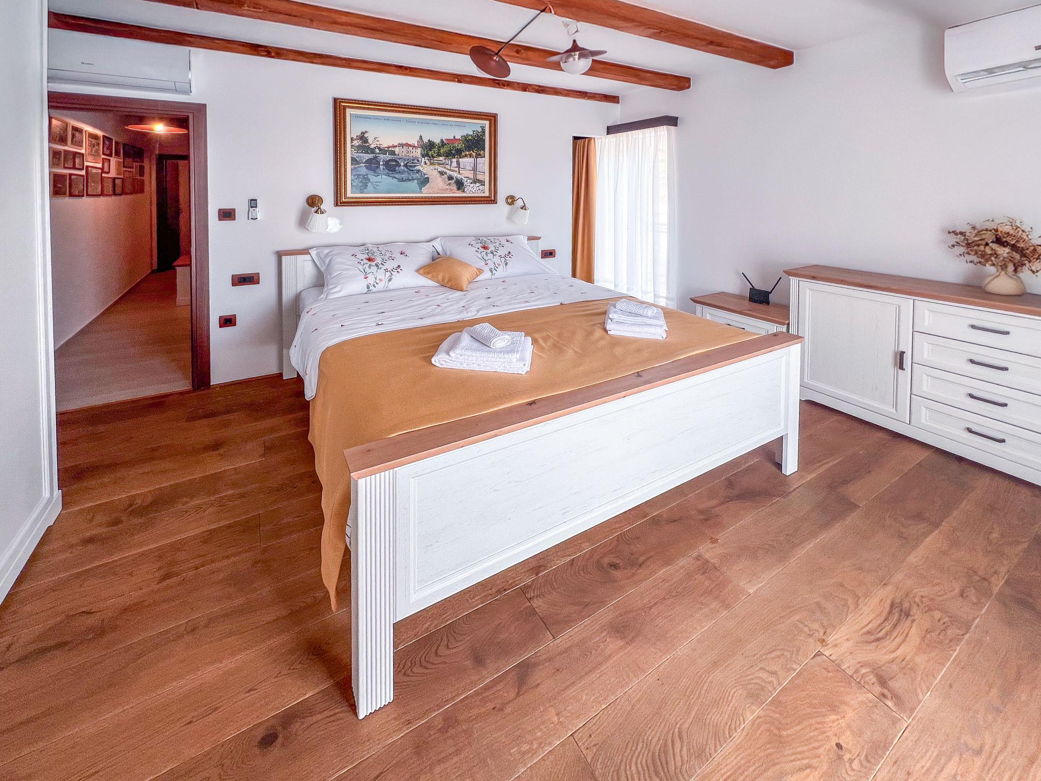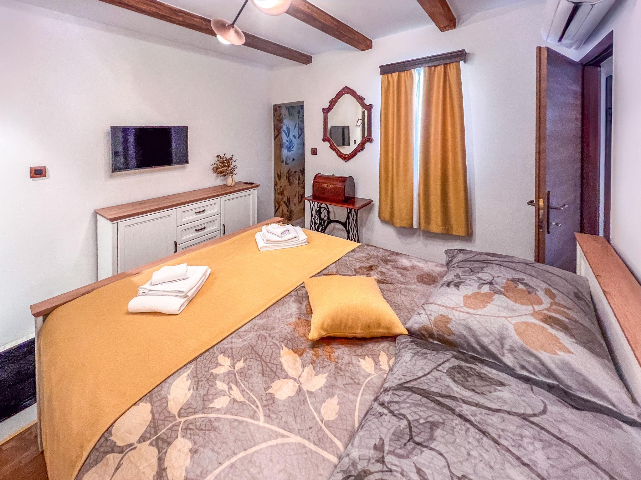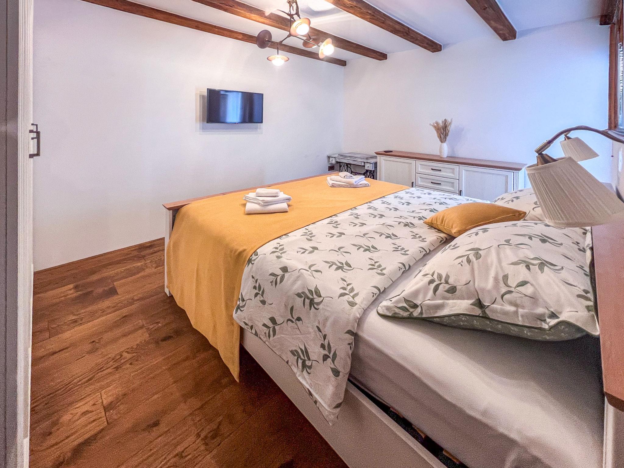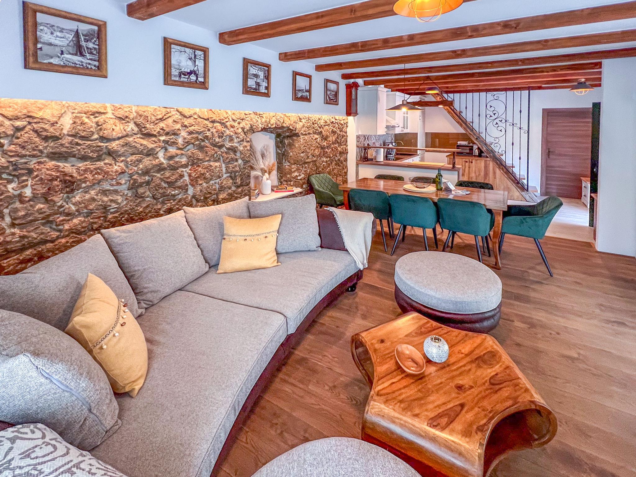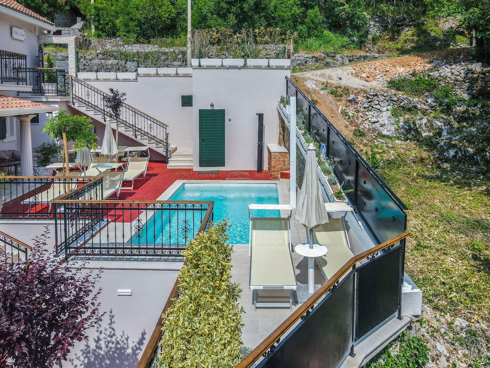 Gornji Zagon: Single-family house "Vila Jurja", 3 storeys, renovated in 2025. Above Novi Vinodolski 16 km from the centre of Novi Vinodolski, 15 km from the sea, in the countryside. Private: property 350 m2 (fenced), swimming pool angular, heated (5 x 3 m, depth 135 cm, seasonal availability: 01.May. - 30.Sep.) with internal staircase and shutter cover. Outdoor shower, barbecue, pool maintenance by the owner/gardener. In the house: internet access, table football, washing machine, tumble dryer. Narrow motor access to the house. Parking (for 3 cars) at the house on the premises. Shop 15 km, restaurant 4 km, café 4 km, bus stop 4 km, pebble beach 15 km.