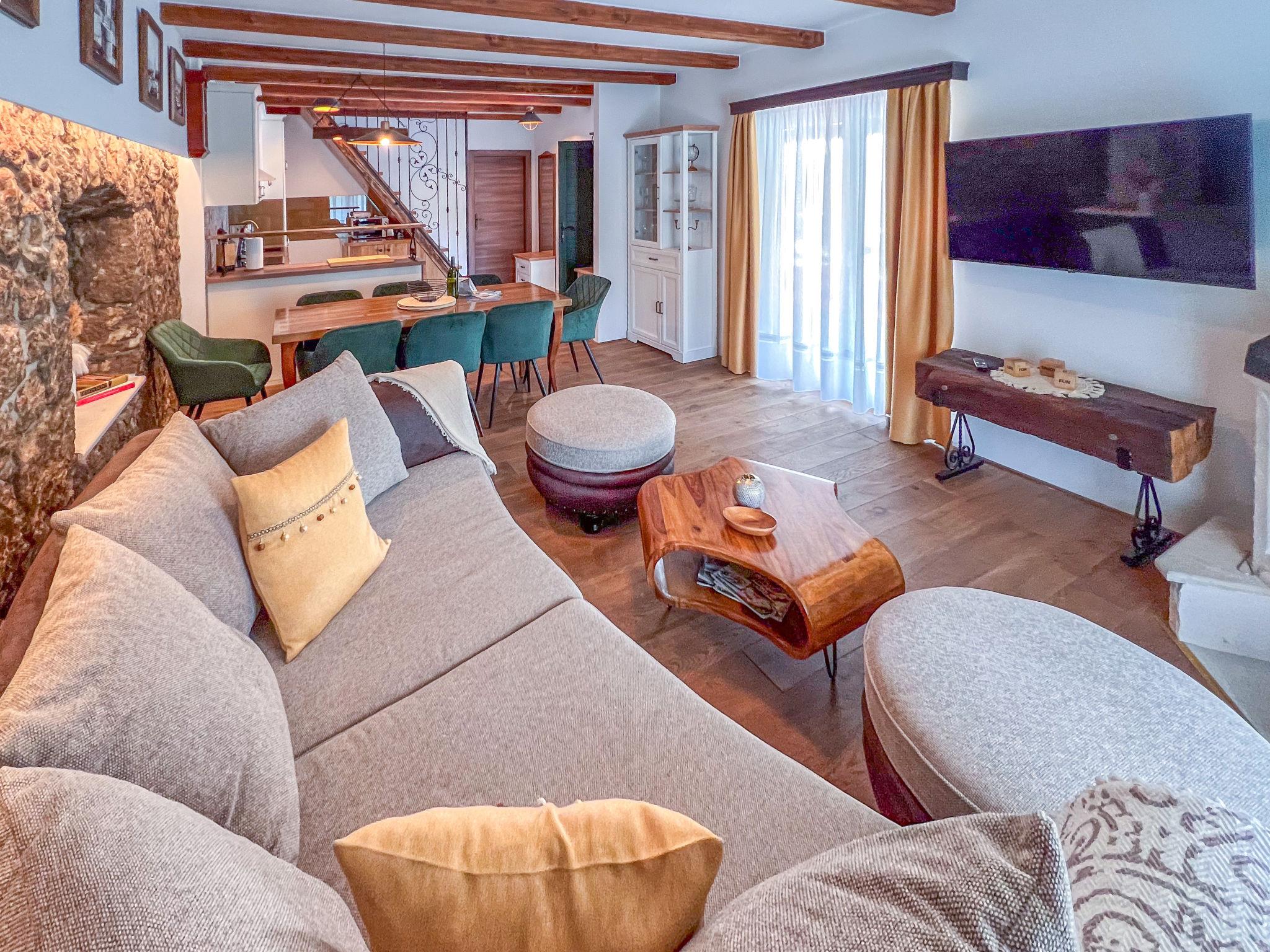 5-room house 110 m2 on 3 levels. Rustic furnishings: living/dining room with 1 double sofabed (140 cm, length 190 cm), open-hearth fireplace and satellite TV (flat screen), air conditioning. Exit to the terrace. 1 room with 1 french bed (160 cm, length 200 cm), shower/WC and satellite TV (flat screen), air conditioning. Open kitchen (oven, dishwasher, 4 ceramic glass hob hotplates, toaster, kettle, microwave, freezer, electric coffee machine). Wood heating, forced-air heating. Heating available only from 01.09. to 31.05. Upper floor: 1 room with 1 french bed (180 cm, length 200 cm), shower/WC and satellite TV (flat screen), air conditioning. Exit to the balcony. 1 room with 1 french bed (180 cm, length 200 cm), bath/shower/WC and satellite TV (flat screen), air conditioning. Exit to the balcony. Forced-air heating. Heating available only from 01.09. to 31.05. 2 small balconies 3 m2, terrace 25 m2, roofed. Terrace furniture. View of the swimming pool and the forest. Facilities: safe, iron, mosquito net, children's high chair, baby cot, hair dryer. Internet (WiFi, free). Please note: maximum 1 pet/ dog allowed. Fire extinguisher.