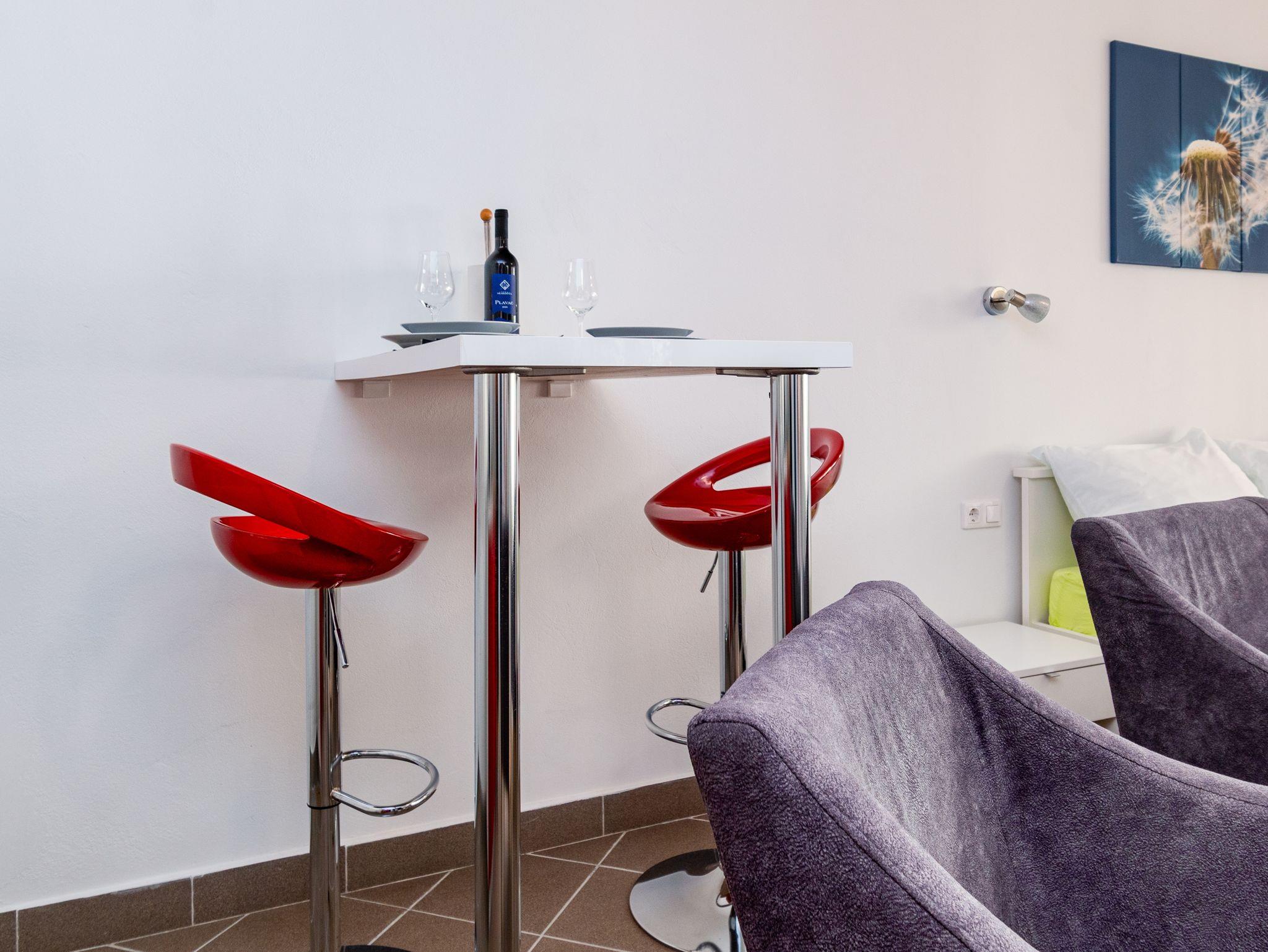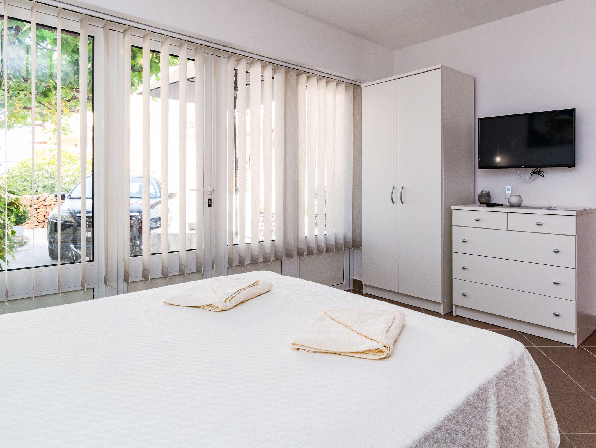 Studio bietet Platz für 2 Gäste. Die Betten sind in Schlafzimmern, die es 1 gibt, innerhalb einer Gesamtfläche von 26m2, angeordnet. Die Gäste haben eine eigene Terrasse zur Verfügung, auf der sie in warmen Sommernächten genießen können. Es ist erlaubt, Speisen auf dem Gemeinschafts-Grill vorzubereiten. IM PREIS INBEGRIFFEN: Kurtaxe, Endreinigung, Klimatisierung, Parkplatz, Internet, Bügeleisen, Bügelbrett, Föhn, tragbarer Grill. VERBINDLICHE ZUSÄTZLICHE KOSTEN: Aufzahlung für Kurzaufenthalte (prozentualer Zuschlag pro Nächtigungsanzahl: 30% - 1, 20% - 2, 10% - 3). UNVERBINDLICHE ZUSÄTZLICHE KOSTEN: Wäschewaschen (5,00 € Waschen). Die Verfügbarkeit zusätzlicher Dienstleistungen in Ihrem reservierten Termin und die Preise derselben (falls nicht aufgeführt) müssen im Voraus überprüft werden. Zusätzliche Dienstleistungen die in der Zahlungsaufforderung nicht aufgeführt sind werden direkt beim Vermieter bezahlt, angenommen der Gast nutzt auch diese.