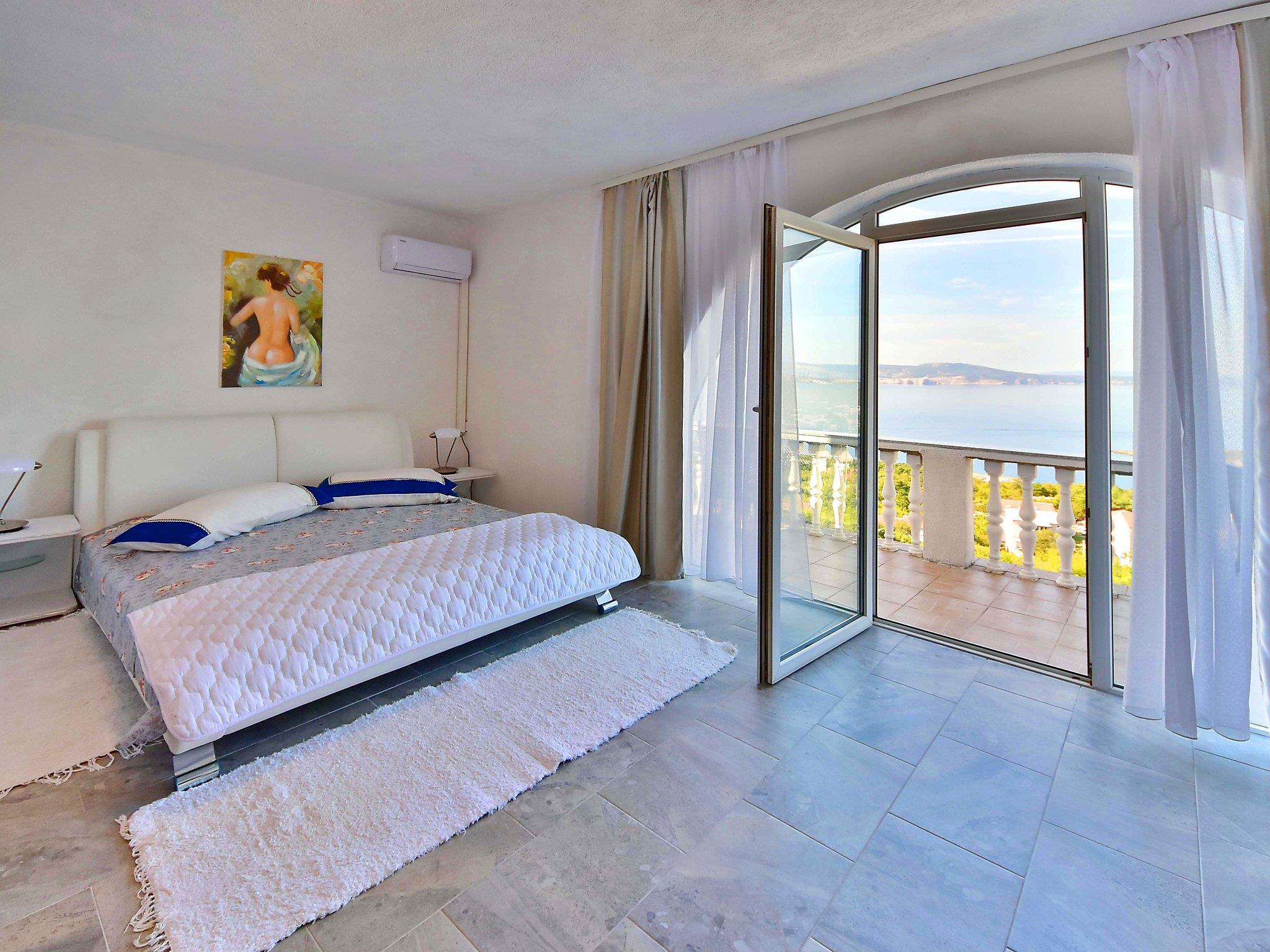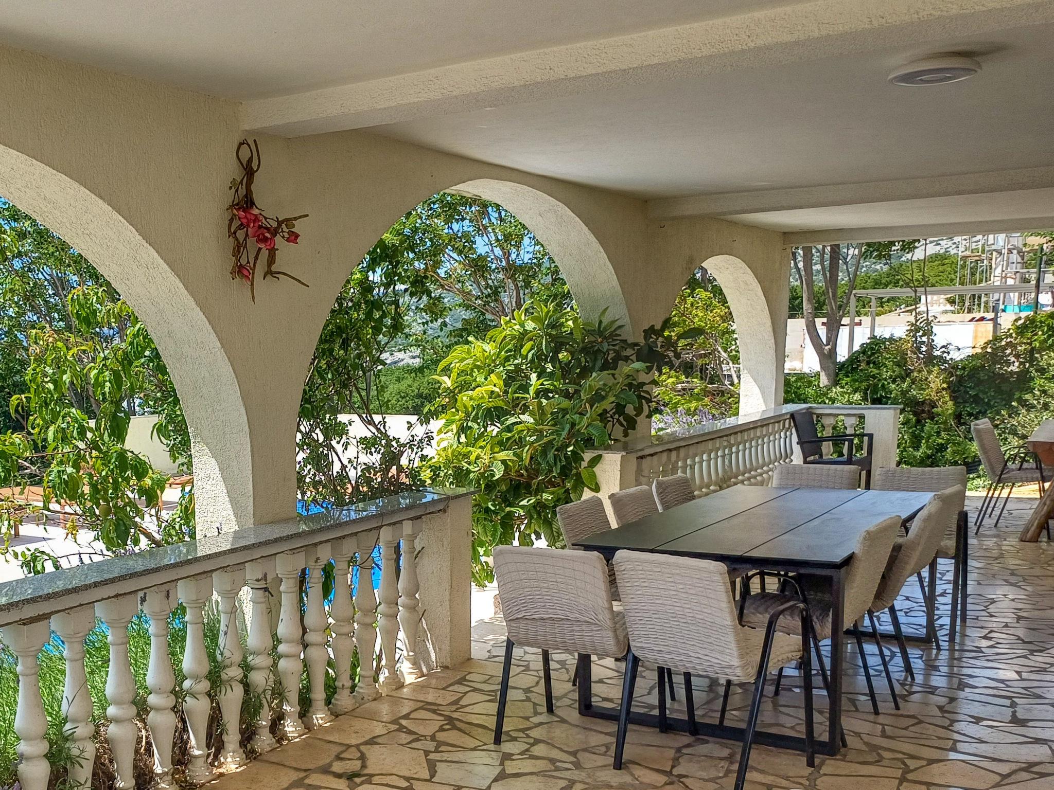 8-room house 300 m2 on 2 levels, south facing position. Living/dining room 35 m2 with cable TV (flat screen), air conditioning. Exit to the terrace. Walk-through room with 1 french bed (160 cm, length 200 cm), shower/WC and air conditioning. 1 room with 1 french bed (160 cm, length 200 cm). Open kitchen (oven, dishwasher, 4 ceramic glass hob hotplates, microwave, freezer, electric coffee machine). Shower/WC. On the lower ground floor: shower/WC. Upper floor: (exterior staircase), 2 rooms, each room with 1 french bed (160 cm, length 200 cm), shower/WC and air conditioning. Exit to the balcony. 1 room with 2 french beds (160 cm, length 200 cm), shower/WC and air conditioning. 1 room with 1 french bed (160 cm, length 200 cm), shower/WC. 1 double bedroom. No heating option. Balcony 22 m2, terrace 33 m2 partly roofed, terrace 40 m2. Terrace furniture, deck chairs. Marvellous panoramic view of the sea. Facilities: Internet (WiFi, free). Parking (5 cars). Maximum 1 pet/ dog allowed. On the lower ground floor: room with sauna, hydro massage bath, shower/WC, exit to the covered terrace (27 m2, terrrace furniture).