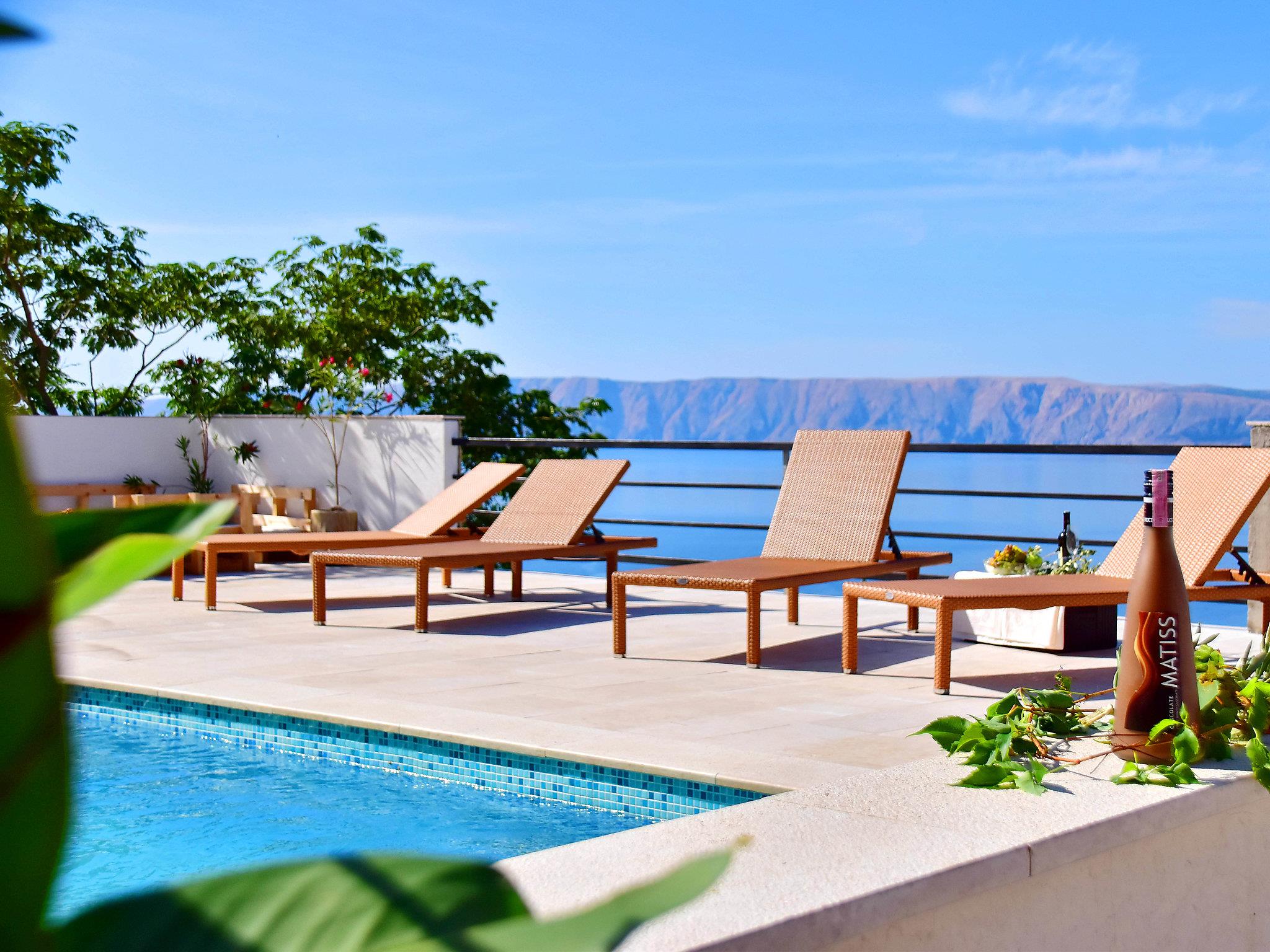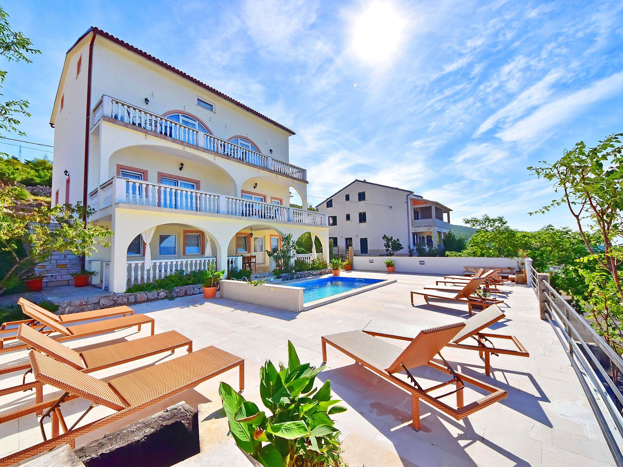 Klenovica 8 km from Novi Vinodolski: Single-family house "Stana", 2 storeys. 1.5 km from the centre of Klenovica, in a sunny, elevated position, 1.5 km from the sea, 2 km from the beach. Private: property 650 m2, swimming pool angular (7 x 3 m, 24 m2, depth 150 cm, seasonal availability: 01.May. - 30.Sep.). Terrace (27 m2), garden furniture, barbecue. In the house: internet access, sauna, hot tub, washing machine. Parking (for 5 cars) at the house on the premises. Shop 1.4 km, restaurant 1.3 km, bus stop 270 m, pebble beach 2 km, rocky beach 2 km, concrete beach 2 km. Part of the house is closed and unoccupied.