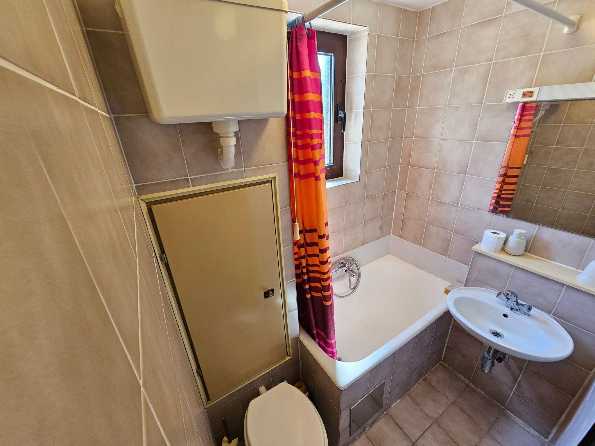 Inside, the apartment is thoughtfully equipped to meet all your needs. On the ground floor, the open-plan kitchen and dining-living area feature a cozy couch that doubles as an extra bed for one, alongside a convenient toilet with a washing machine. The space is partially air-conditioned, ensuring comfort during warmer days. The kitchen comes complete with a gas cooker, coffee machine, and electric kettle, making meal preparation a breeze. Venture up to the first floor to find two inviting bedrooms, one with a double bed and a balcony, and the other with two single beds. A loggia and a bathroom with a bathtub add to the indoor comforts, creating a haven of relaxation after a day of adventures.