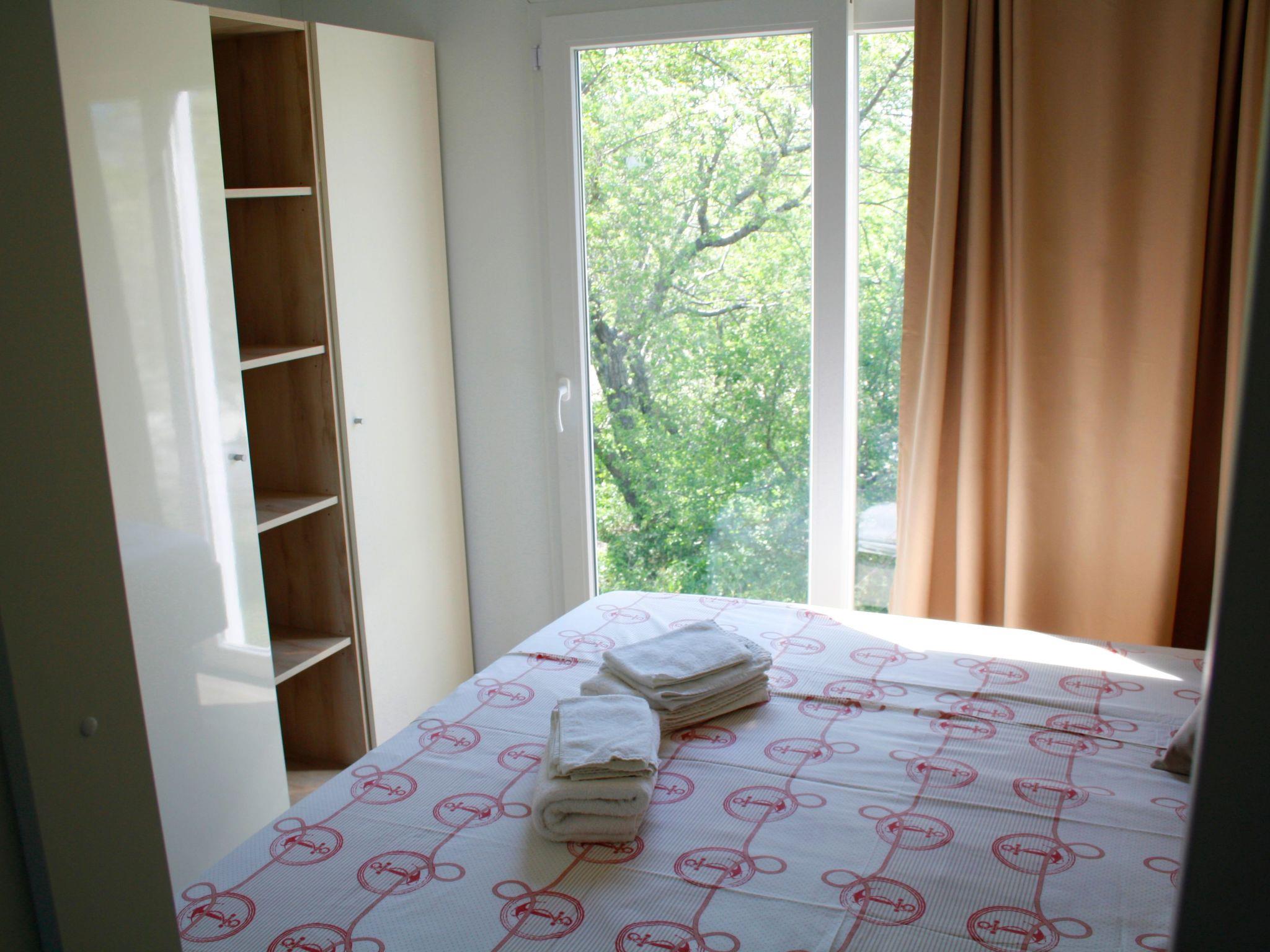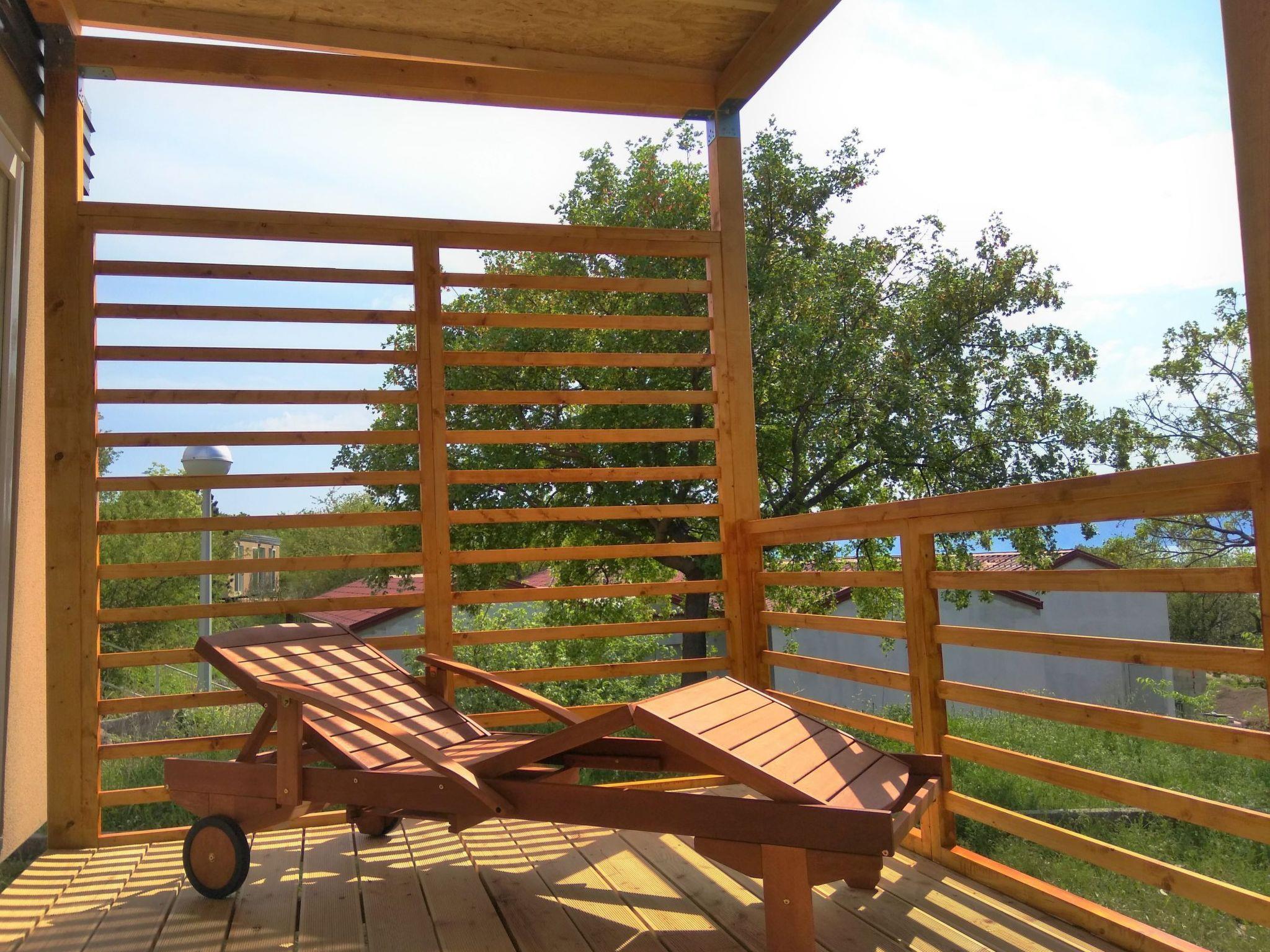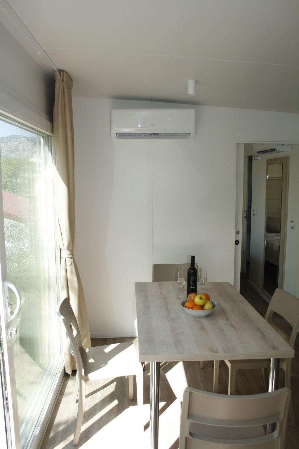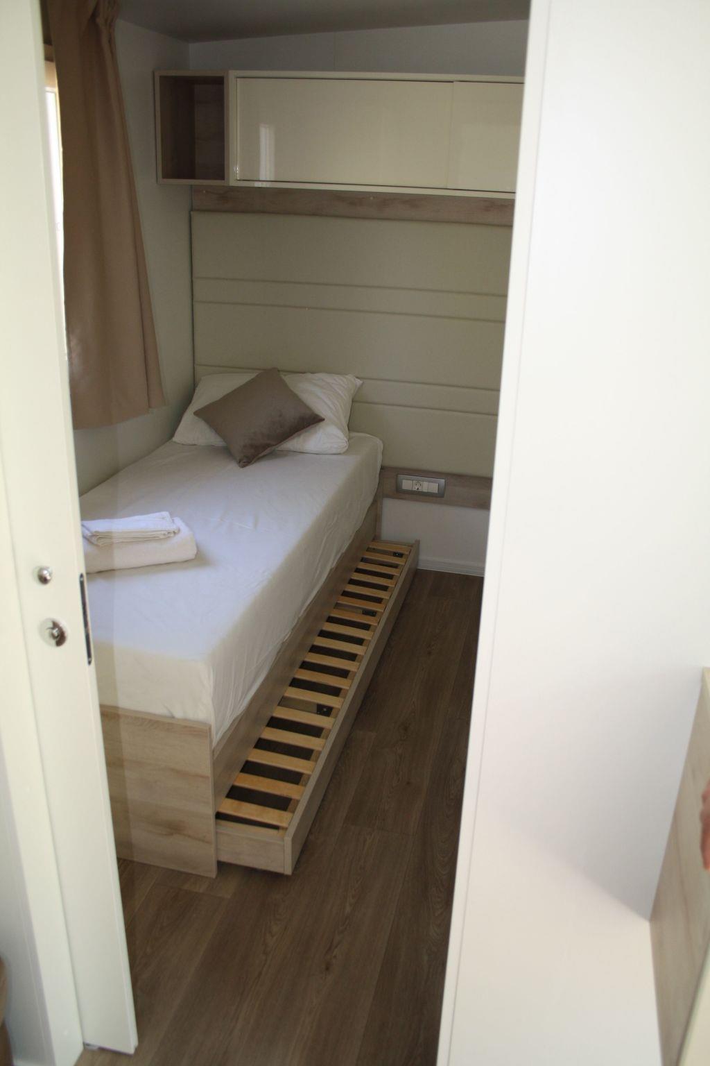 Typ QUEEN CAMPAGNA 4+2 Premium zone Surface 38,80 m²; Manufacture year: 2017 Number of bedrooms: 2 (1 with double bed, 1 with 2 single beds) Kitchen/Living room (additional bed on corner furniture ) Bathroom/ Toilets : 2; Air conditioning; Wooden terrace Additional equipment: table + chairs on terrace, coffee machine, electric kettle, TV, microwave