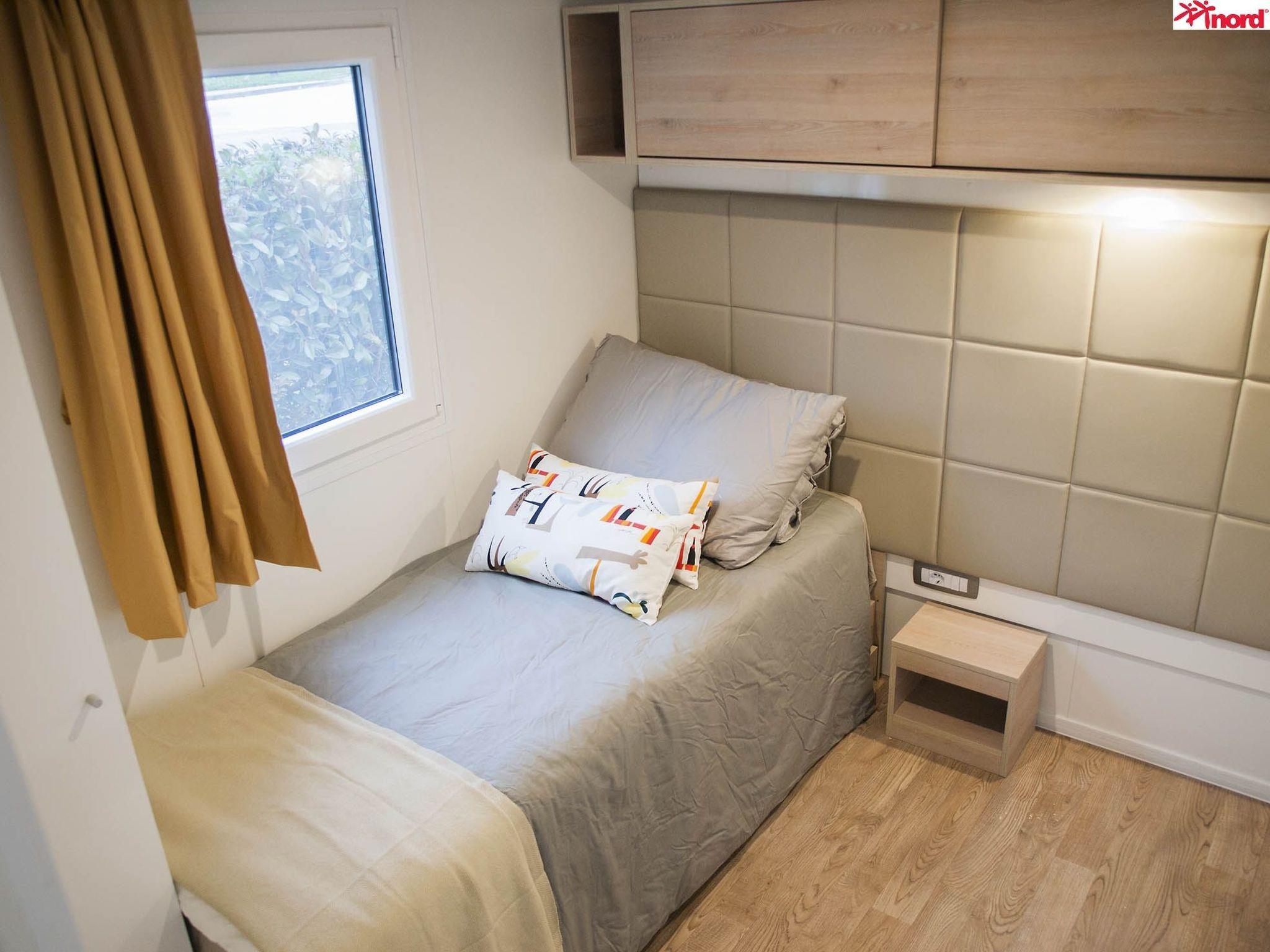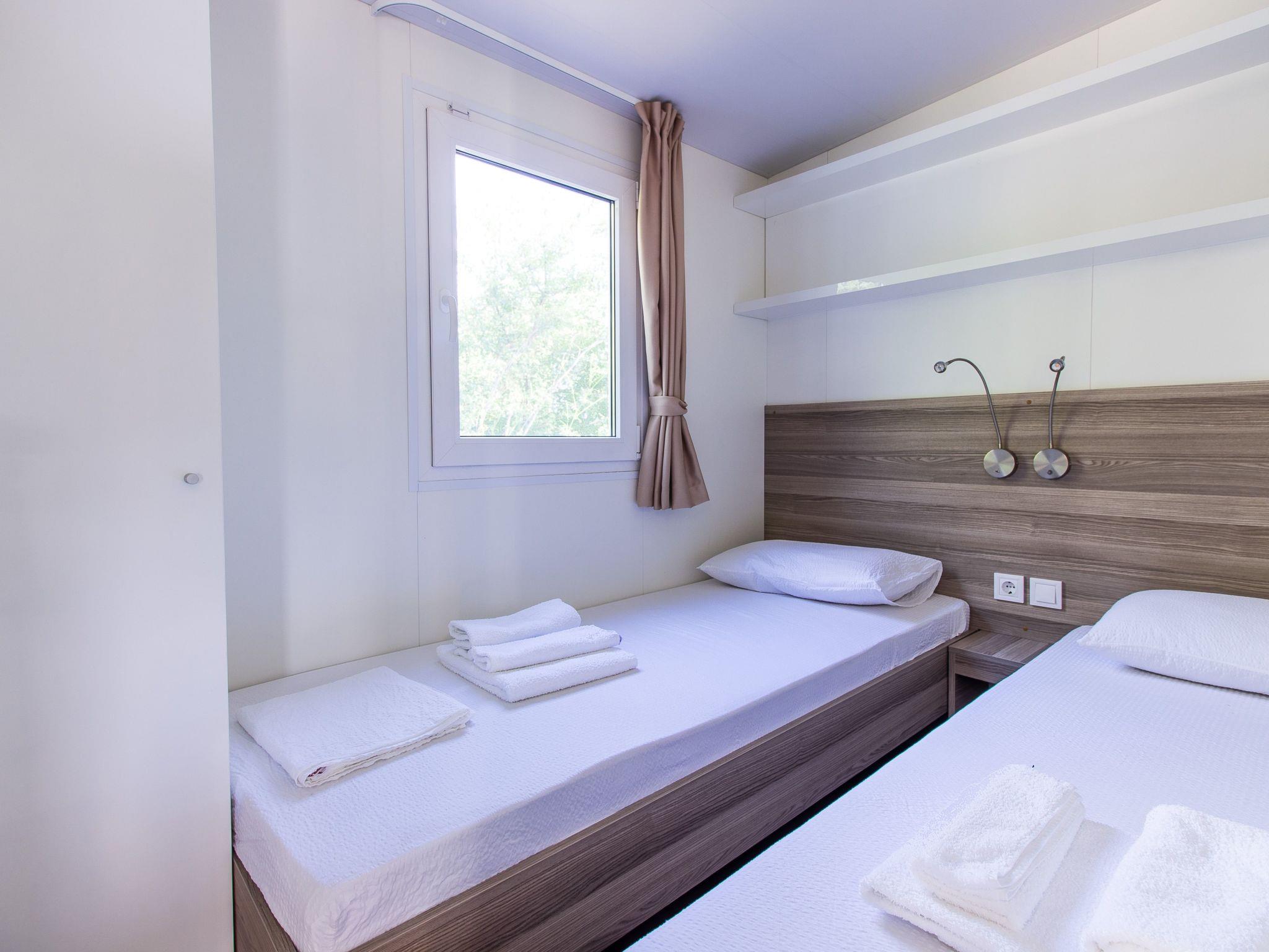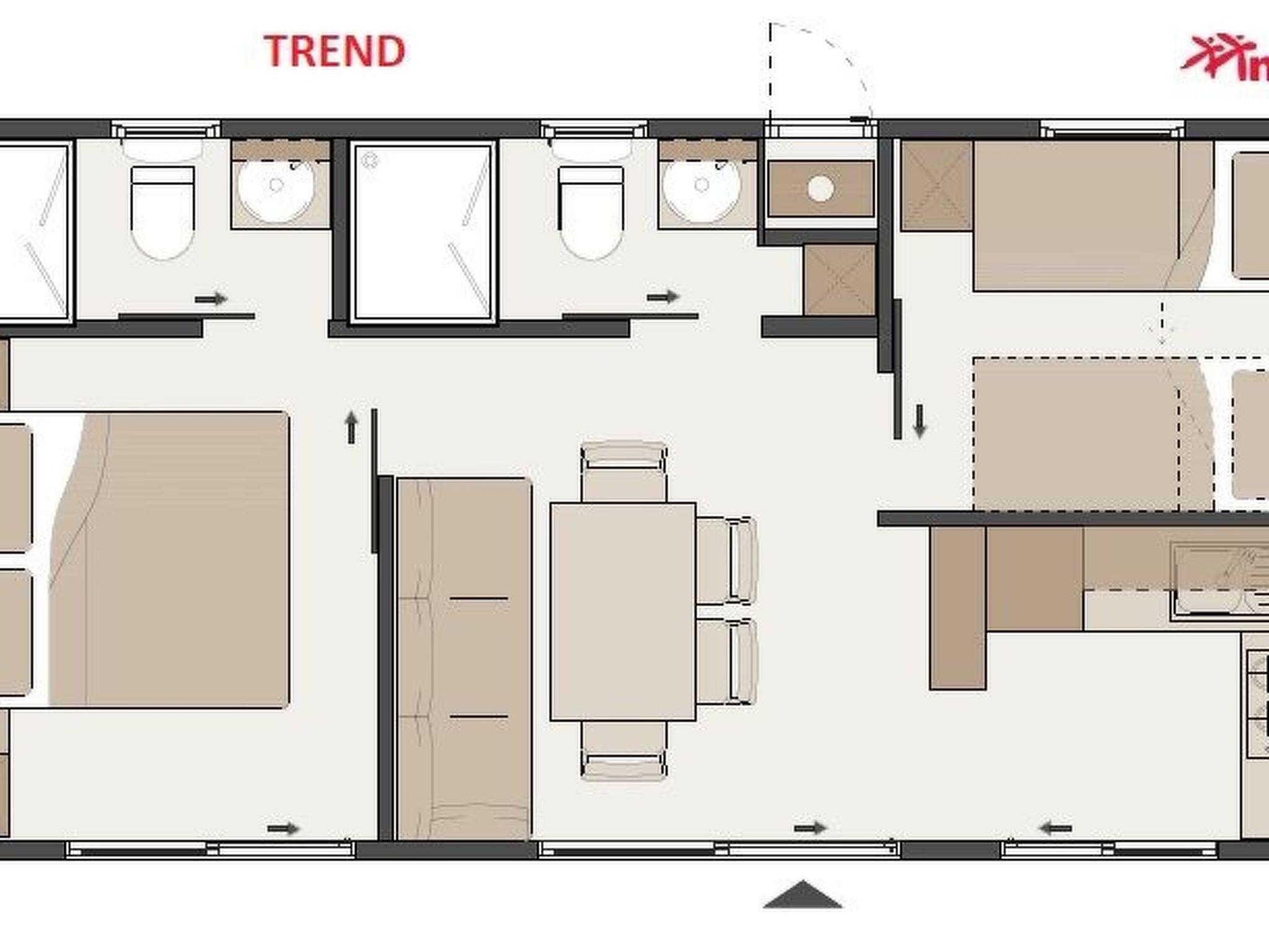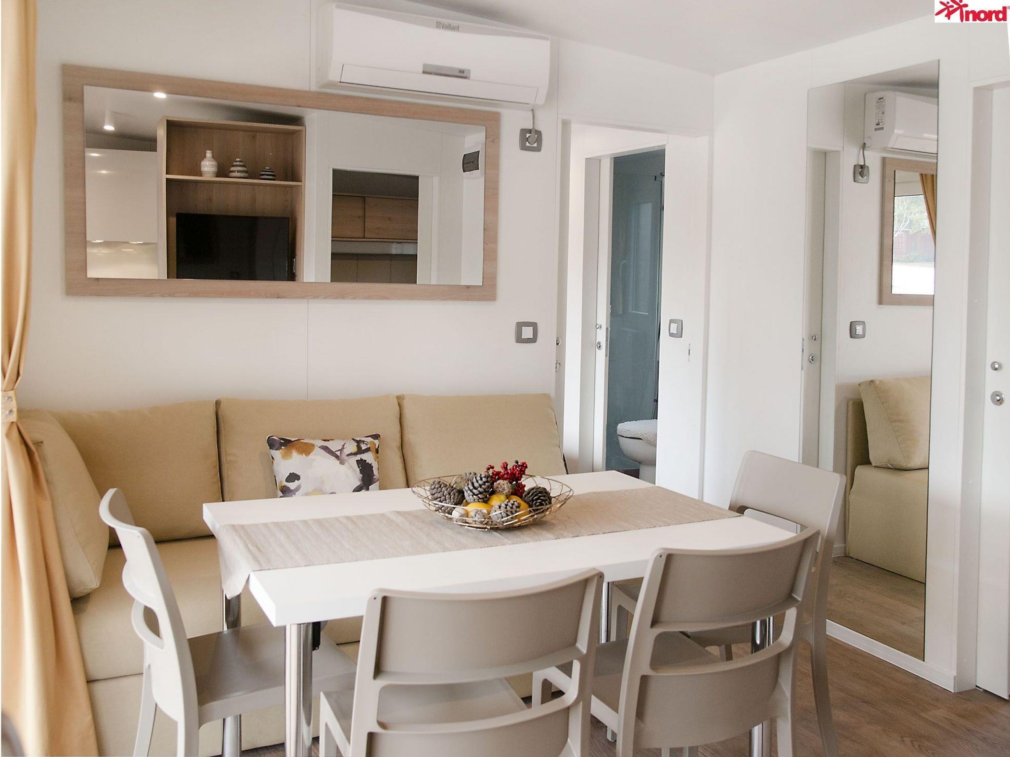 Type TREND 4+2 A zone Surface 32 m²; Manufacture year 2018 Number of bedrooms: 2 (1 with double bed, 1 with 2 single beds) Kitchen/Living room (additional bed on corner furniture) Bathroom/ Toilets : 2 ; Air conditioning, Wooden terrace Additional equipment: awning and table + chairs on terrace, grill, coffee machine, electric kettle, TV, microwave