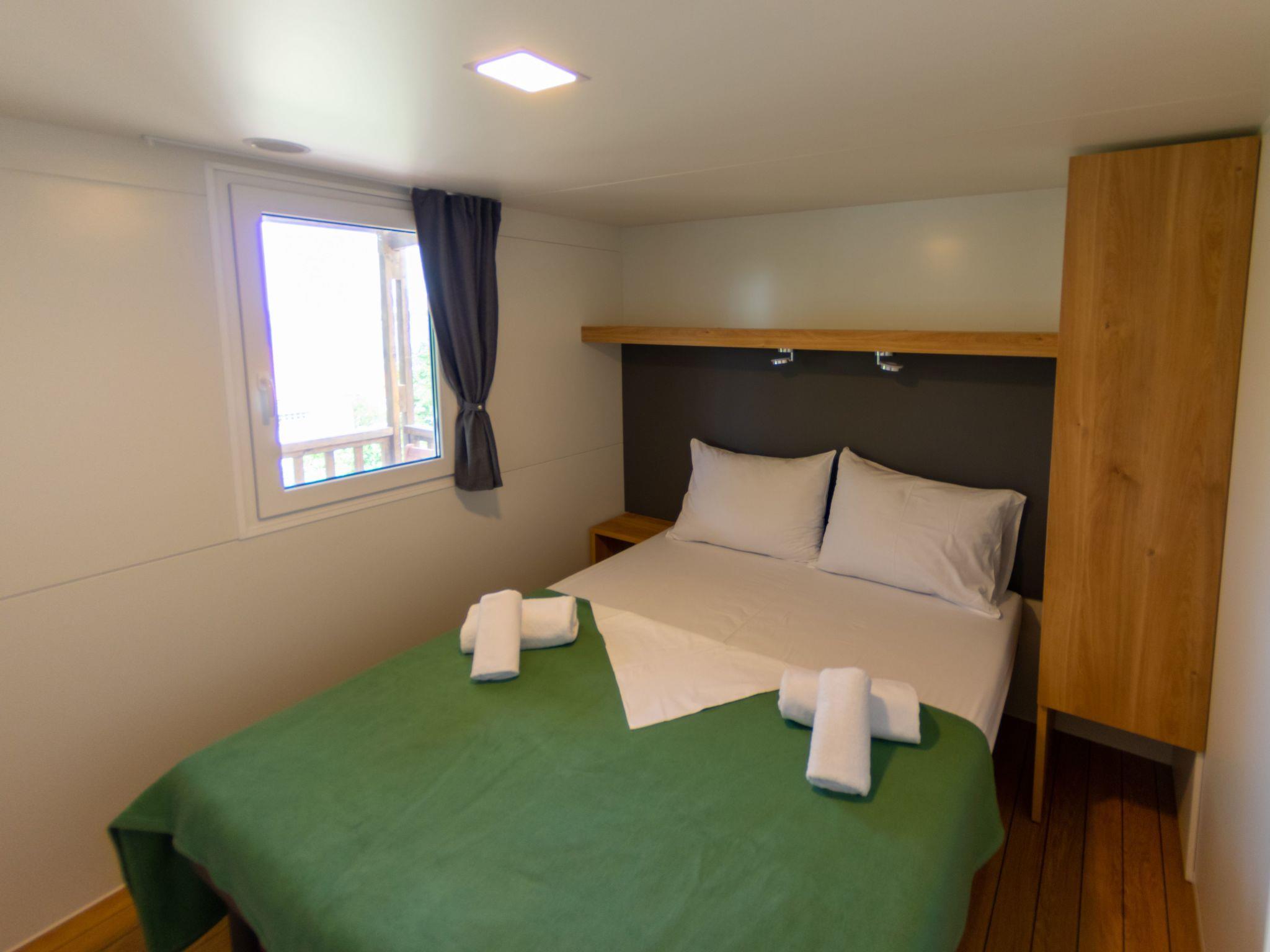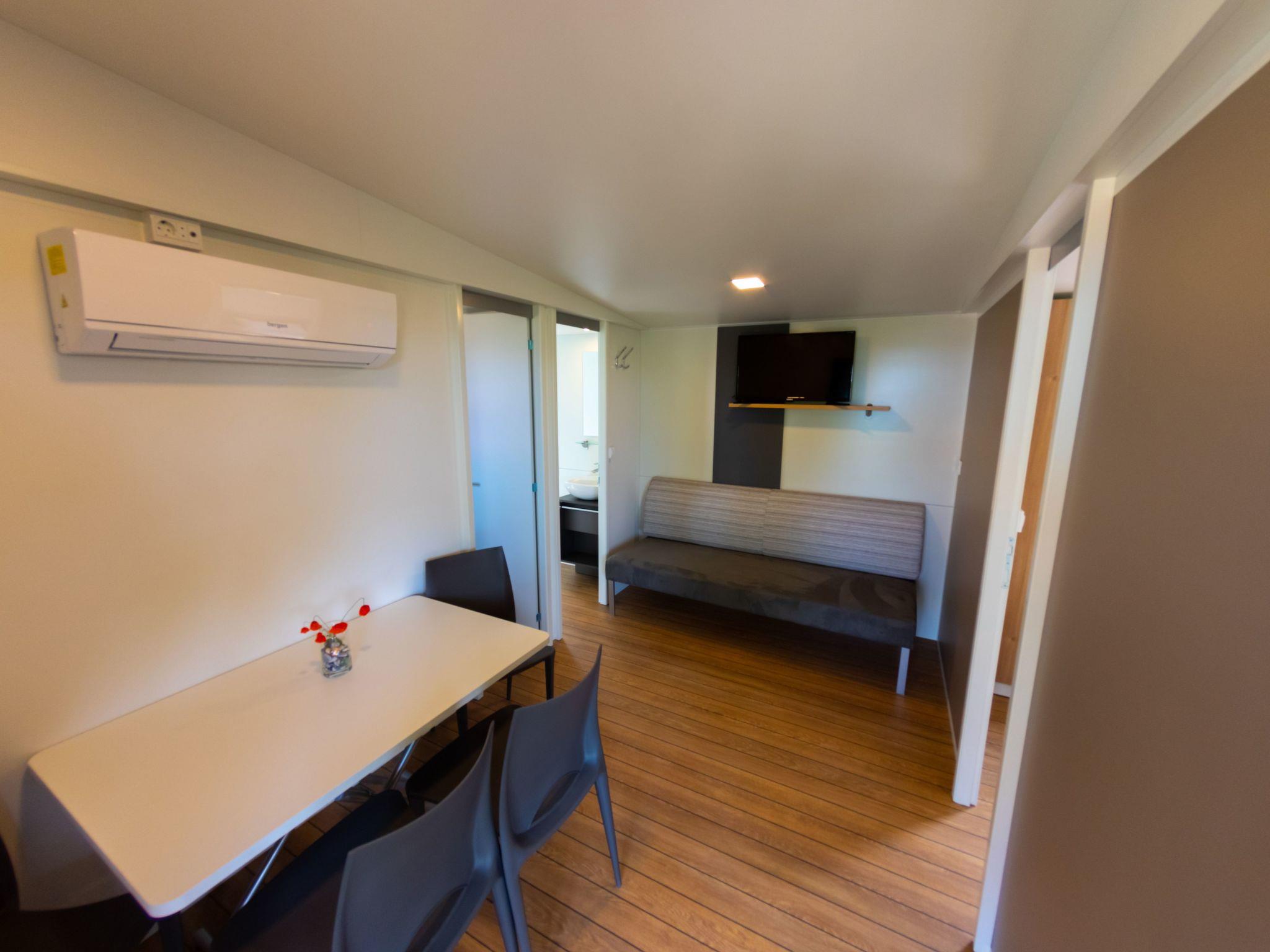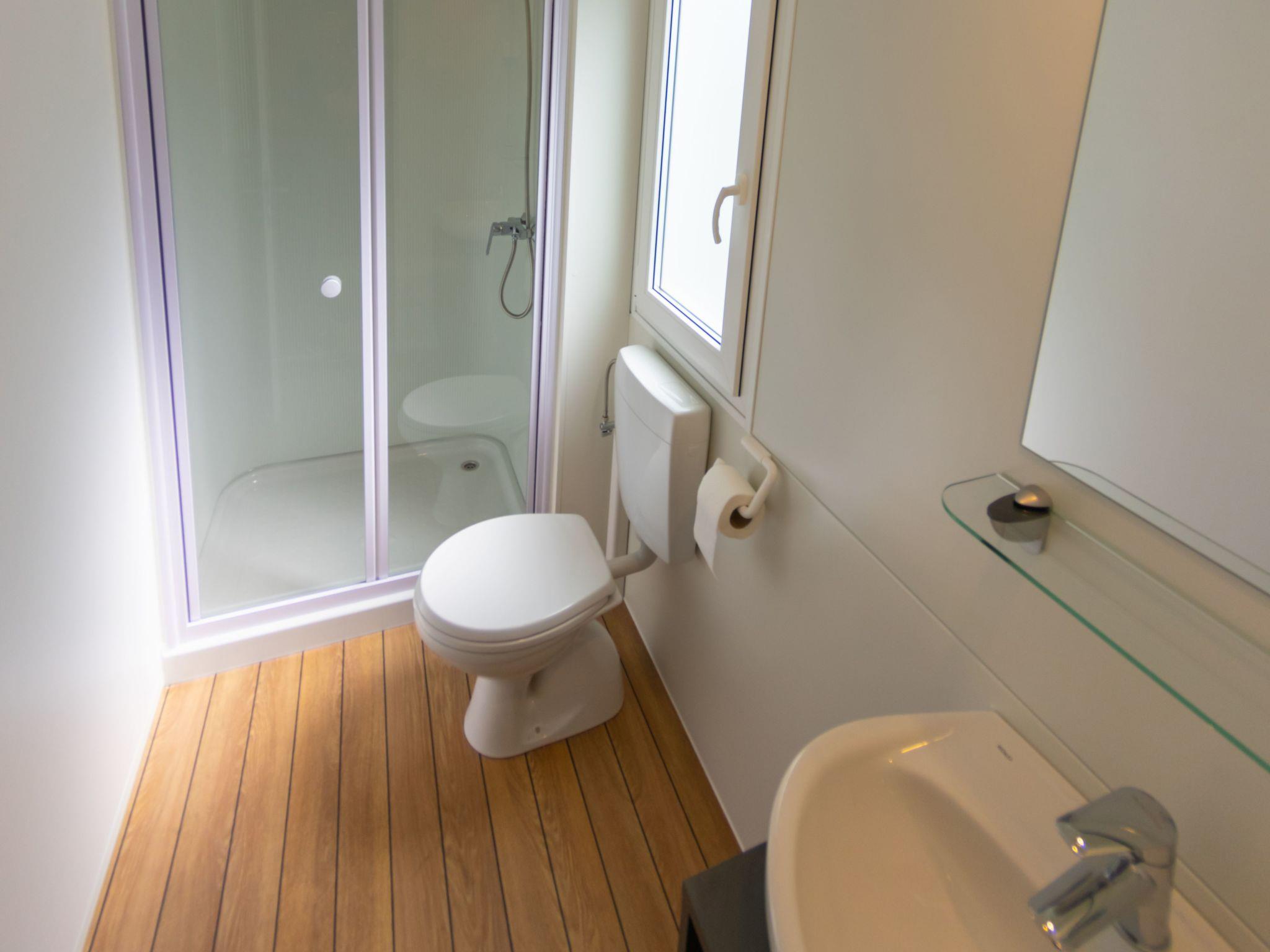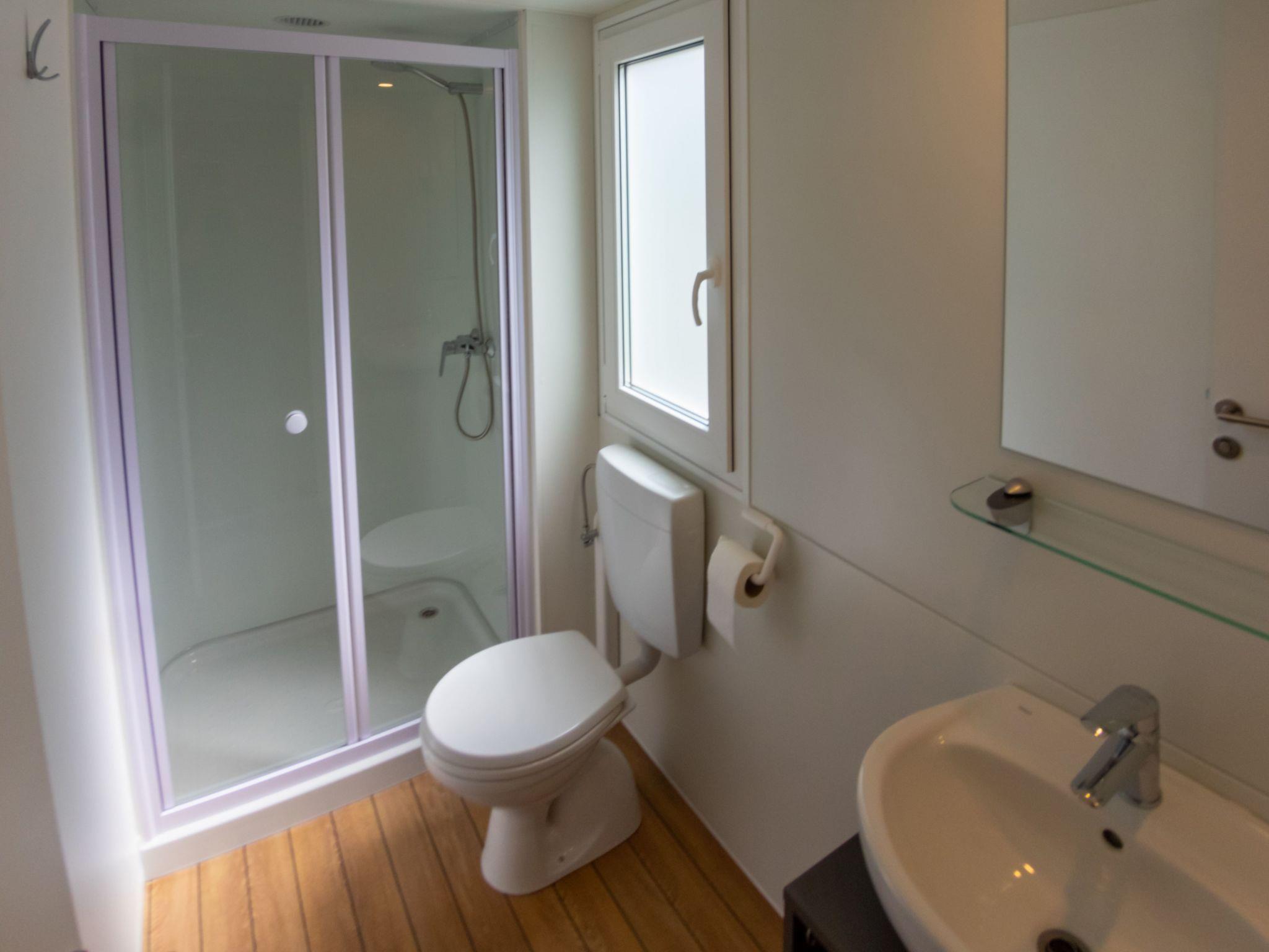 Brand new mobile home for up to five people with a wooden terrace The comfortable mobile homes are fully-equipped. They measure 30m² and can accommodate up to five people (of which at least one is a child). There are two bedrooms, one with a double bed (160x200) and the other with two single beds (80x200). Additional bed (70x190) in living room. Kitchen is equipped with cutlery and cooking utensils, fridge with freezer, hob with 4 burners, microwave oven, electric kettle, filter coffee machine. The bathroom provides a shower cabin, WC and sink. Your holiday accommodation has air conditioning and TV.