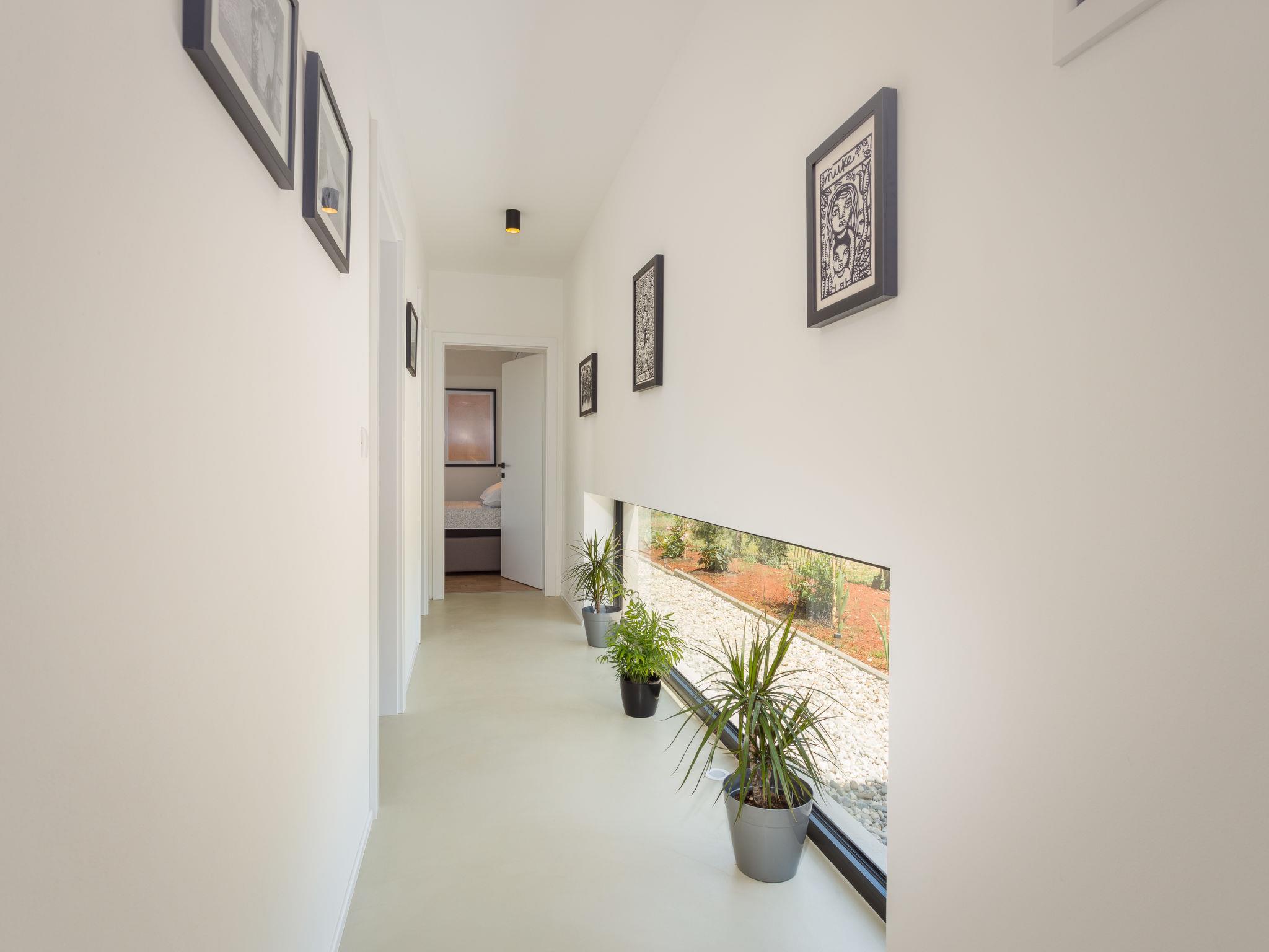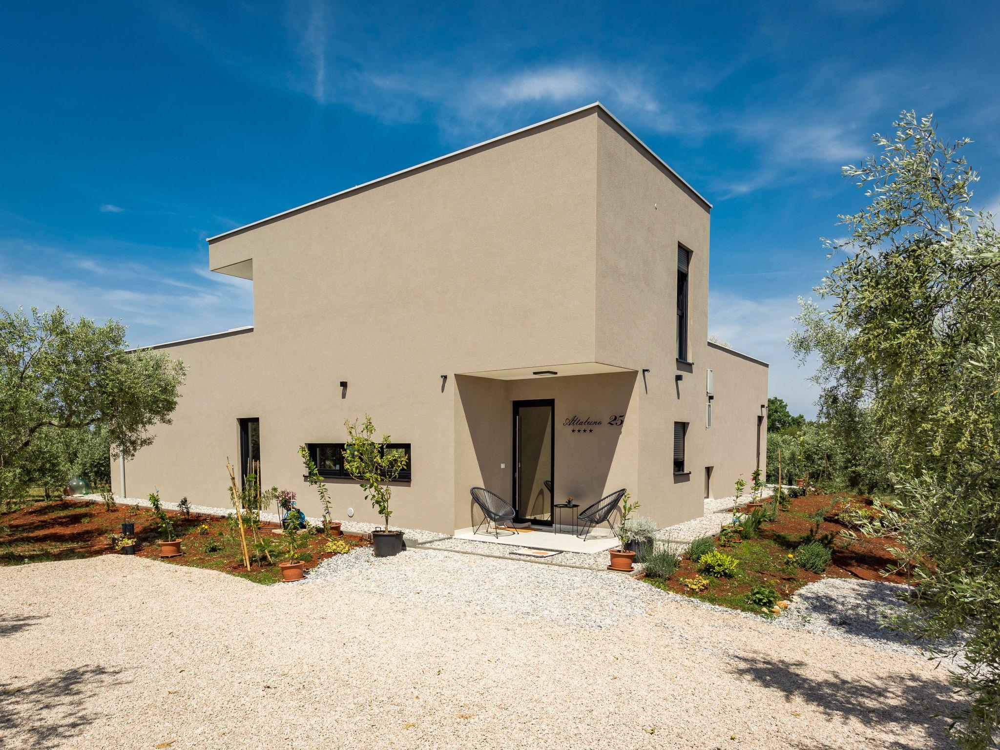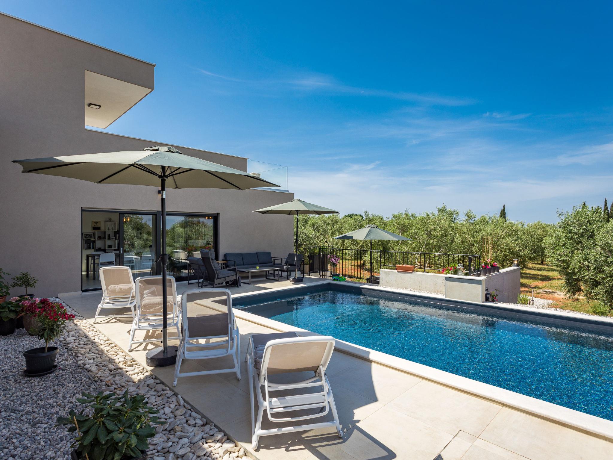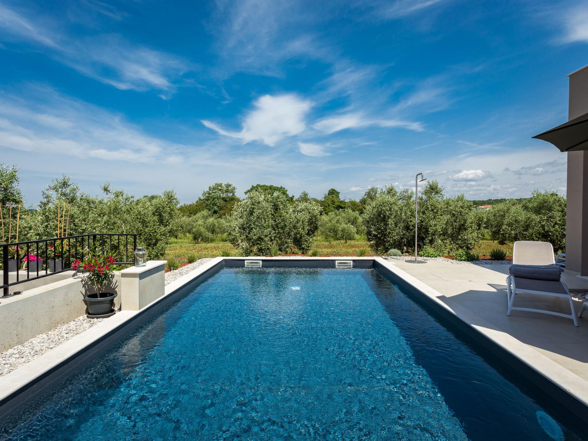 Villa "Altalune", 2 storeys, built in 2022. In the district of Vidal 1 km from the centre of Novigrad, in a secluded, quiet position, 1 km from the sea, 1 km from the beach. Private: property 6'000 m2 with wildlife garden and trees, swimming pool angular (8 x 4 m, depth 150 cm, seasonal availability: 01.May. - 15.Oct.) with internal staircase. Outdoor shower, terrace (80 m2), garden furniture, pool maintenance by the owner/gardener. In the house: internet access, trampoline, washing machine, tumble dryer. Parking (for 2 cars) at the house on the premises. Shop 1 km, supermarket 1 km, restaurant 1 km, bus stop 1.7 km, pebble beach 1 km, shingle beach 1 km, rocky beach 1 km, concrete beach 1 km. Please note: airfield 75 km from the property.