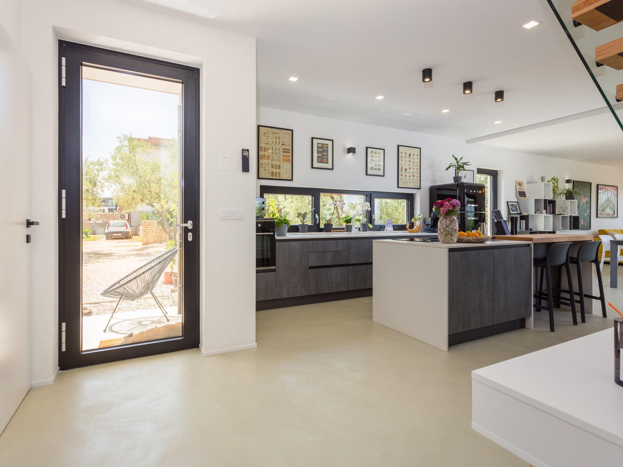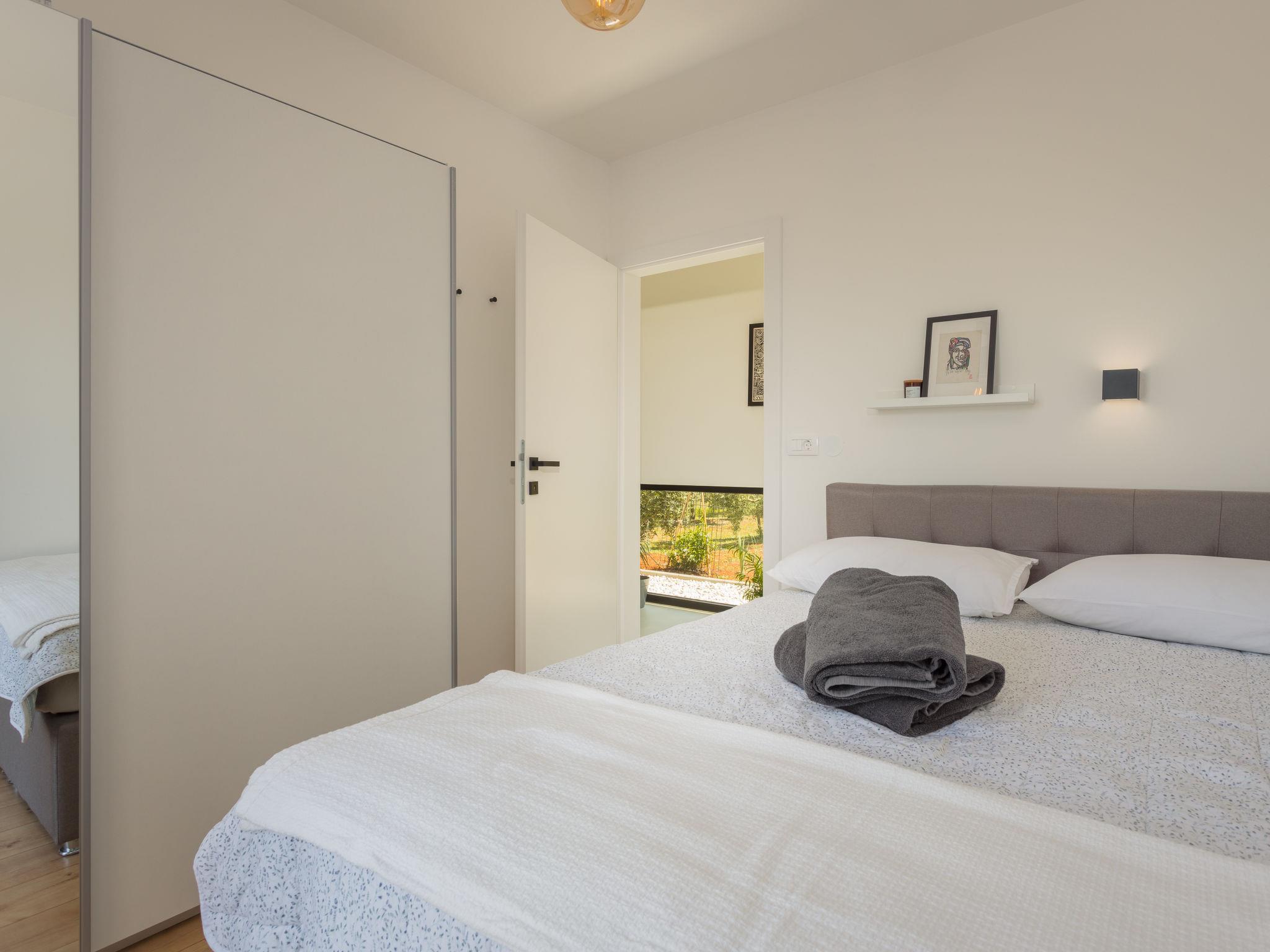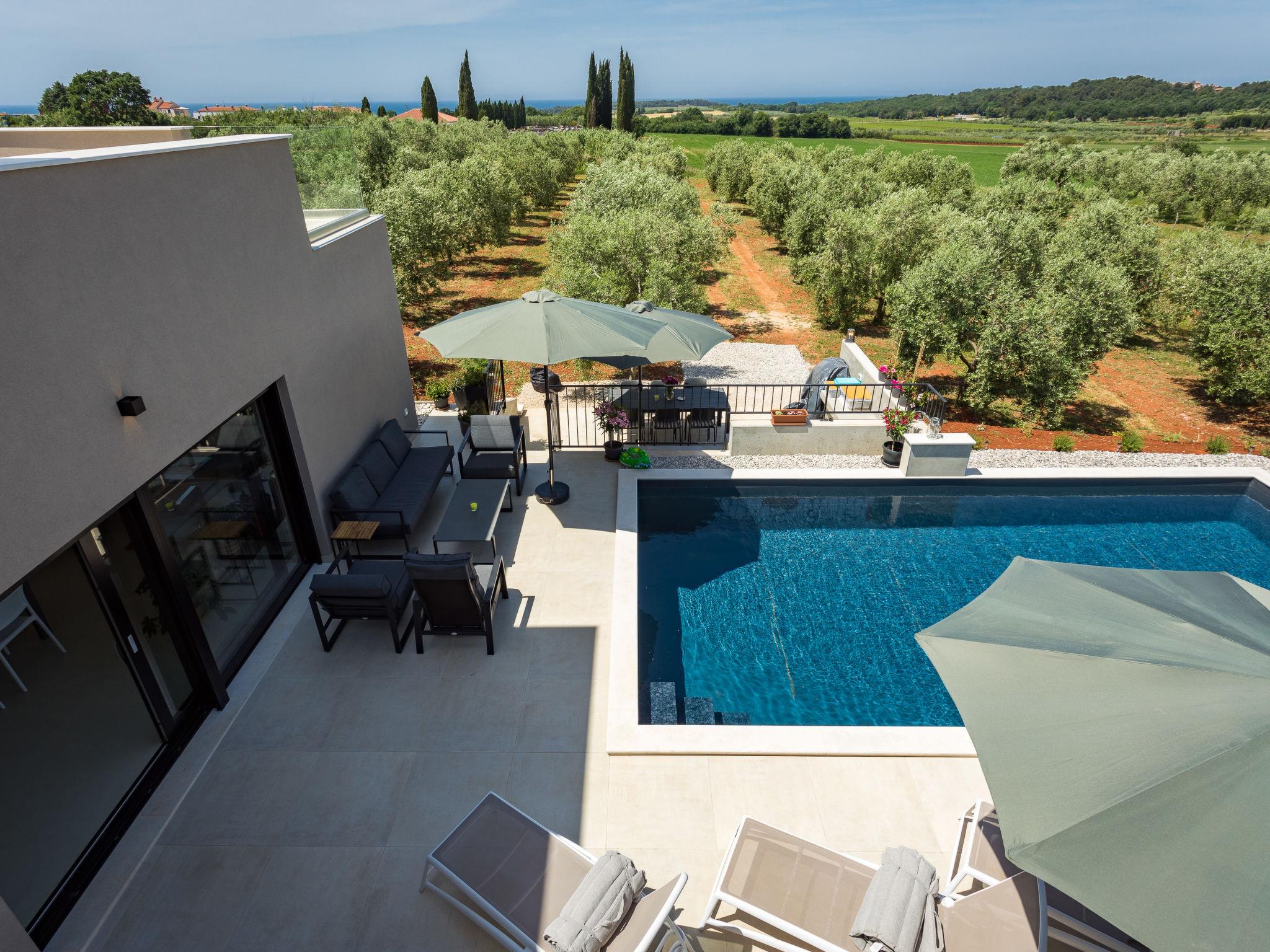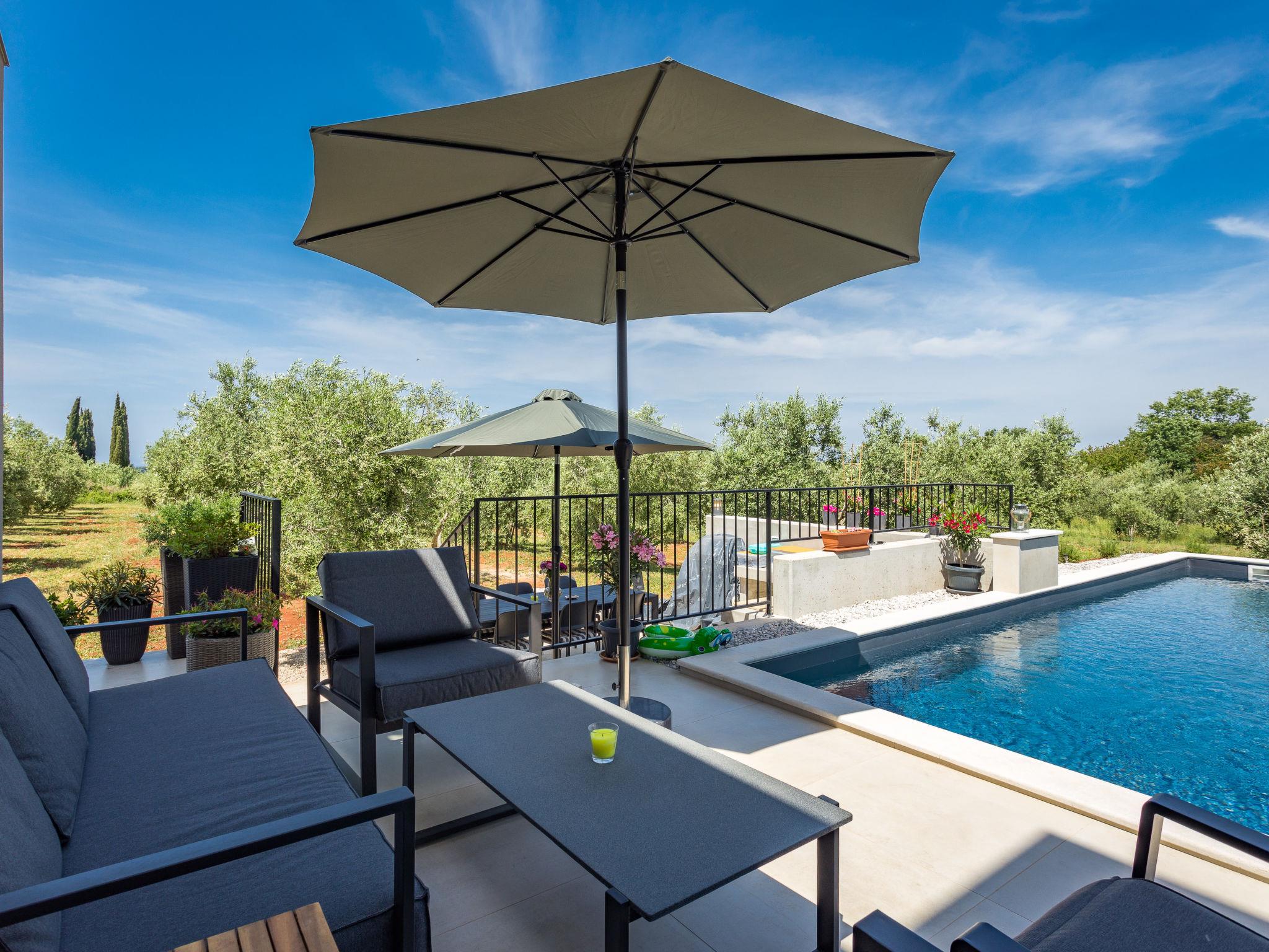 Villa "Altalune", 2 storeys, built in 2022. In the district of Vidal 1 km from the centre of Novigrad, in a secluded, quiet position, 1 km from the sea, 1 km from the beach. Private: property 6'000 m2 with wildlife garden and trees, swimming pool angular (8 x 4 m, depth 150 cm, seasonal availability: 01.May. - 15.Oct.) with internal staircase. Outdoor shower, terrace (80 m2), garden furniture, pool maintenance by the owner/gardener. In the house: internet access, trampoline, washing machine, tumble dryer. Parking (for 2 cars) at the house on the premises. Shop 1 km, supermarket 1 km, restaurant 1 km, bus stop 1.7 km, pebble beach 1 km, shingle beach 1 km, rocky beach 1 km, concrete beach 1 km. Please note: airfield 75 km from the property.