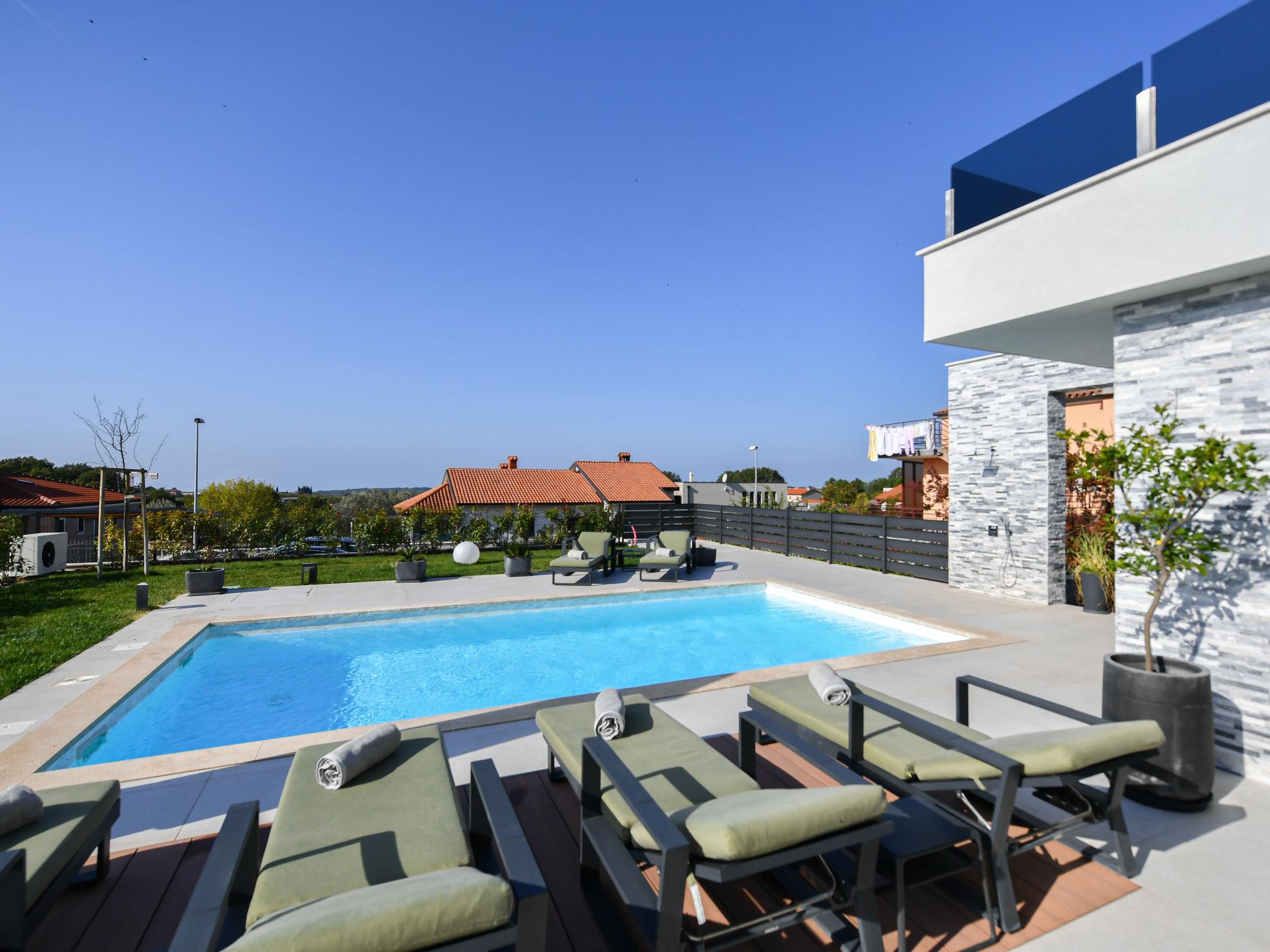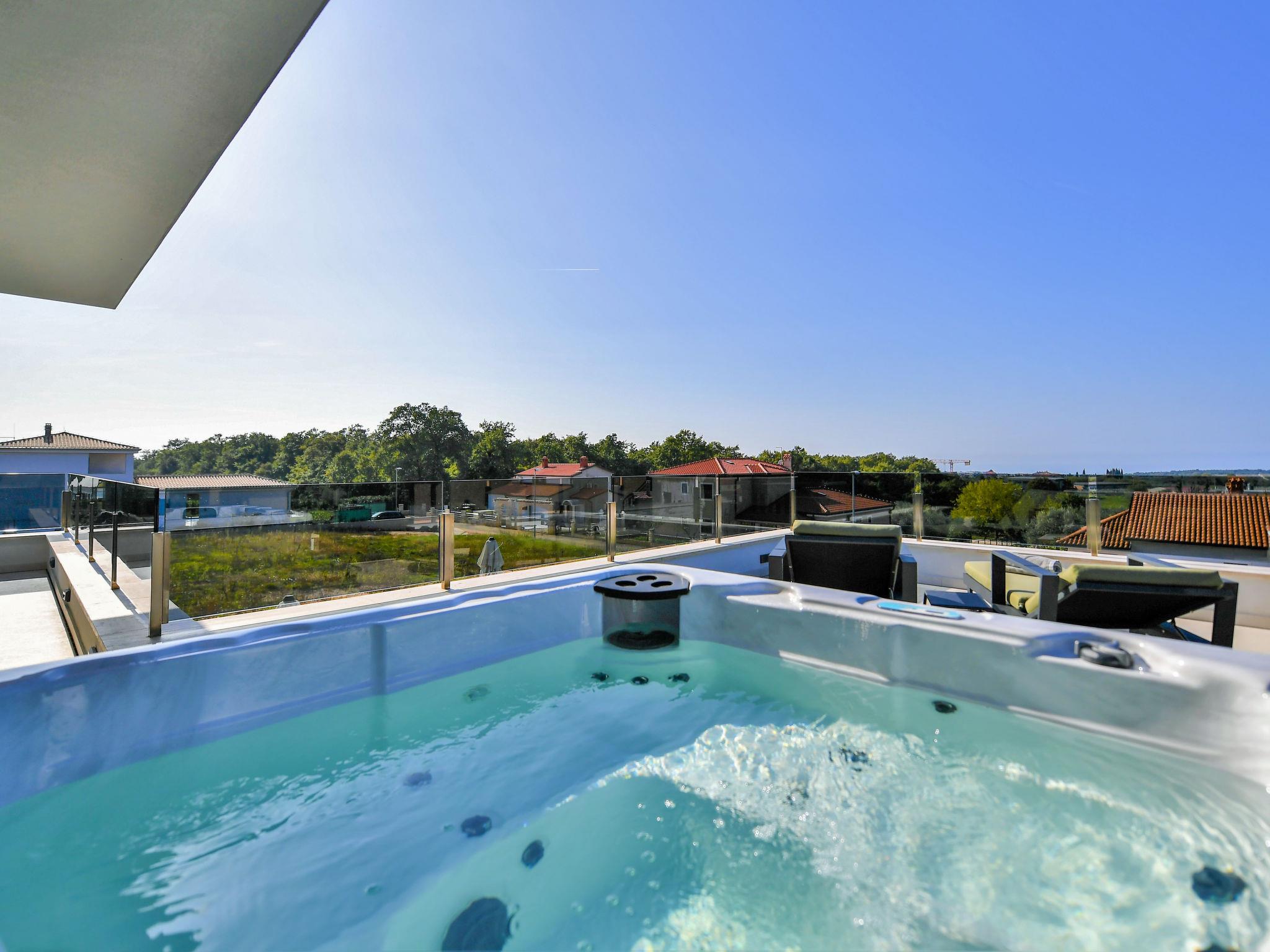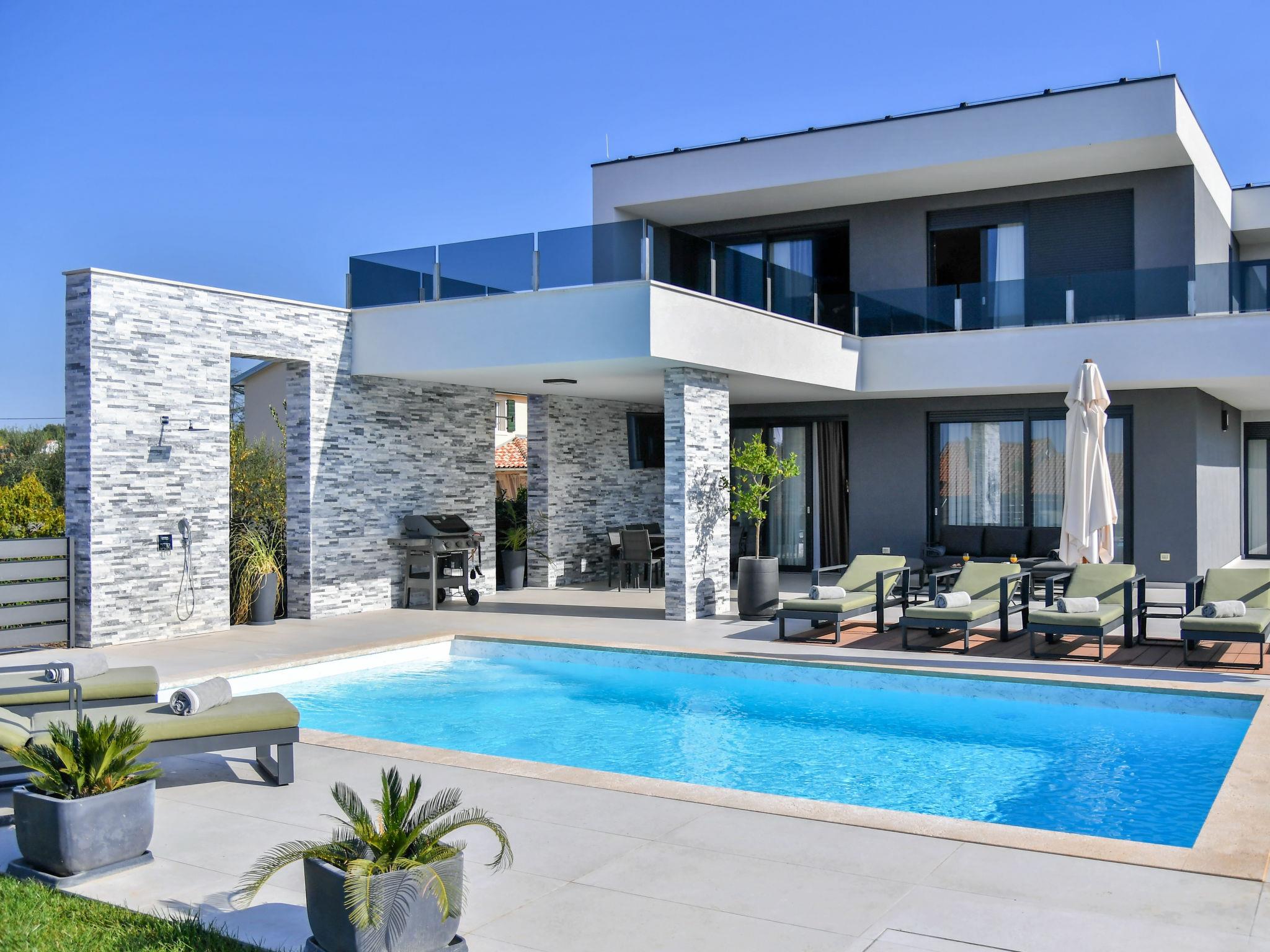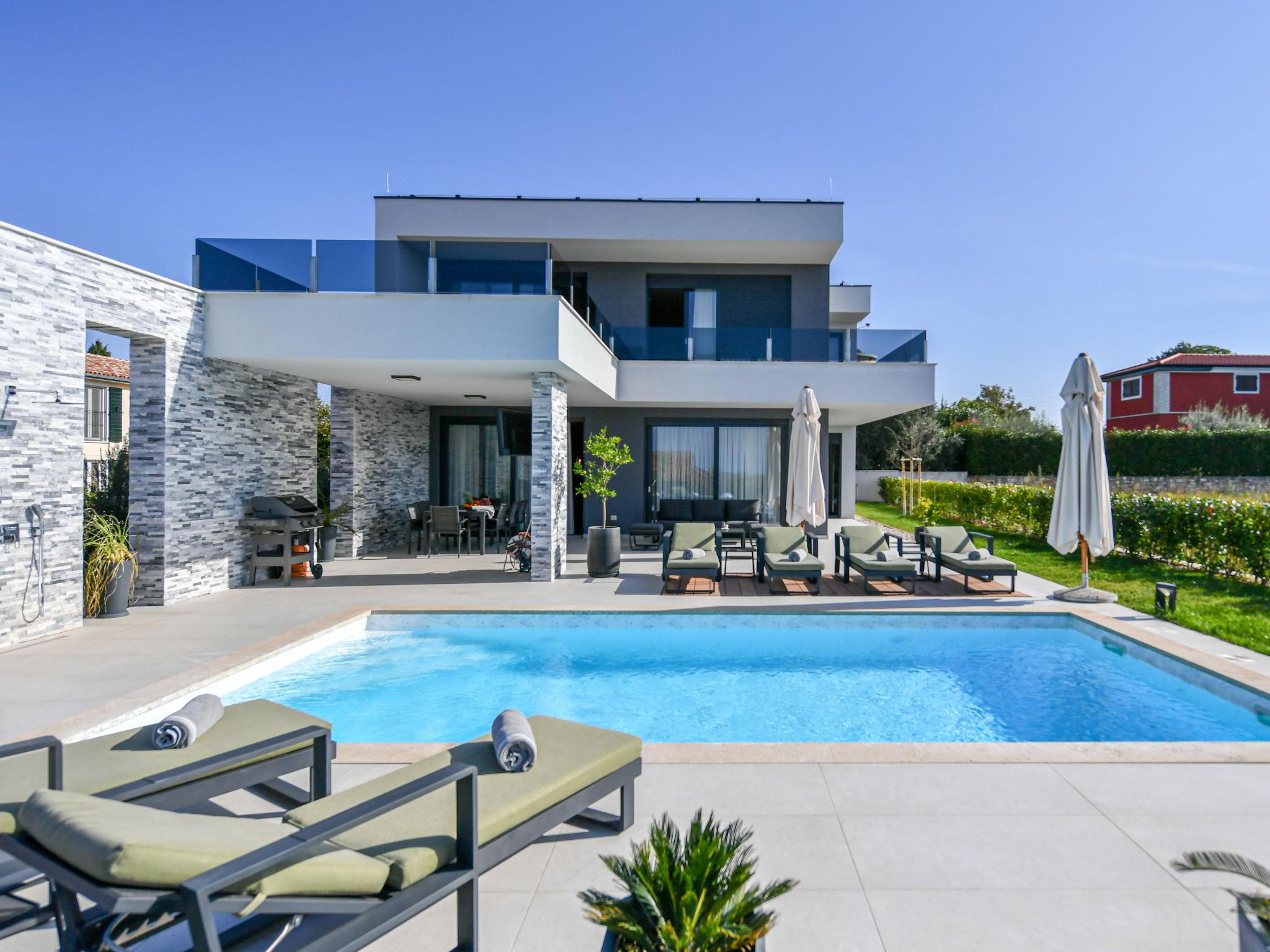 Luxurious villa "Riposo", 2 storeys. In the district of Sveti Servul 2 km from the centre of Novigrad, in a quiet, sunny position, 3 km from the sea, 3 km from the beach, in a cul-de-sac. Private: property 1'000 m2 with wildlife garden, swimming pool angular, heated (7 x 5 m, depth 145 cm, seasonal availability: 01.Apr. - 01.Nov.) with internal staircase. Outdoor shower, hot tub, terrace (25 m2), garden furniture, barbecue. In the house: internet access, sauna, washing machine, tumble dryer. Available: bicycles (2). Parking (for 4 cars) at the house on the premises. E-charging station. Shop 1.5 km, supermarket 1.5 km, restaurant 500 m, bus stop 2 km, pebble beach 3 km, rocky beach 3 km. Golf course (18 hole) 25 km, tennis 2 km, walking paths from the house 500 m, cycle lane 550 m. Nearby attractions: Aquapark 5 km. Please note: airfield 60 km from the property. Swimming pool heated (extra). It is necessary to announce 7 days in advance if the pool heating is required.