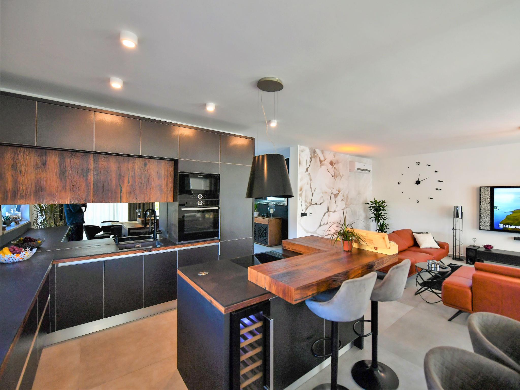 5-room villa 240 m2. Spacious, tasteful furnishings: living/dining room with satellite TV and air conditioning. Exit to the terrace. 1 room with 1 french bed (180 cm, length 200 cm), shower/bidet/WC, satellite TV and air conditioning. Exit to the swimming pool. Open kitchen (oven, dishwasher, 4 induction hot plates, toaster, kettle, microwave, freezer, electric coffee machine). Sep. WC. Upper floor: 1 room with 1 french bed (180 cm, length 200 cm), shower/bidet/WC, satellite TV and air conditioning. Exit to the terrace. 1 room with 1 french bed (180 cm, length 200 cm), bath/bidet/WC, satellite TV and air conditioning. Exit to the terrace. 1 room with 1 french bed (180 cm, length 200 cm), shower/bidet/WC, satellite TV and air conditioning. Exit to the terrace. Forced-air heating. Terrace 20 m2. Terrace furniture, deck chairs. Beautiful view of the sea. Facilities: safe, iron, hair dryer. Internet (WiFi, free). Maximum 2 pets/ dogs allowed.