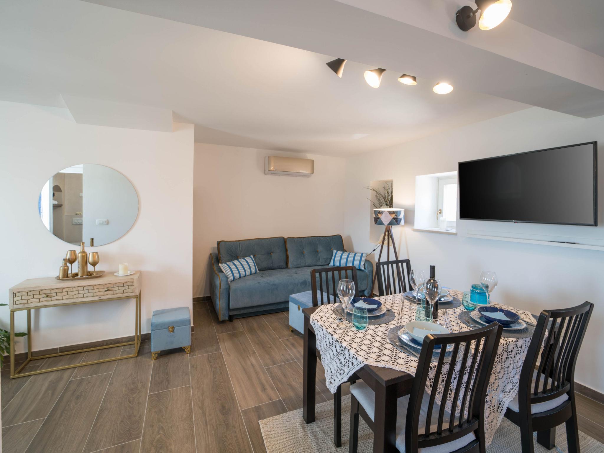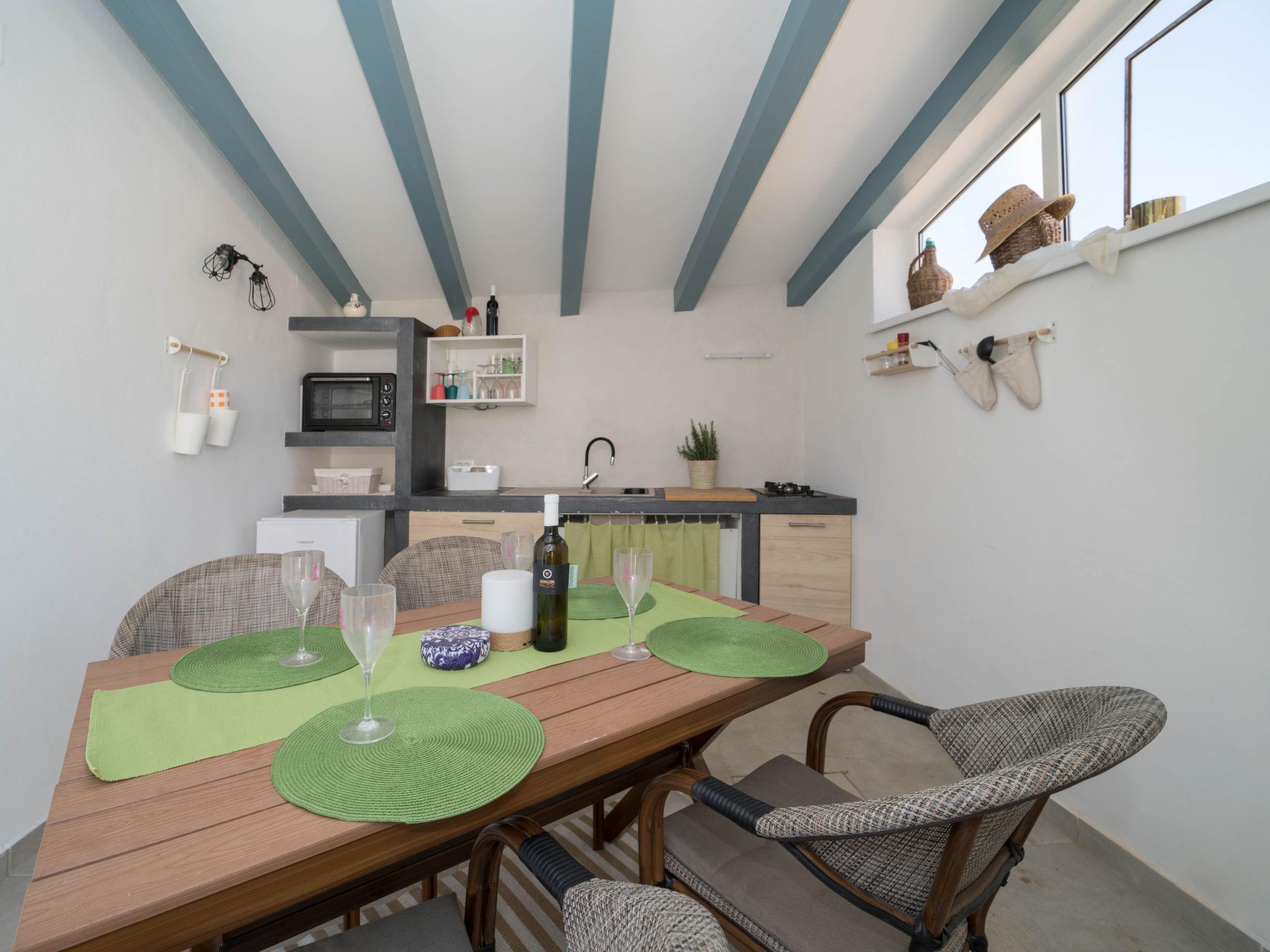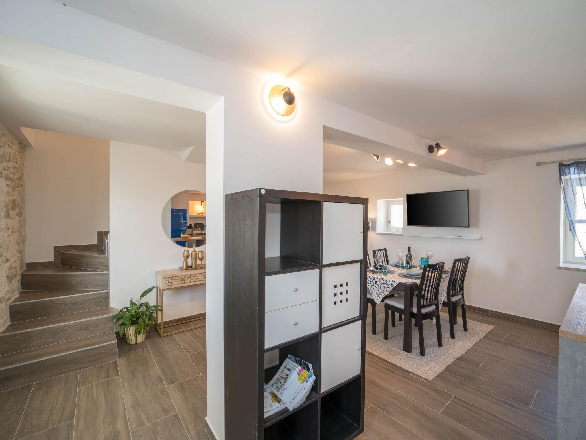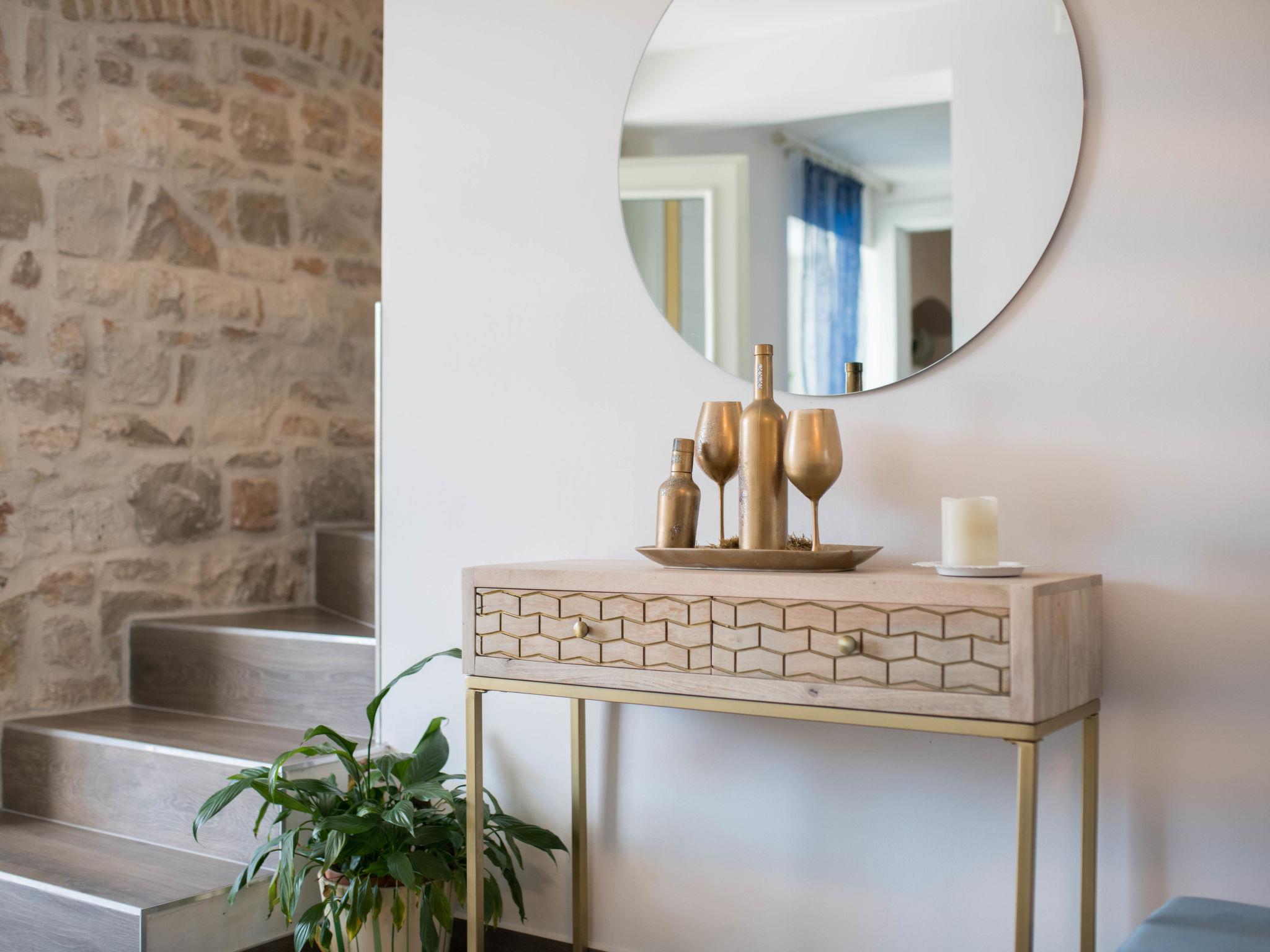 3-room terraced house 120 m2 on 2 levels on 1st floor. Beautiful and tasteful furnishings: living/dining room with satellite TV (flat screen), air conditioning. Exit to the terrace. Open kitchen (dishwasher, 4 induction hot plates, toaster, kettle, freezer, electric coffee machine). Shower/WC. Upper floor: 1 room with 1 french bed (160 cm, length 200 cm). 1 room with 2 beds (90 cm, length 200 cm), air conditioning. Open gallery with sloping ceilings, ceiling height 60 - 200 cm with rooflight with 1 double sofabed (120 cm, length 190 cm). Shower/WC. Floor heating (extra). Terrace 10 m2, terrace 16 m2. Terrace furniture, barbecue (portable), deck chairs. Distant view of the sea. Facilities: hair dryer. Internet (WiFi, free). 1 small pet/ dog allowed. 2163/1-10/2-21-3 klasa:UP/I-335-03/21-01/1860