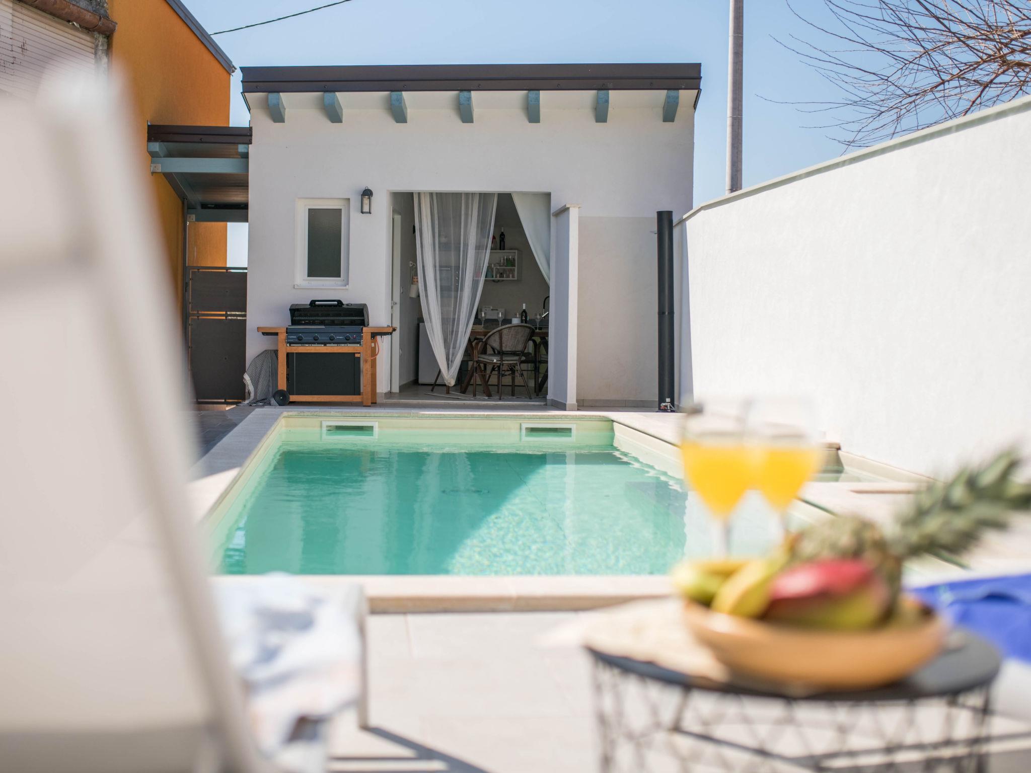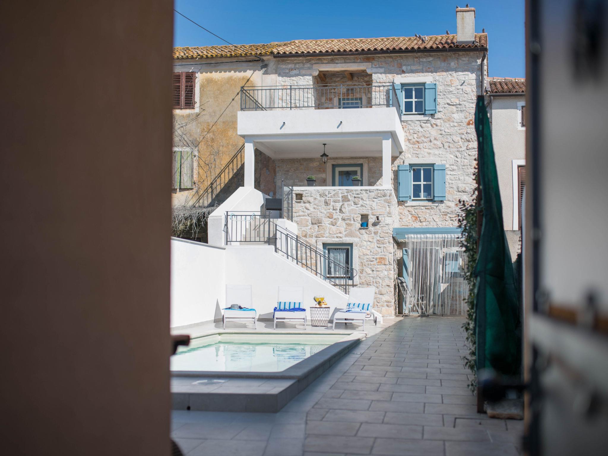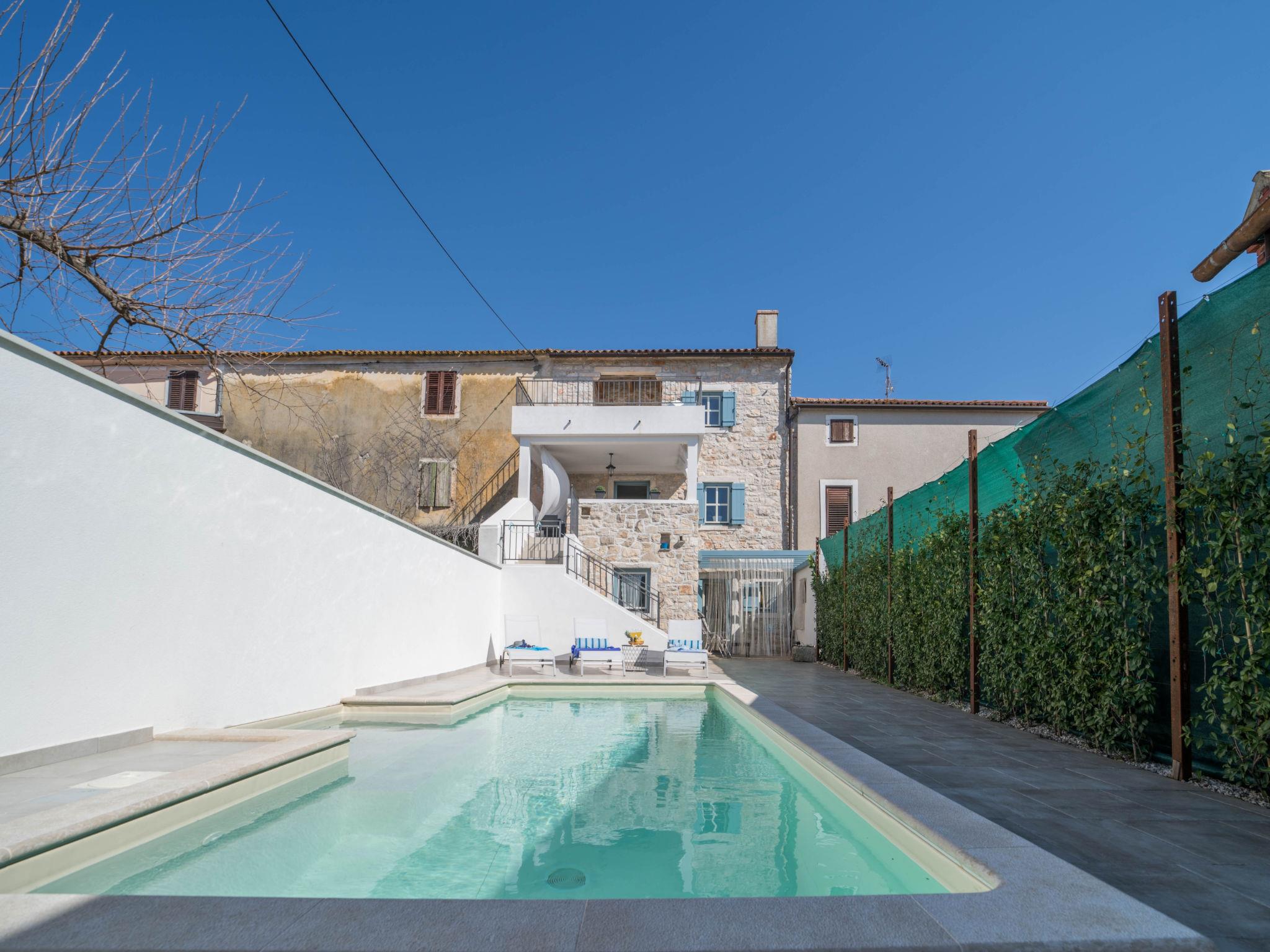 Terraced house "Villa Caterina", 2 storeys, renovated in 2022. In the hamlet Fiorini 8 km from the centre of Novigrad, in a sunny position, 2 km from the sea, 2 km from the beach, in a cul-de-sac. Private: property 200 m2 (fenced), swimming pool angular (15 m2, depth 140 cm, seasonal availability: 01.May. - 30.Sep.). Outdoor shower. In the house: internet access, washing machine. Parking (for 2 cars) at the house on the premises. Shop 6 km, restaurant 50 m, bus stop 2.4 km, pebble beach 2 km, rocky beach 2 km. Walking paths from the house 50 m, cycle lane 100 m, children's playground 200 m. Please note: the owner lives in the same residence. The owner is at guests' disposal for pool cleaning and property maintenance. Private: outdoor kitchen (2 hot plates, oven, microwave, fridge). Organizing a party is not allowed. Swimming pool heated (extra).