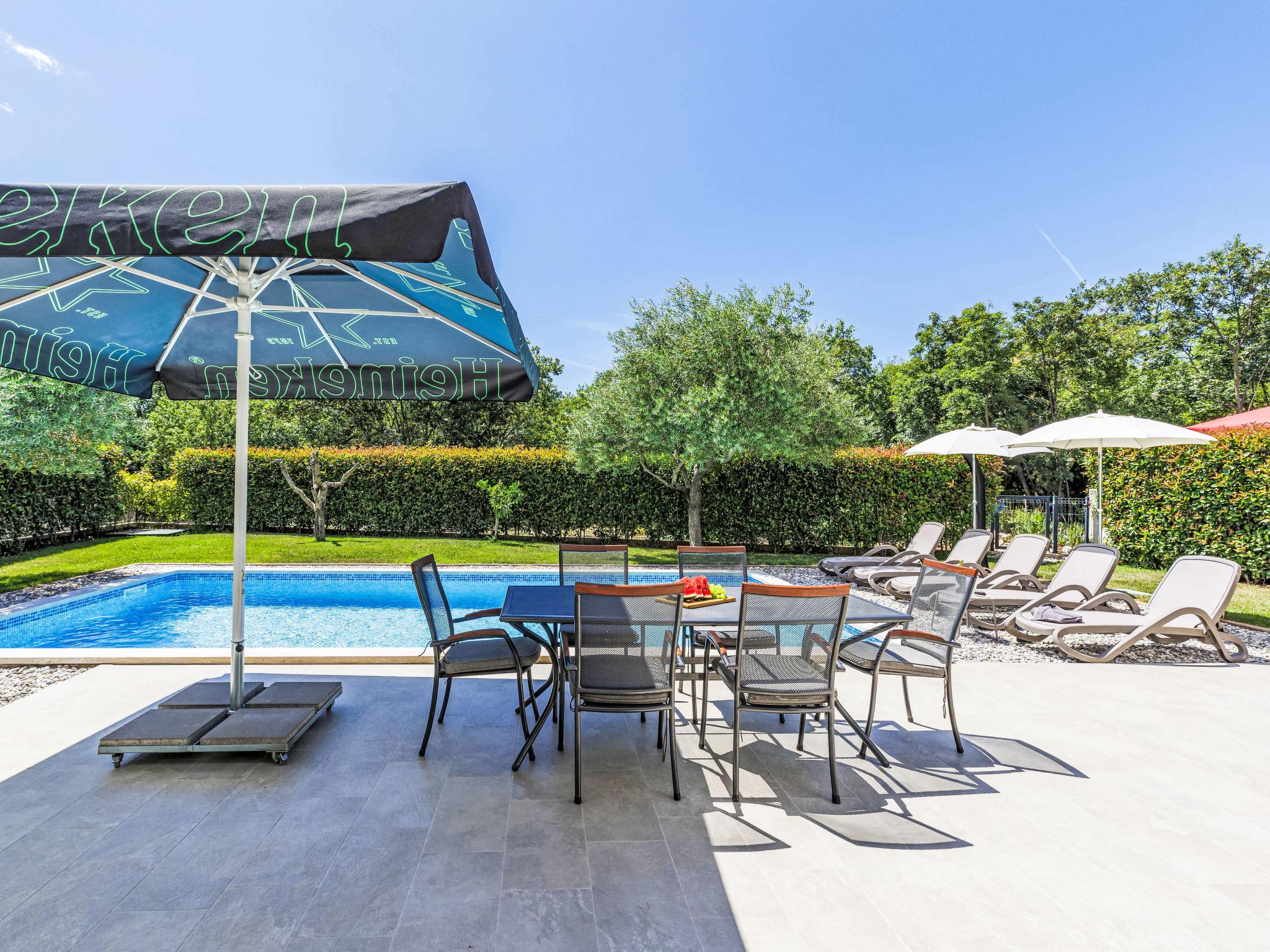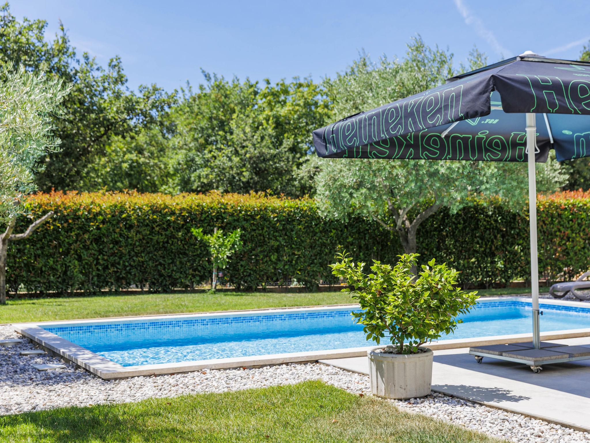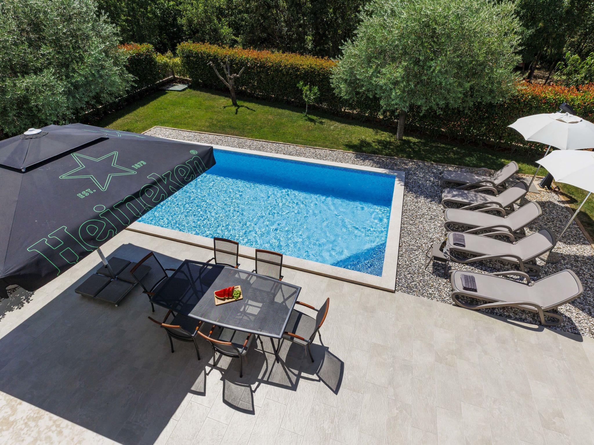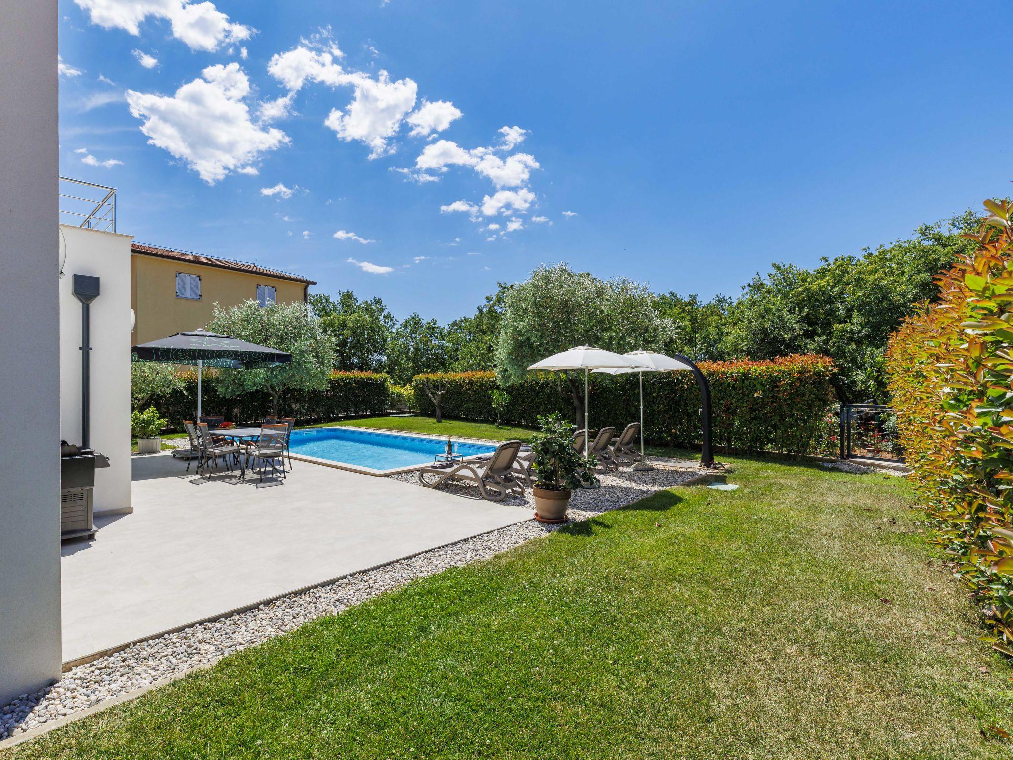 Semi-detached house "Cancar", 2 storeys. In the hamlet Fiorini 8 km from the centre of Novigrad, in a sunny position, 2 km from the sea, 2 km from the beach, in a cul-de-sac. Private: property 400 m2 (fenced), garden with lawn and wildlife garden, swimming pool angular (8 x 4 m, depth 145 cm, seasonal availability: 01.Jun. - 30.Sep.) with internal staircase and salt-electrolysis pool-cleaning system. Outdoor shower, pool maintenance by the owner/gardener. In the house: internet access, washing machine. Parking (for 2 cars) at the house on the premises. Shop 6 km, restaurant 50 m, bus stop 2.4 km, pebble beach 2 km, rocky beach 2 km. Walking paths from the house 50 m, cycle lane 100 m.