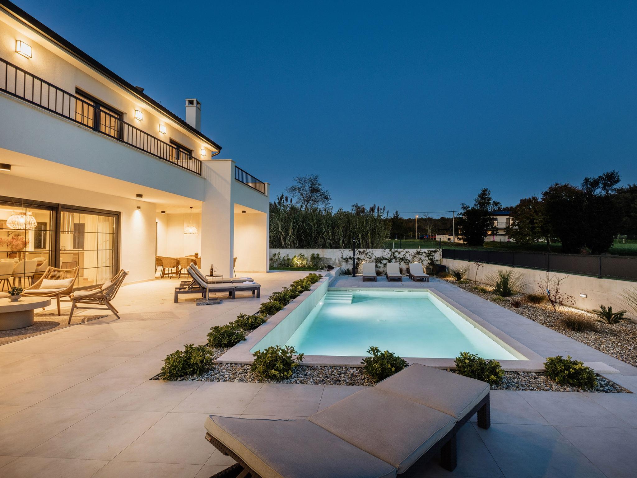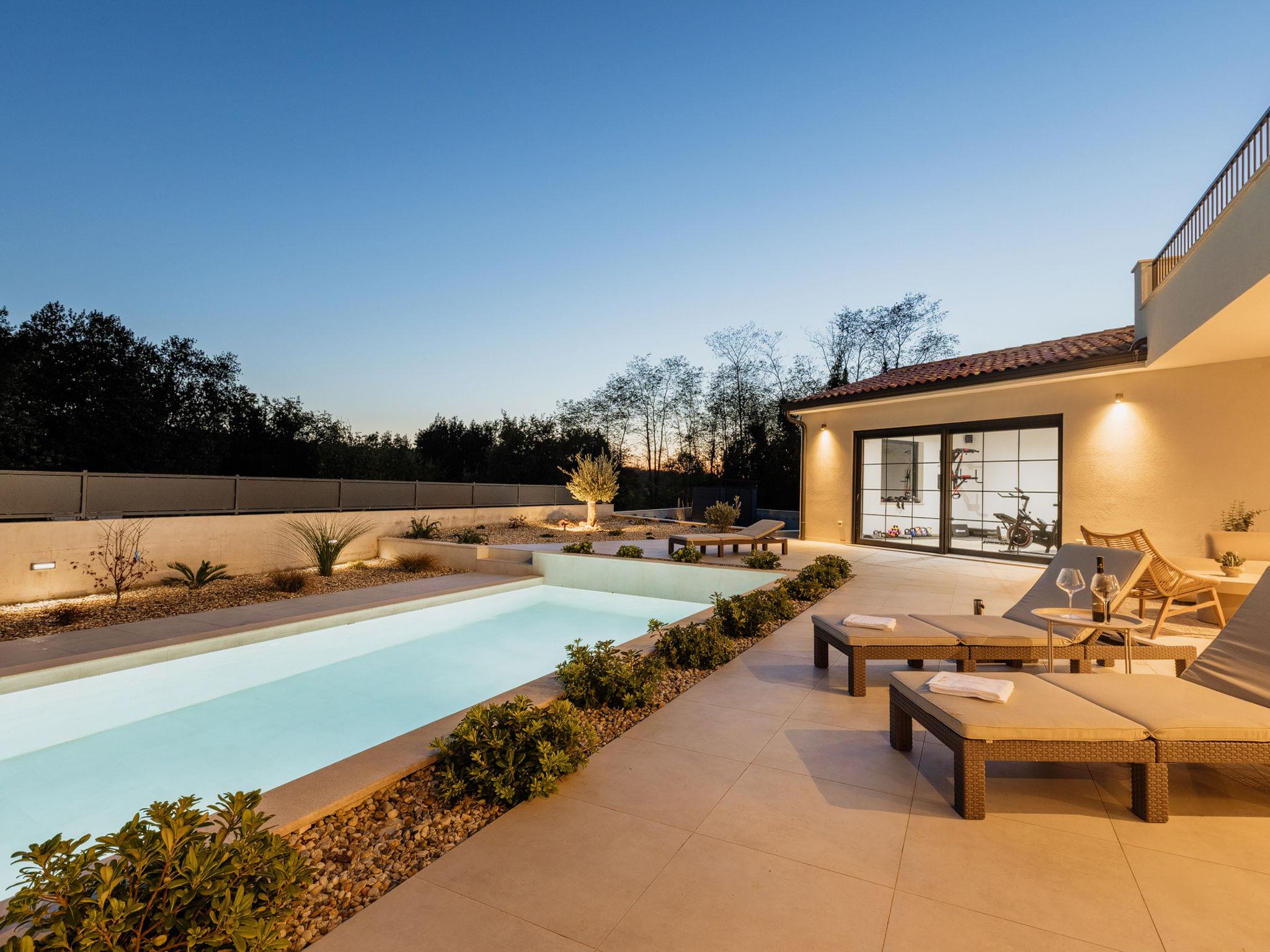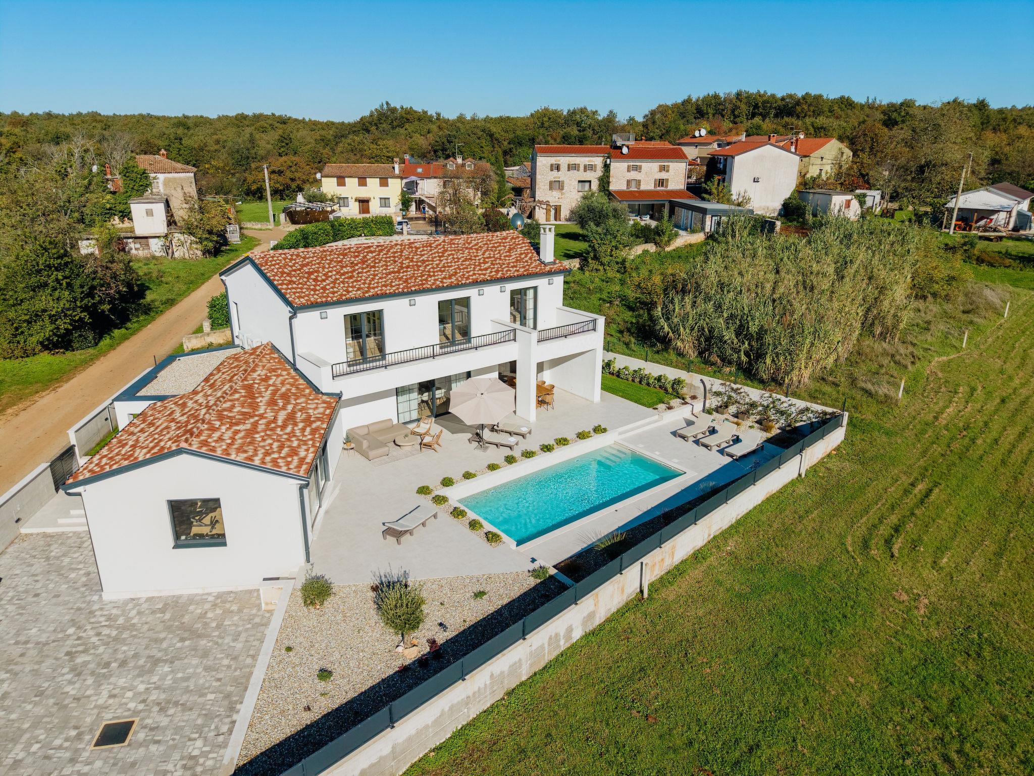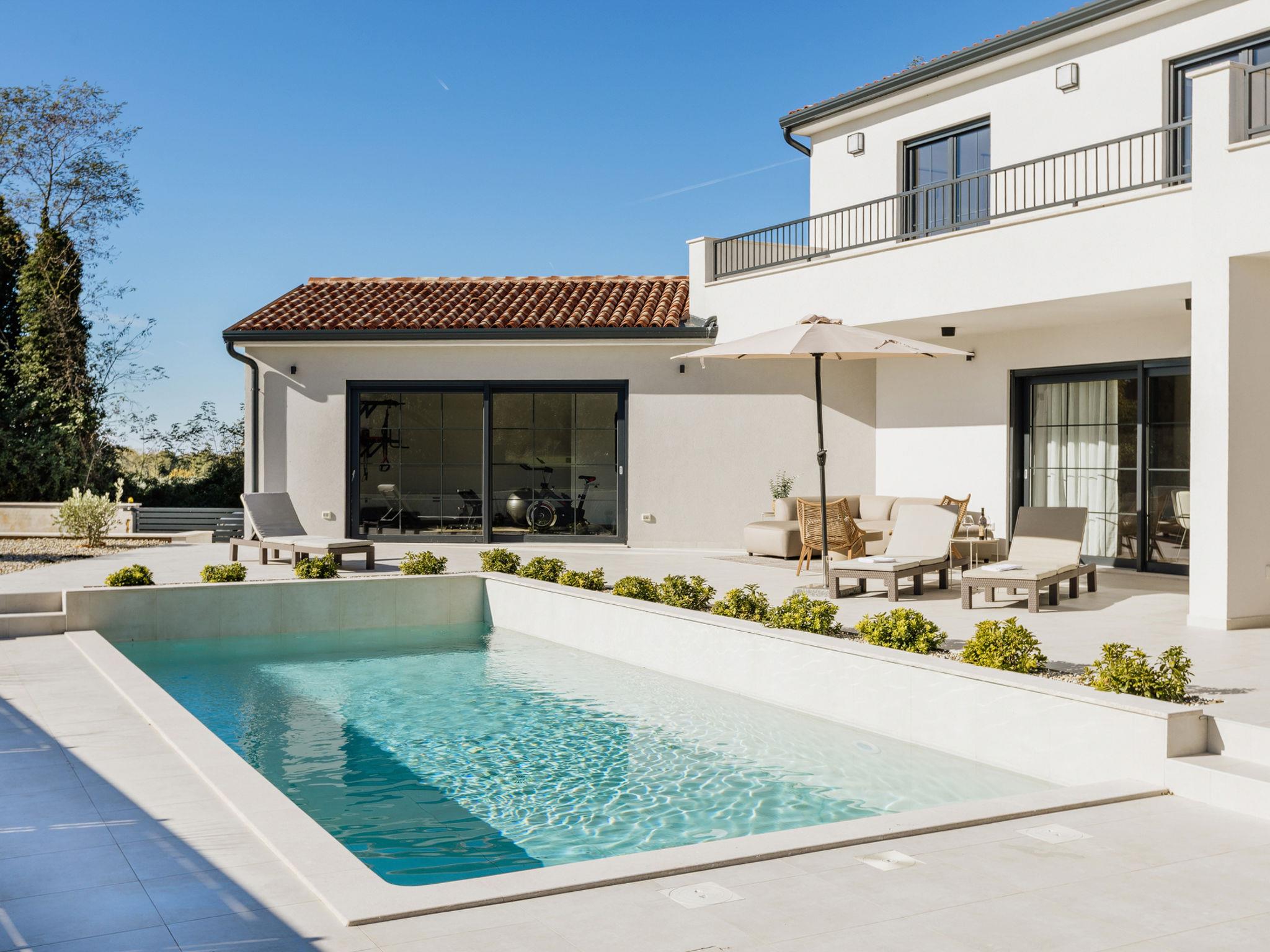 Beautiful, luxurious villa "Nina", 2 storeys, built in 2025. In the hamlet Pavici 1 km from the centre of Nova Vas, 3 km from the centre of Brtonigla, 7 km from the centre of Novigrad, in a quiet, sunny position, 8 km from the sea, 8 km from the beach. Private: property 500 m2 (fenced), garden with lawn, swimming pool angular (9 x 4 m, depth 145 cm, seasonal availability: 15.May. - 15.Sep.) with internal staircase. Outdoor shower, garden furniture, barbecue. In the house: internet access, washing machine. Parking (for 3 cars) at the house on the premises. Shop 1 km, supermarket 8 km, restaurant 1 km, bus stop 3.6 km, pebble beach 8 km, rocky beach 8 km. Walking paths from the house 500 m, cycle lane 550 m. Nearby attractions: Aquapark 2 km.