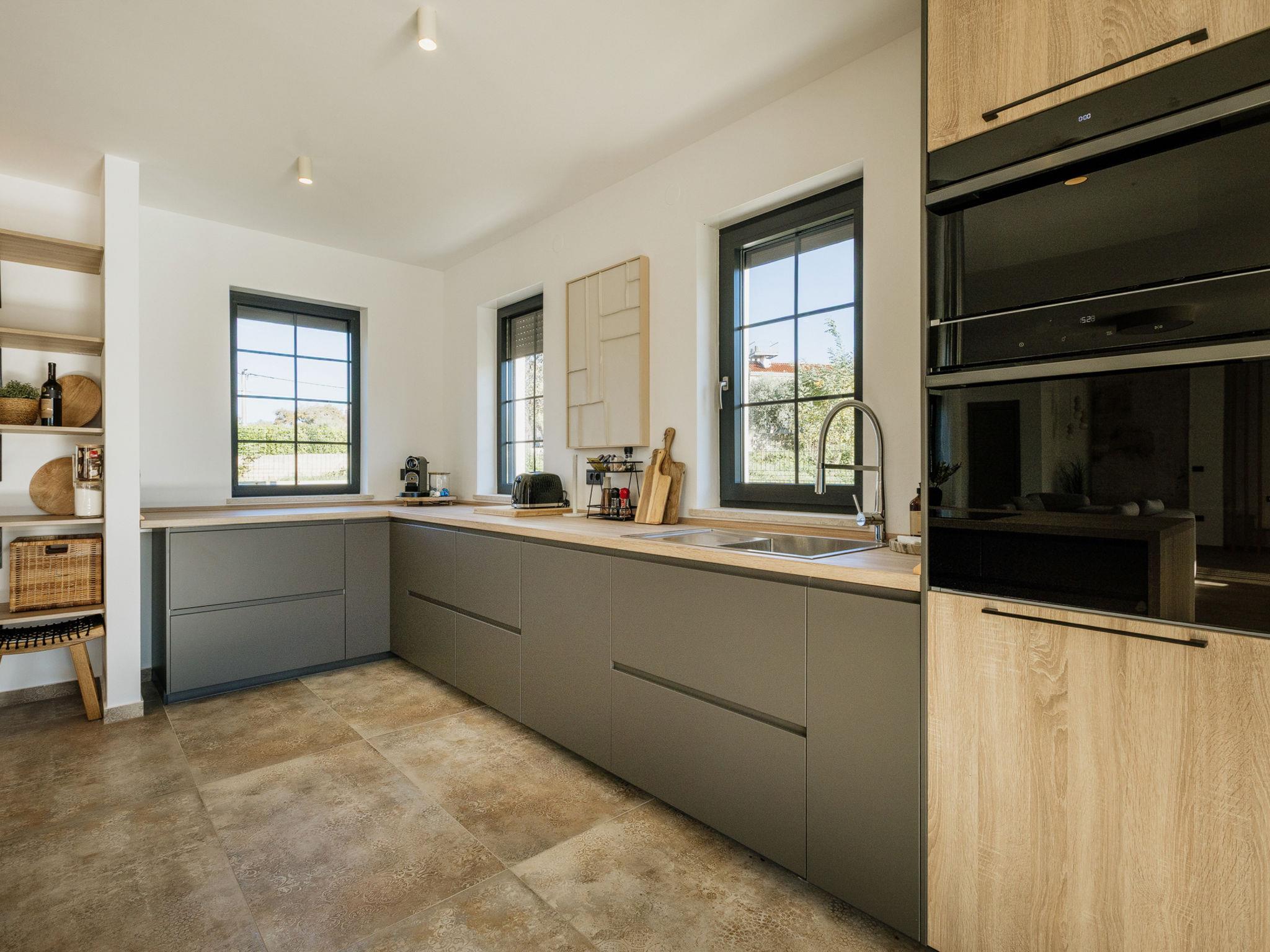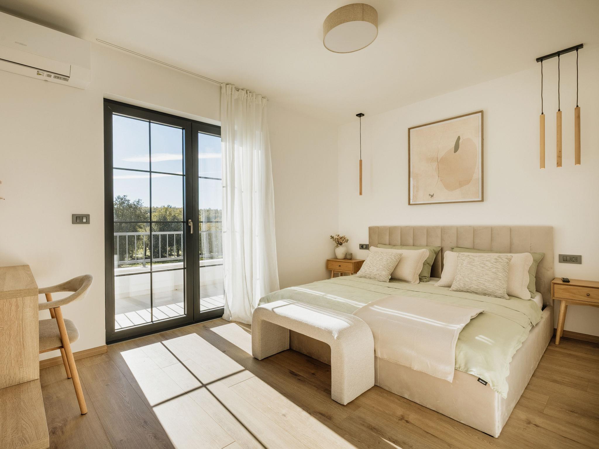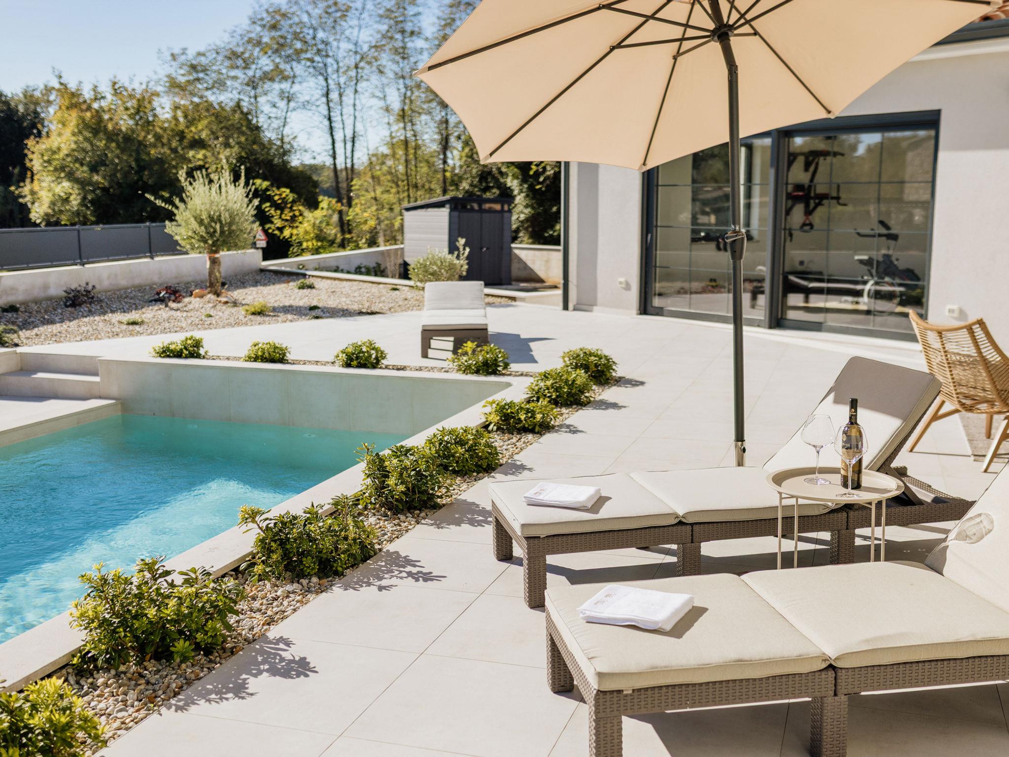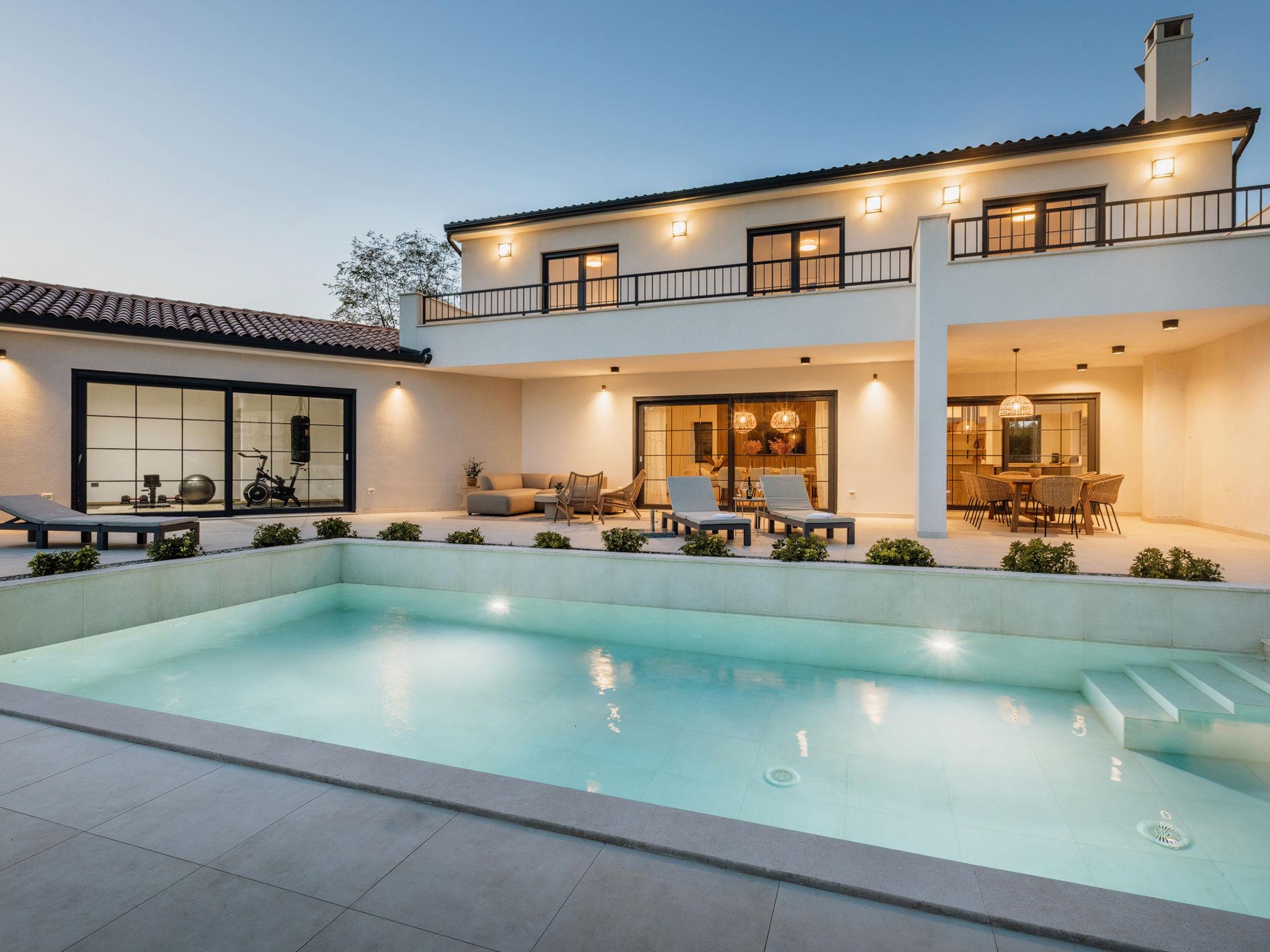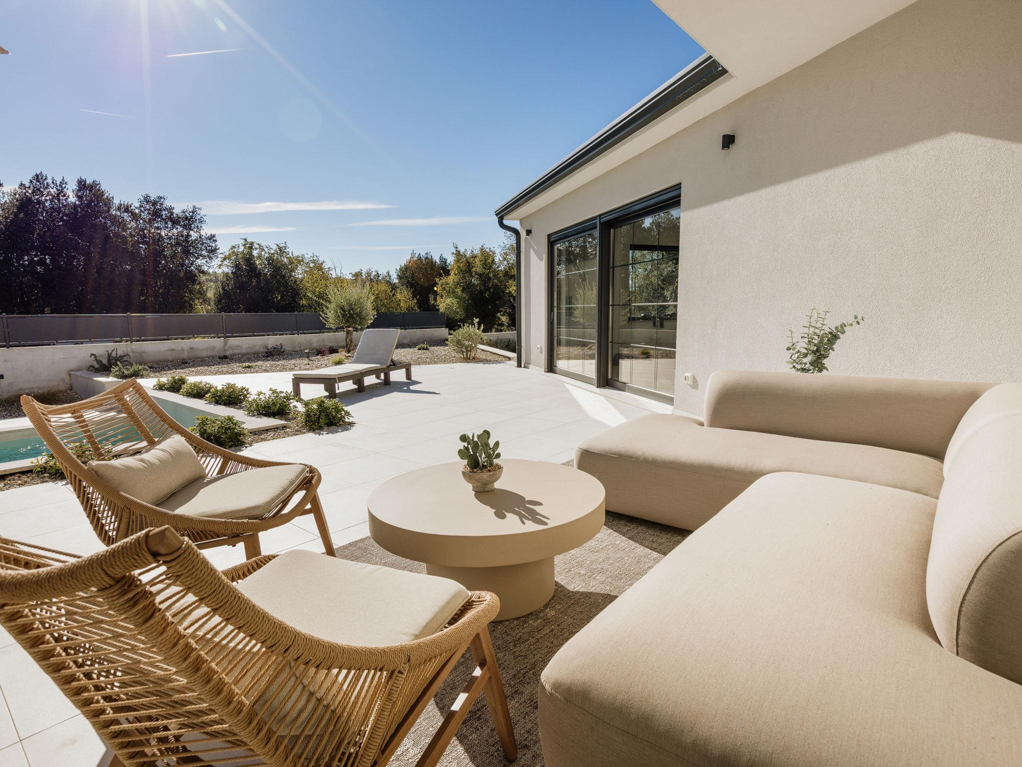 Beautiful, luxurious villa "Nina", 2 storeys, built in 2025. In the hamlet Pavici 1 km from the centre of Nova Vas, 3 km from the centre of Brtonigla, 7 km from the centre of Novigrad, in a quiet, sunny position, 8 km from the sea, 8 km from the beach. Private: property 500 m2 (fenced), garden with lawn, swimming pool angular (9 x 4 m, depth 145 cm, seasonal availability: 15.May. - 15.Sep.) with internal staircase. Outdoor shower, garden furniture, barbecue. In the house: internet access, washing machine. Parking (for 3 cars) at the house on the premises. Shop 1 km, supermarket 8 km, restaurant 1 km, bus stop 3.6 km, pebble beach 8 km, rocky beach 8 km. Walking paths from the house 500 m, cycle lane 550 m. Nearby attractions: Aquapark 2 km.