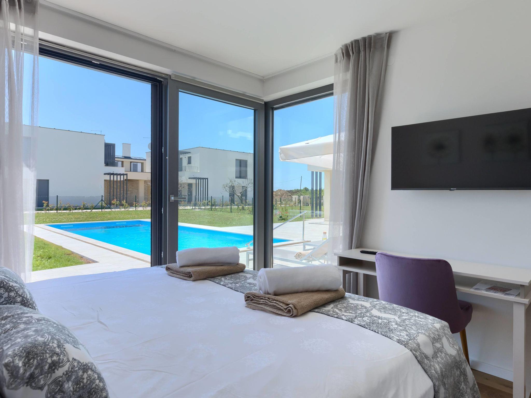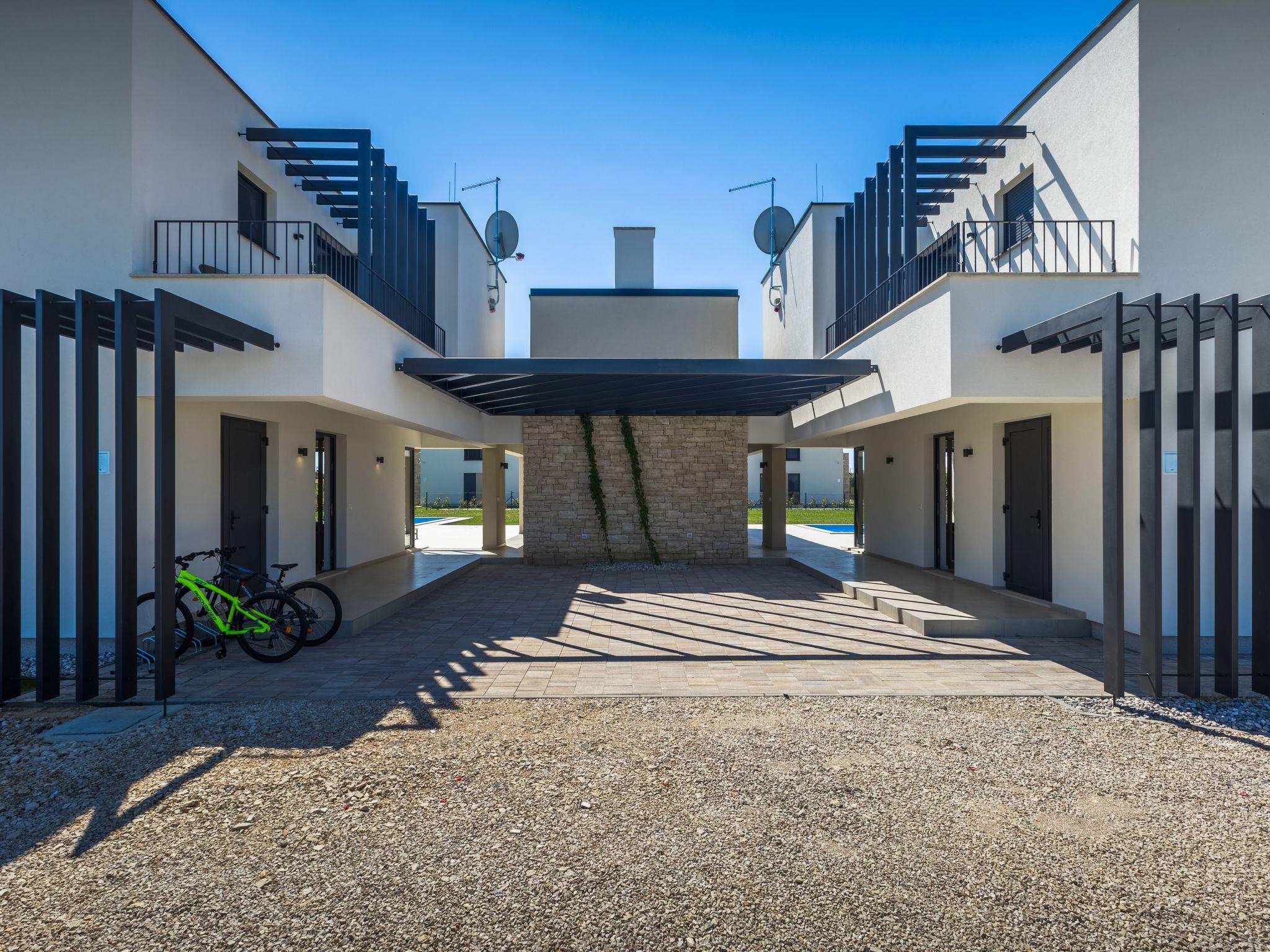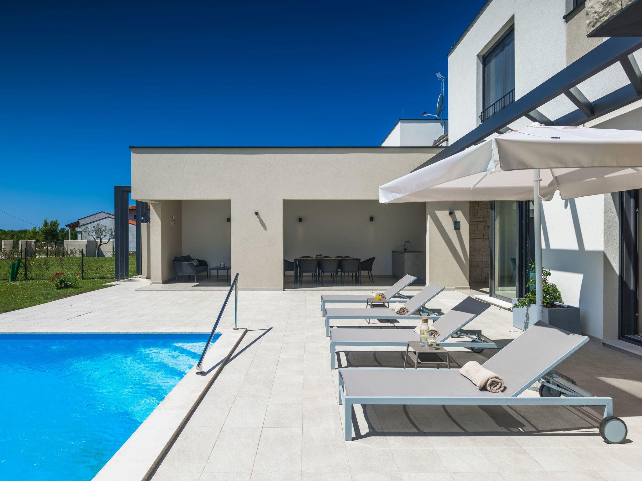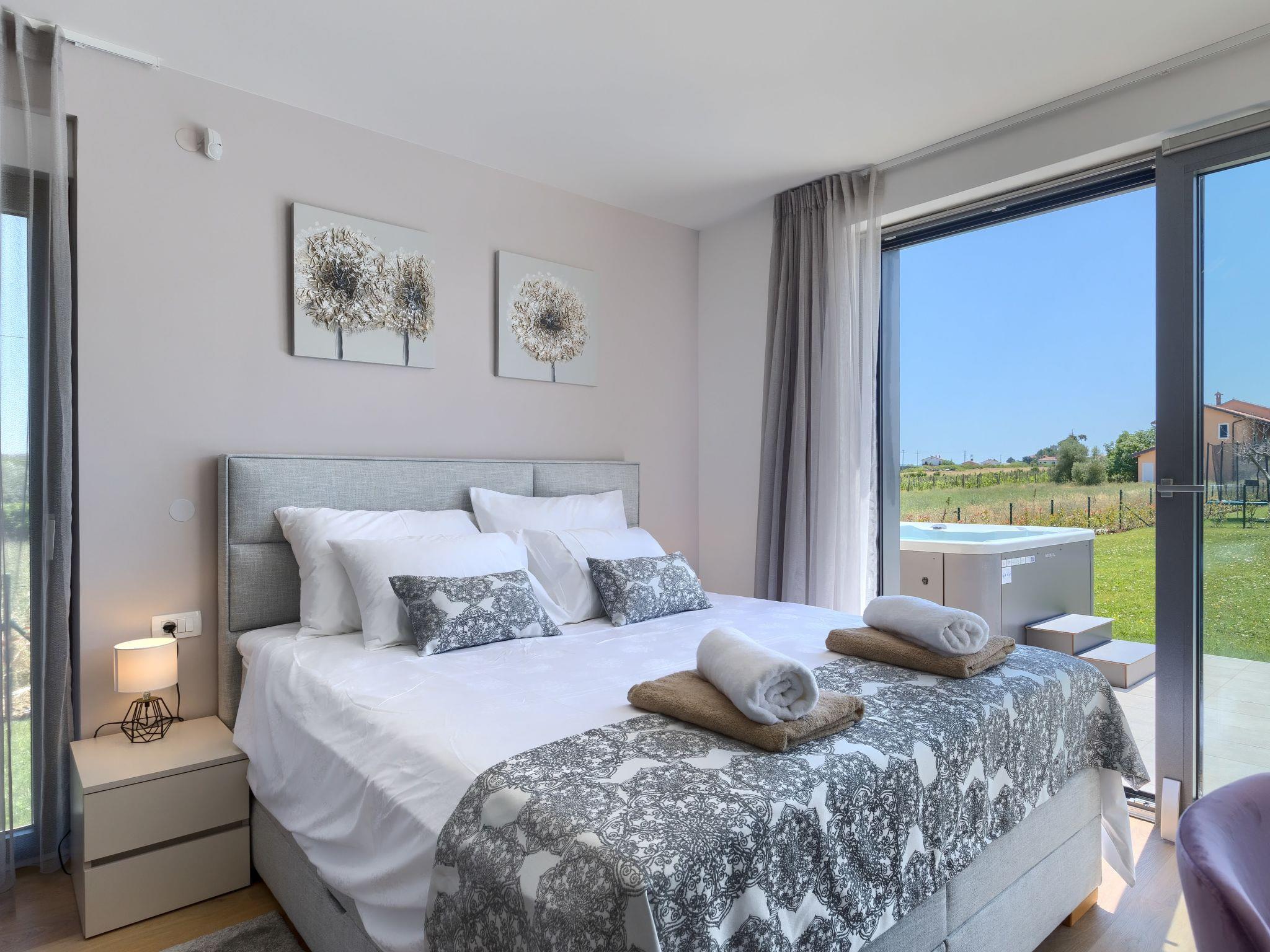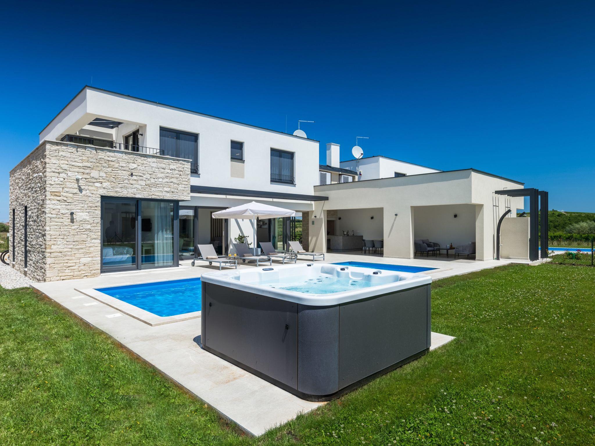 Luxurious villa "Bella & Chiara", 2 storeys, built in 2021. 1 km from the centre of Nova Vas, 2 km from the centre of Brtonigla, 10 km from the centre of Novigrad, 8.2 km from the sea. Private: property 1'800 m2 (fenced) with lawn, 2 swimming pools angular, heated (4 x 10 m, depth 135 cm, seasonal availability: 10.Apr. - 01.Nov.) with internal staircase. Outdoor shower, hot tub, badminton, terrace (10 m2), garden furniture, barbecue house. In the house: internet access, trampoline, washing machine, bicycles available. Available: bicycles (4), children's bicycles (2). Motor access (500 m via unmade road). Parking (for 6 cars) at the house on the premises. Shop 1.5 km, restaurant 650 m, bus stop 4 km, pebble beach 8.2 km. Walking paths from the house, cycle lane 100 m. Nearby attractions: Aquapark 2 km. Groups of teenagers on request only. Please note: airfield 20 km from the property. Swimming pool heated (extra). Video surveillance of the driveway and parking. The unit consists of 2 houses rented as one unit.
