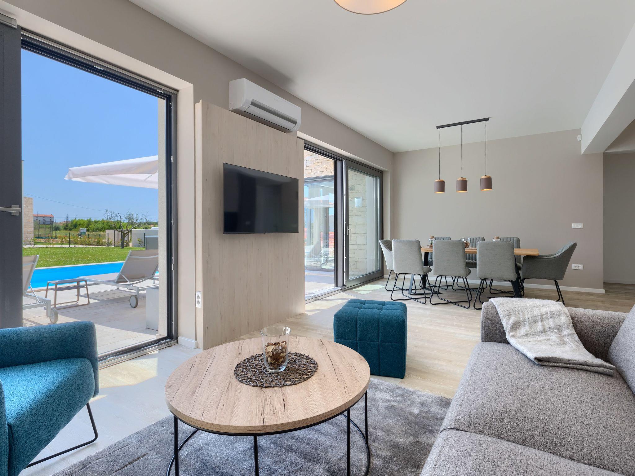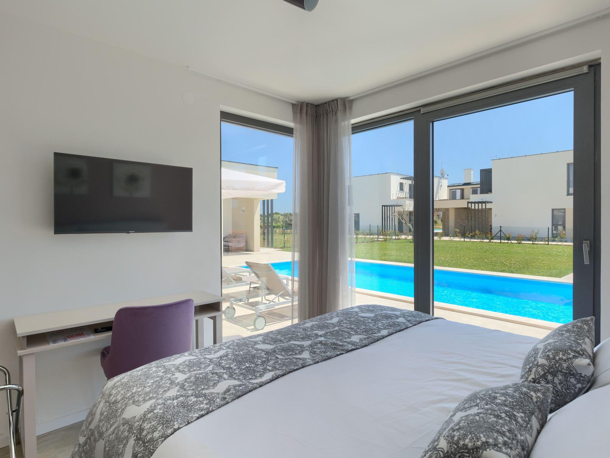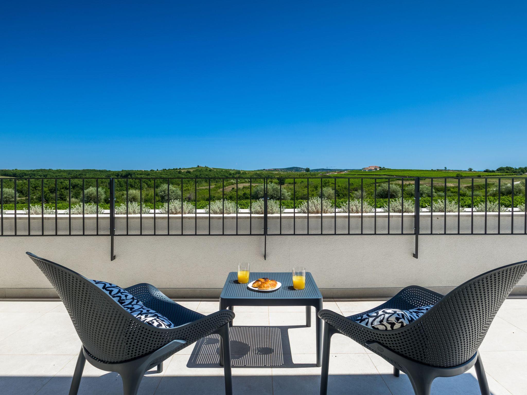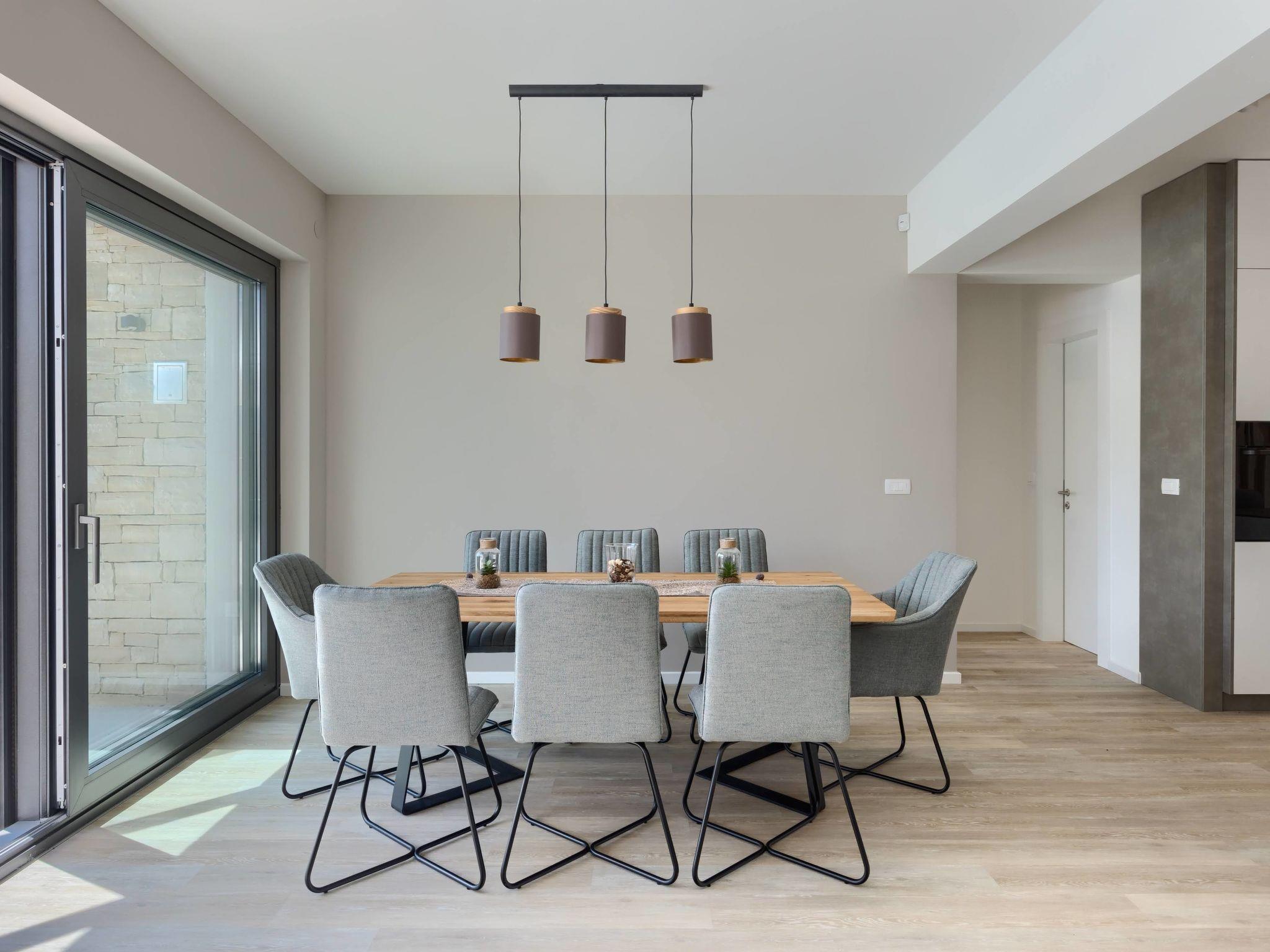 Luxurious villa "Bella & Chiara", 2 storeys, built in 2021. 1 km from the centre of Nova Vas, 2 km from the centre of Brtonigla, 10 km from the centre of Novigrad, 8.2 km from the sea. Private: property 1'800 m2 (fenced) with lawn, 2 swimming pools angular, heated (4 x 10 m, depth 135 cm, seasonal availability: 10.Apr. - 01.Nov.) with internal staircase. Outdoor shower, hot tub, badminton, terrace (10 m2), garden furniture, barbecue house. In the house: internet access, trampoline, washing machine, bicycles available. Available: bicycles (4), children's bicycles (2). Motor access (500 m via unmade road). Parking (for 6 cars) at the house on the premises. Shop 1.5 km, restaurant 650 m, bus stop 4 km, pebble beach 8.2 km. Walking paths from the house, cycle lane 100 m. Nearby attractions: Aquapark 2 km. Groups of teenagers on request only. Please note: airfield 20 km from the property. Swimming pool heated (extra). Video surveillance of the driveway and parking. The unit consists of 2 houses rented as one unit.